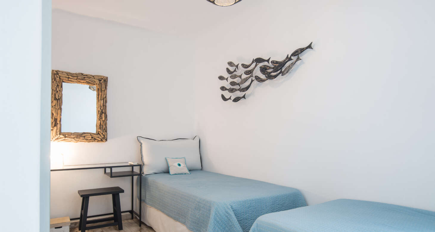 The villa’s design incorporates colors of blue and sand which perfectly match the surrounding environment and create a serene and calming atmosphere. The villa’s proximity to the beach, located right in front of the property, makes it an ideal vacation spot for beach lovers.