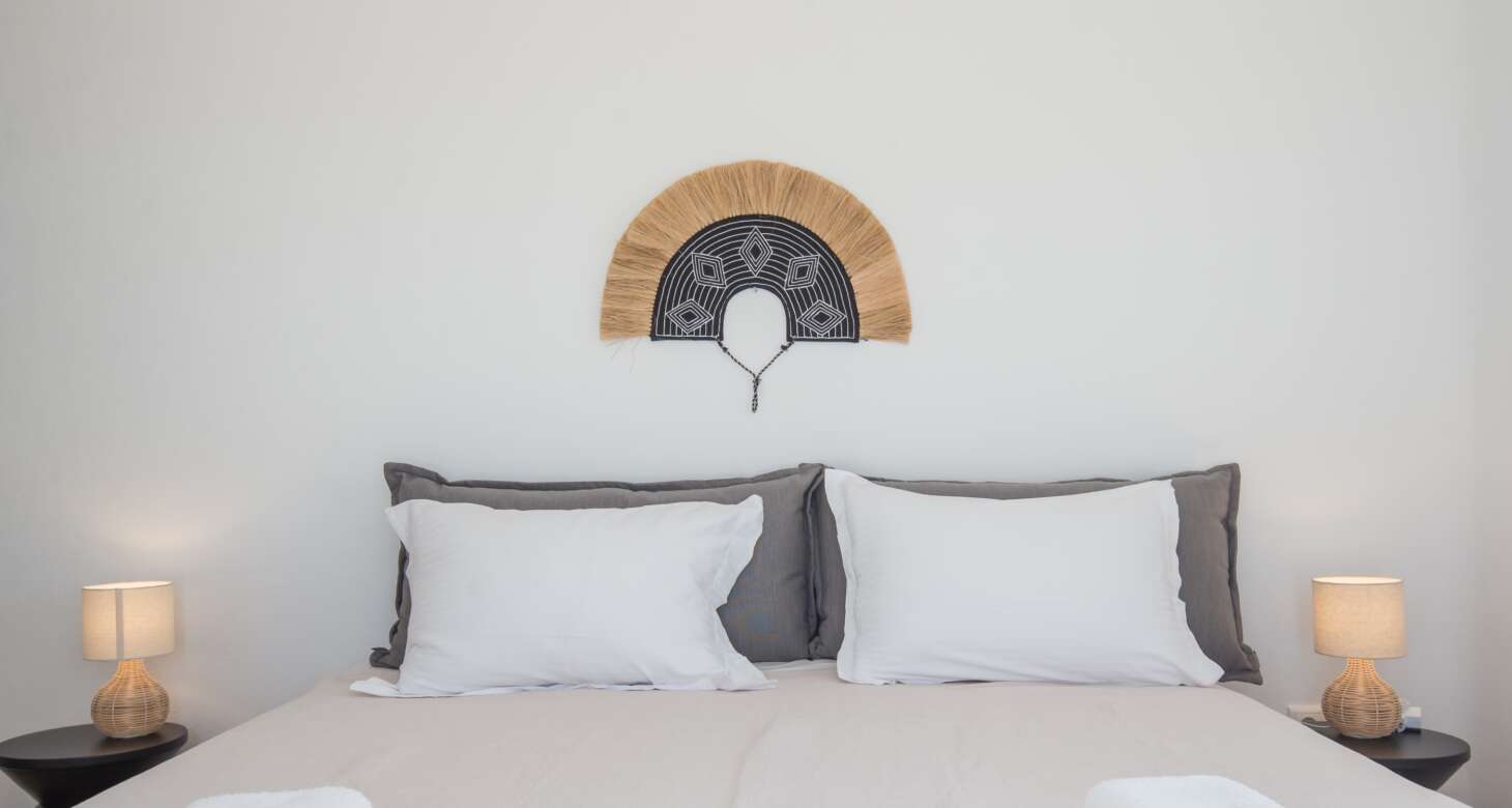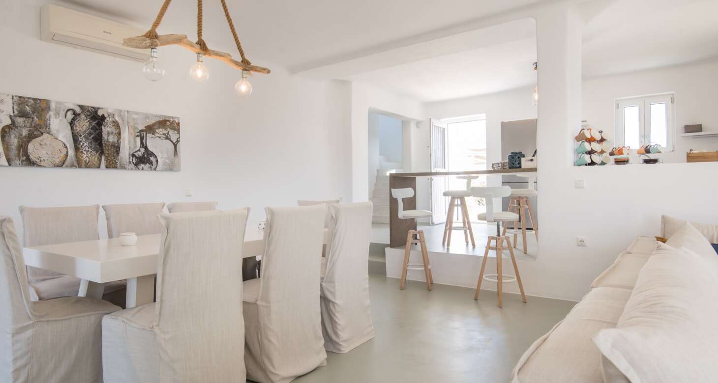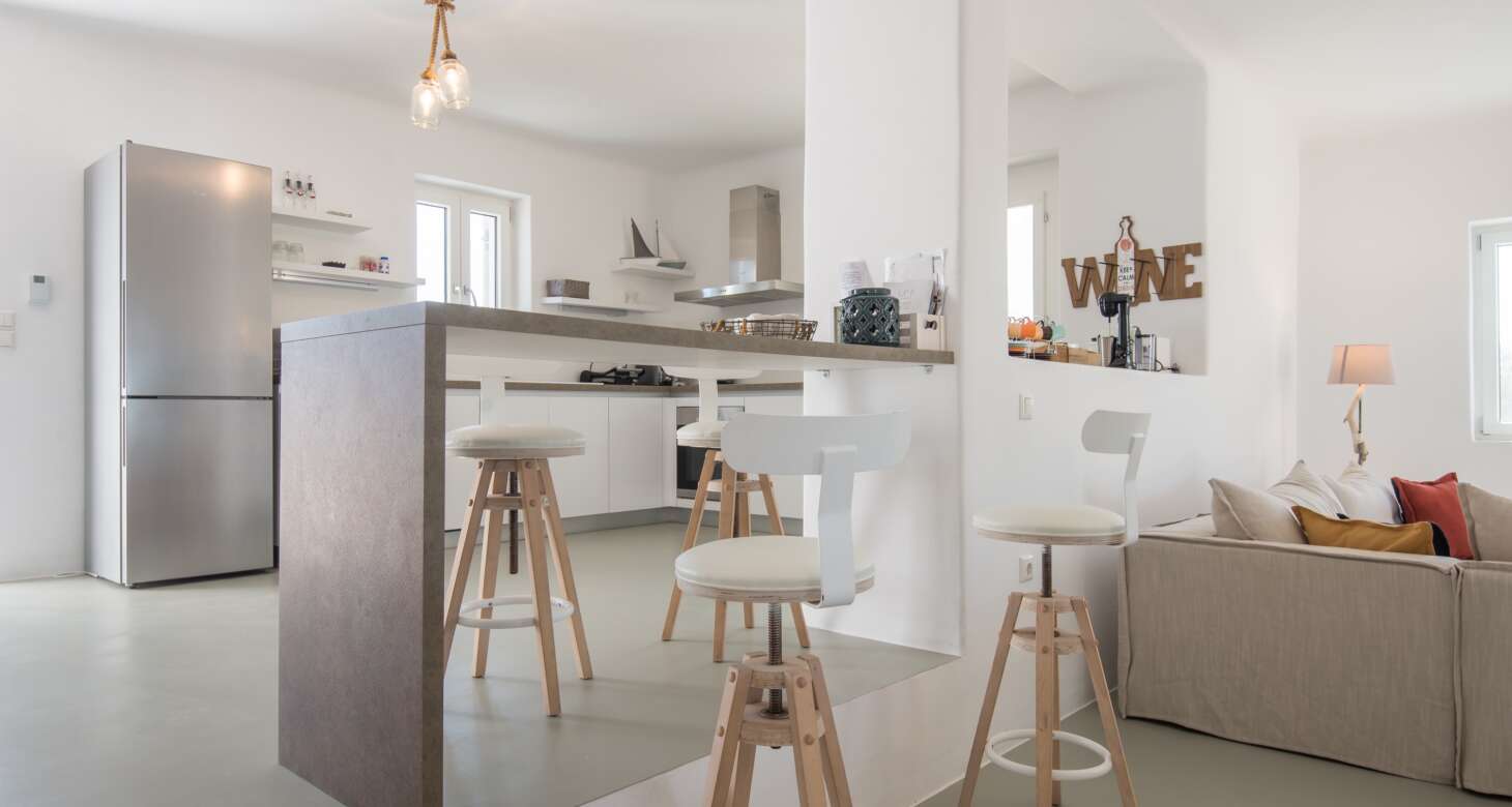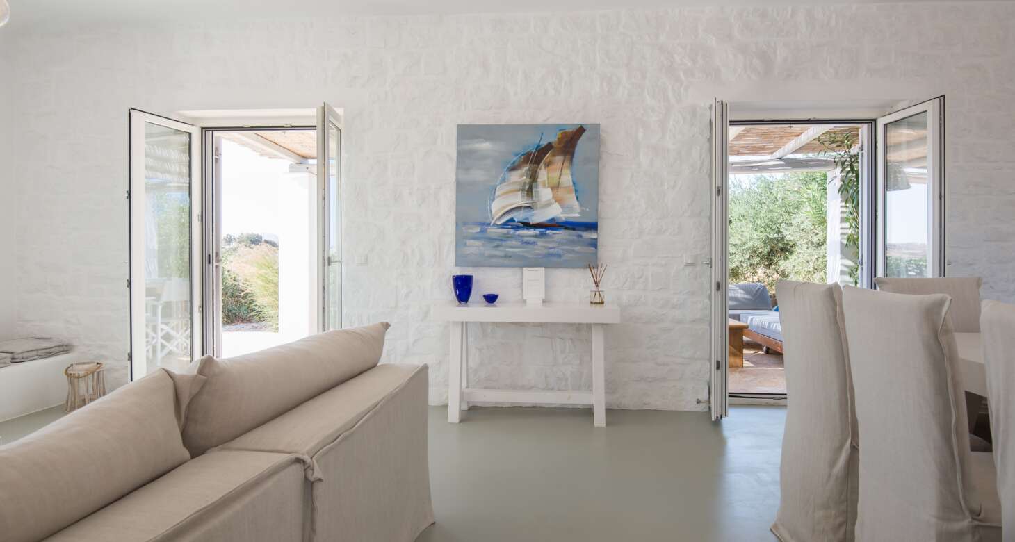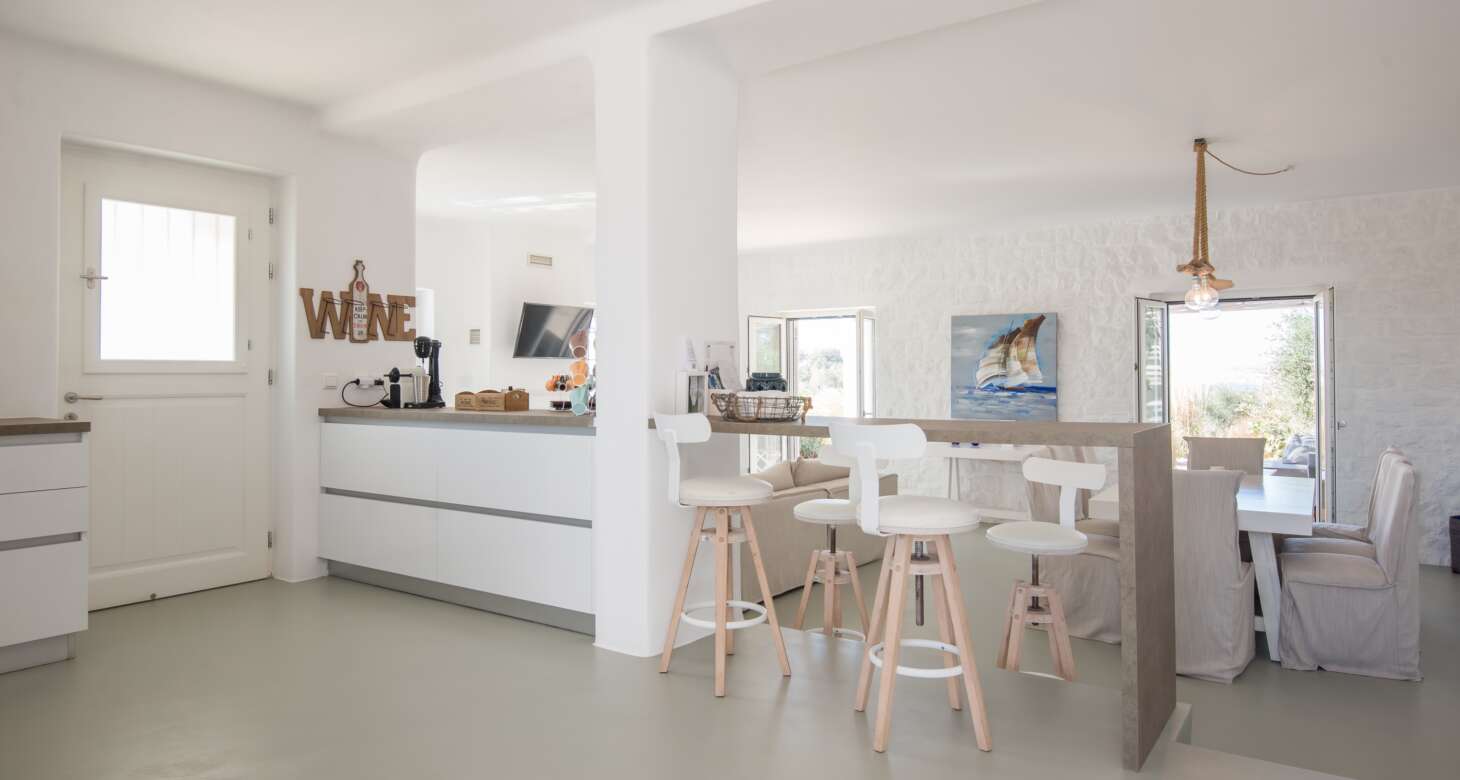 The interior of Villa Calma is characterized by its use of natural materials such as white-washed stone, cement, marble and wood. The color scheme is very natural with sand, beige and white tones creating a peaceful and calming atmosphere. The villa’s whitewashed walls perfectly blend modern and traditional island style.