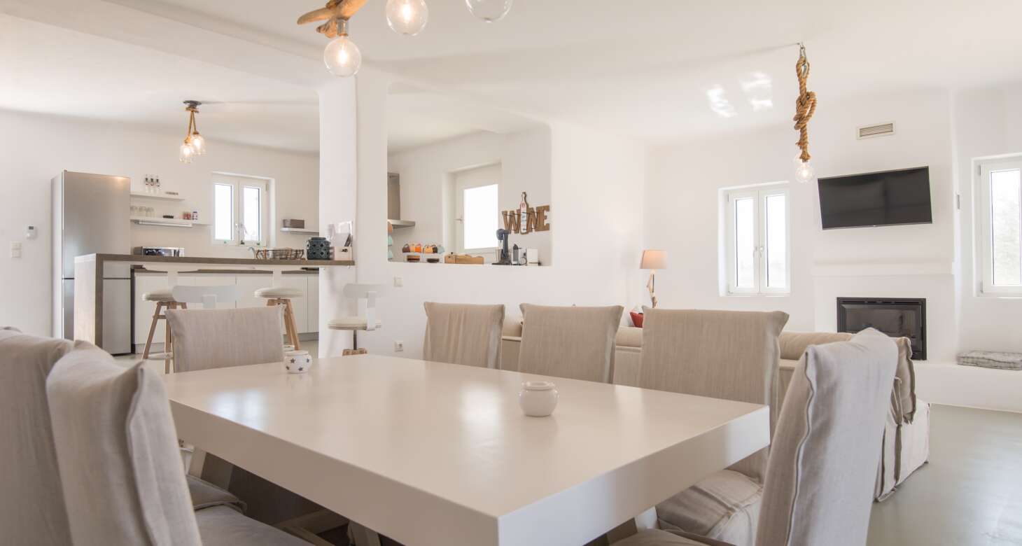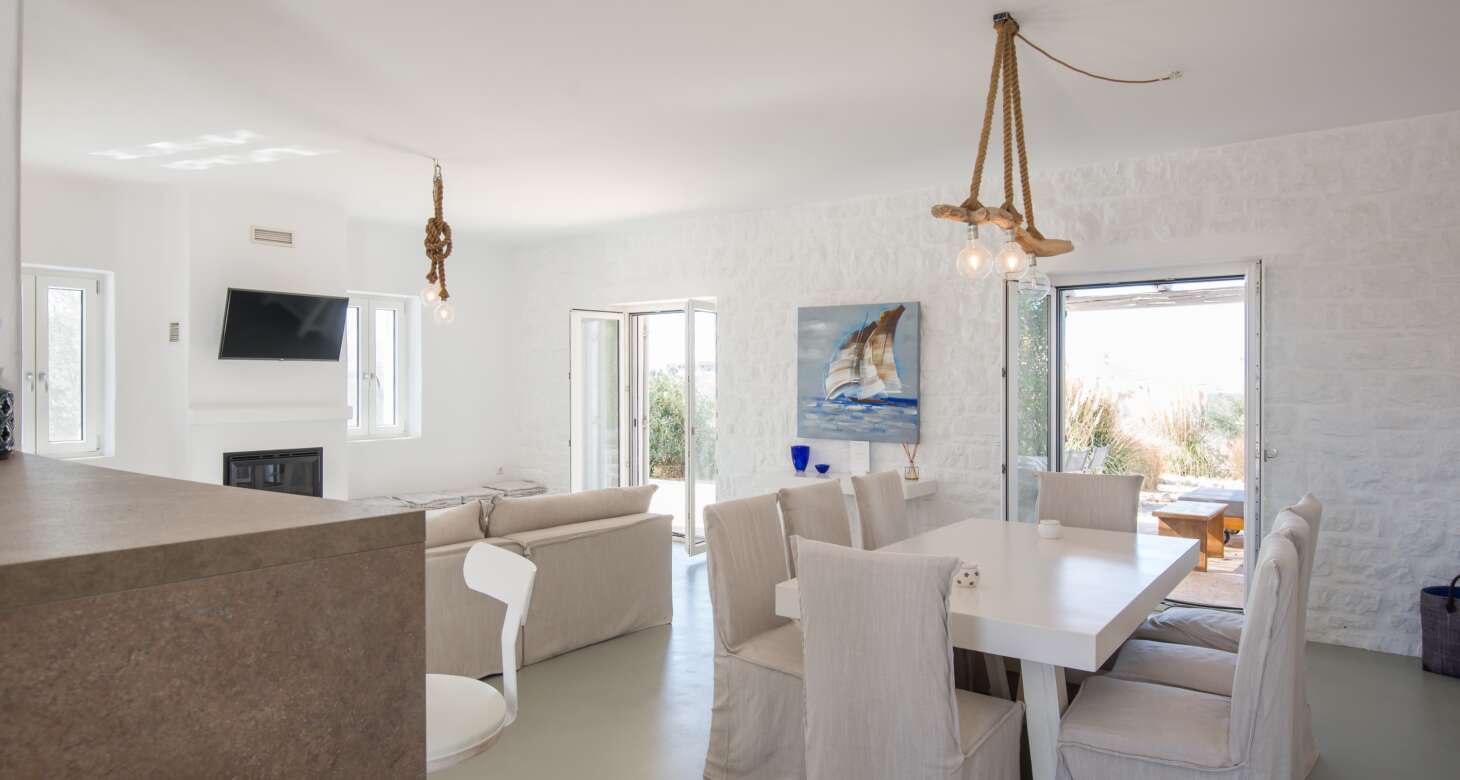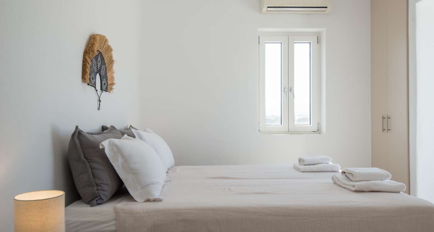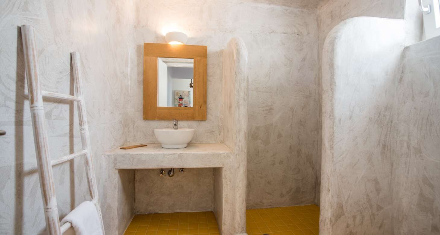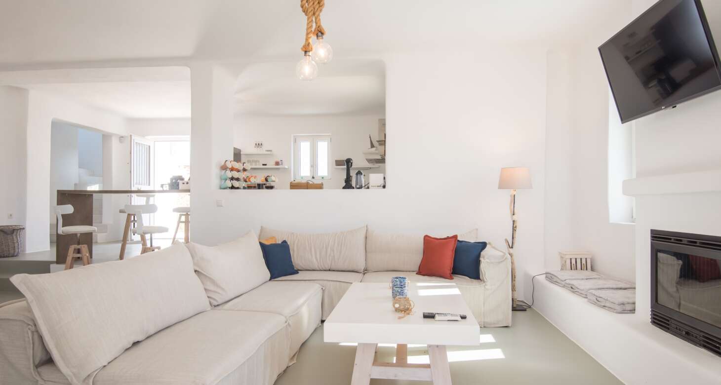 The interior of Villa Calma is characterized by its use of natural materials such as white-washed stone, cement, marble and wood. The color scheme is very natural with sand, beige and white tones creating a peaceful and calming atmosphere. The villa’s whitewashed walls perfectly blend modern and traditional island style.