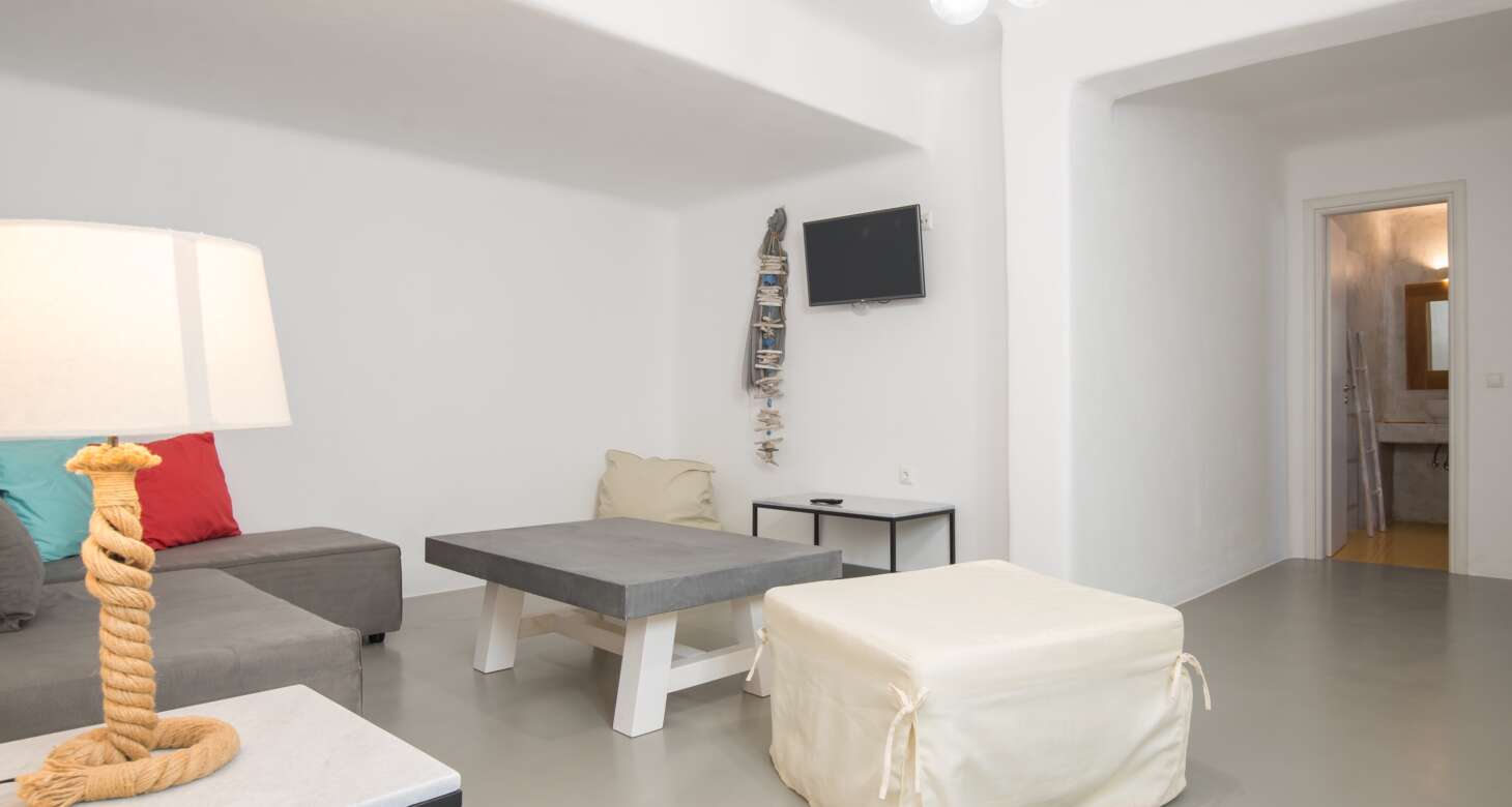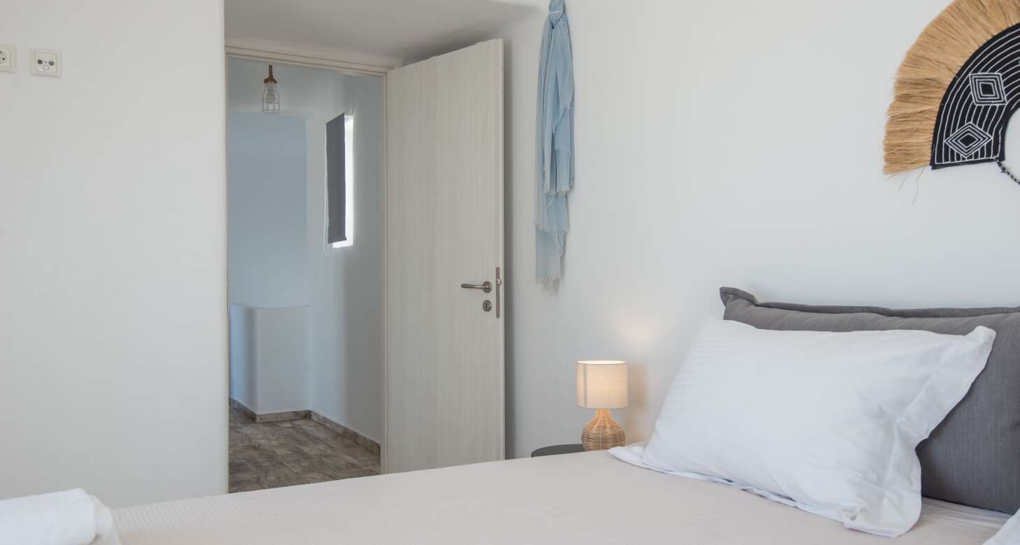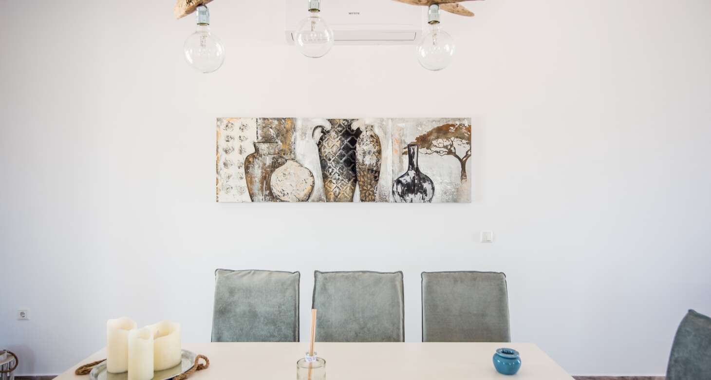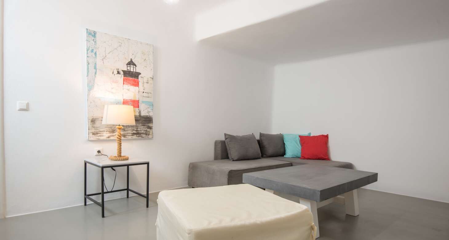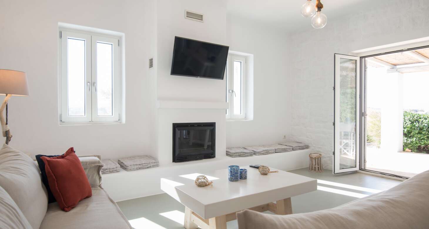 The interior of Villa Calma is characterized by its use of natural materials such as white-washed stone, cement, marble and wood. The color scheme is very natural with sand, beige and white tones creating a peaceful and calming atmosphere. The villa’s whitewashed walls perfectly blend modern and traditional island style.