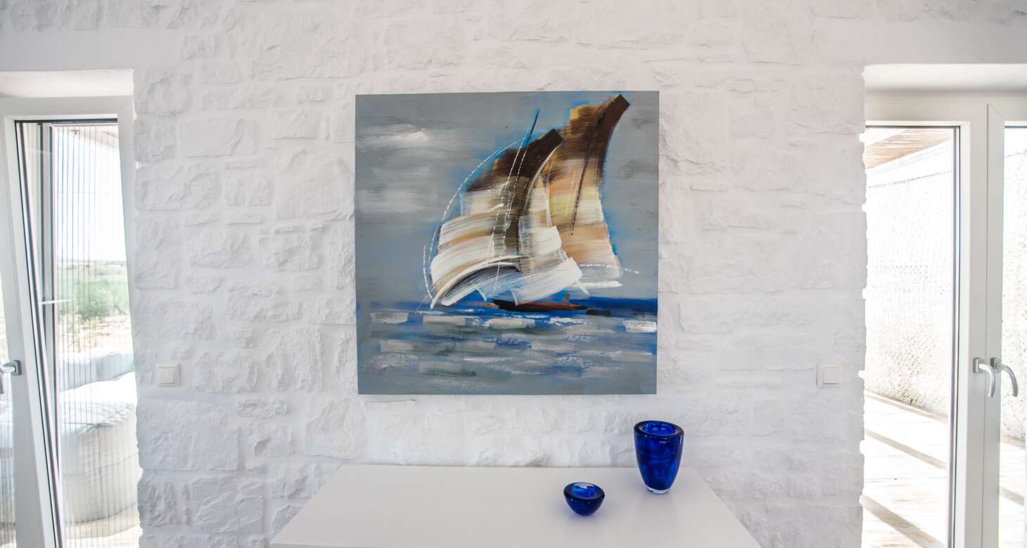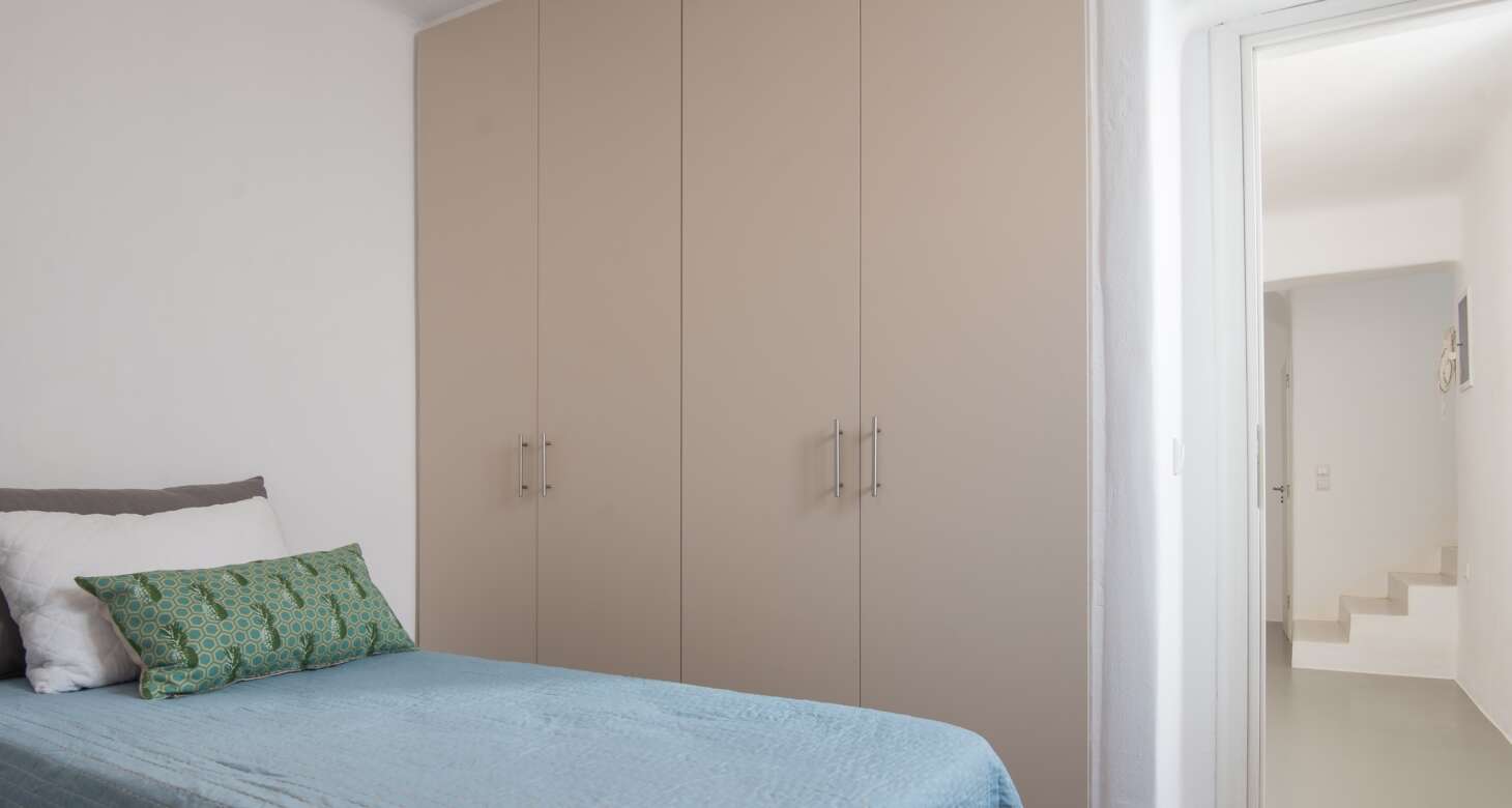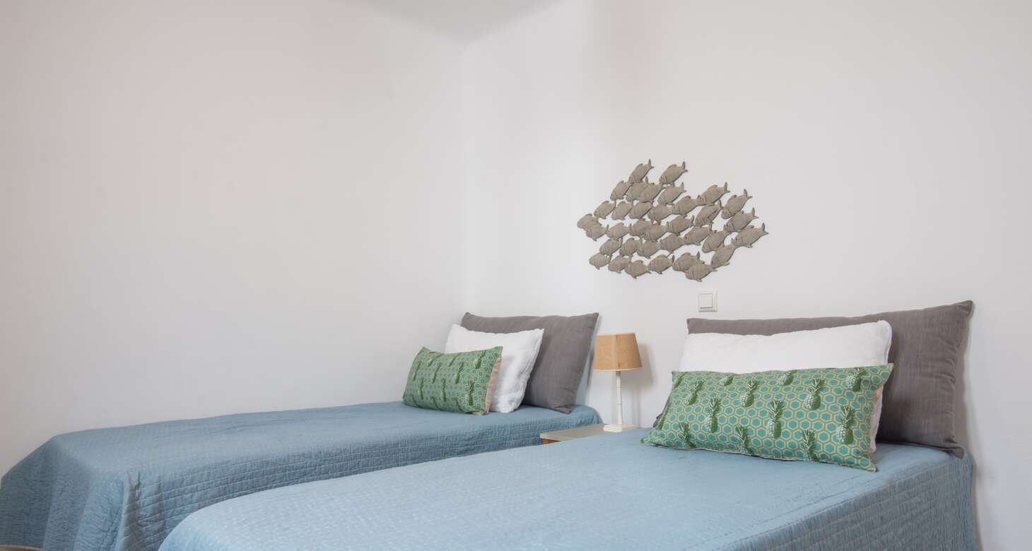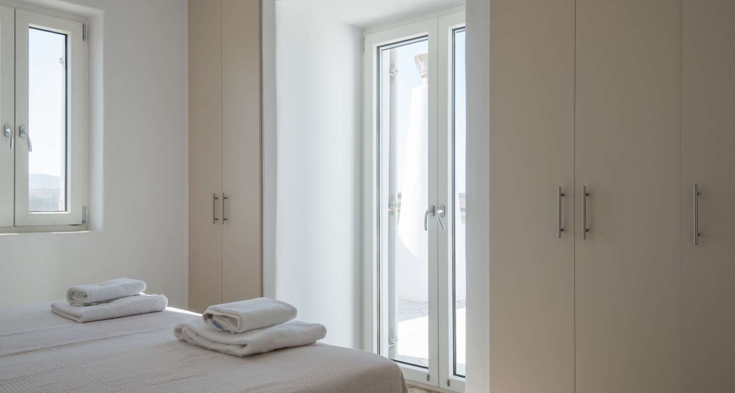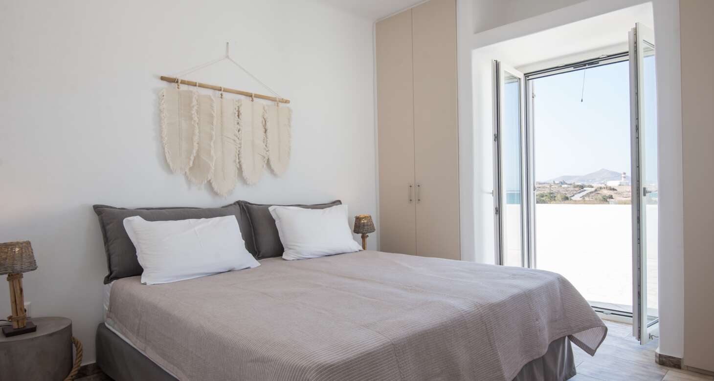 The interior of Villa Calma is characterized by its use of natural materials such as white-washed stone, cement, marble and wood. The color scheme is very natural with sand, beige and white tones creating a peaceful and calming atmosphere. The villa’s whitewashed walls perfectly blend modern and traditional island style.