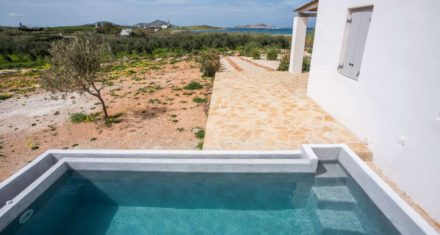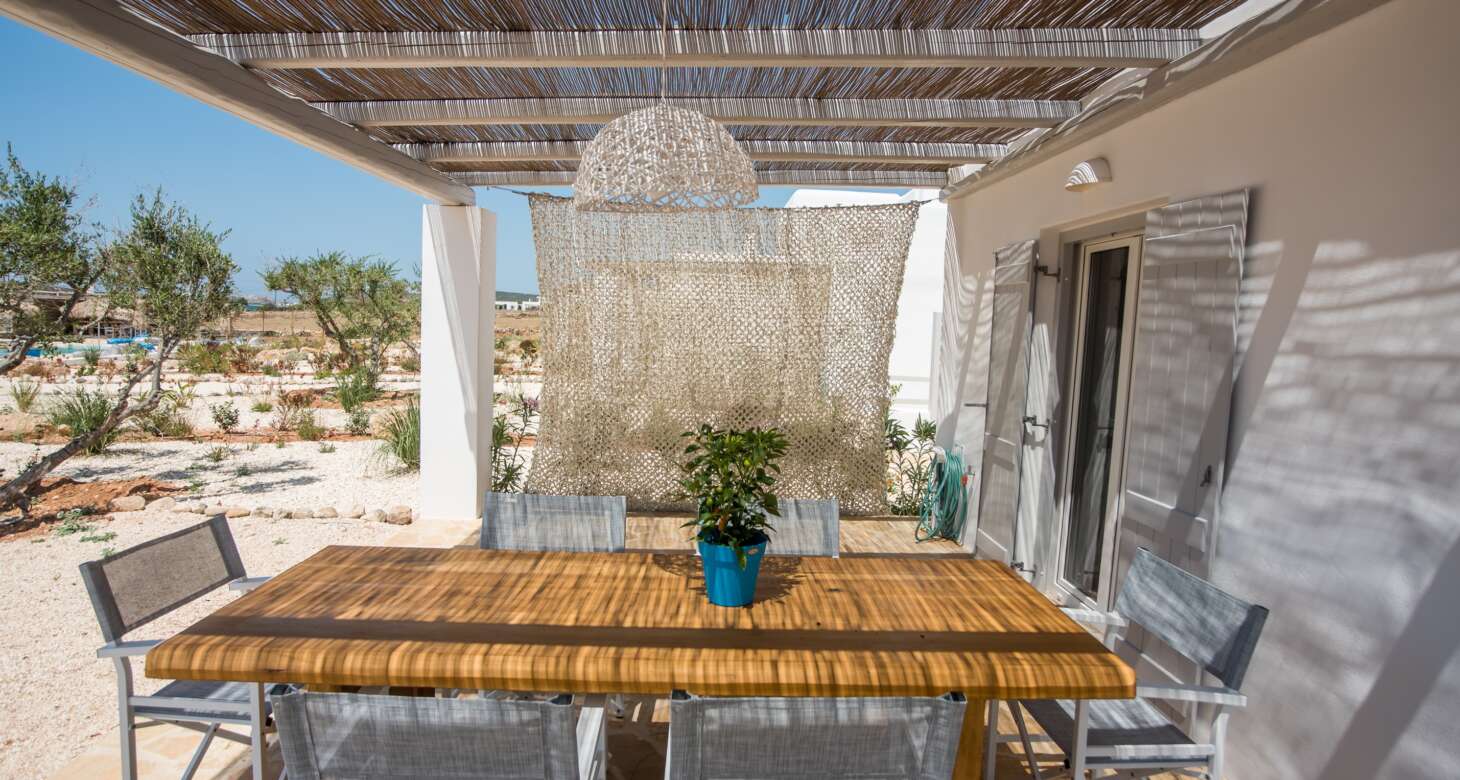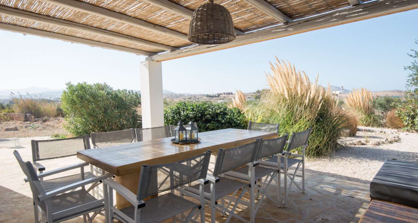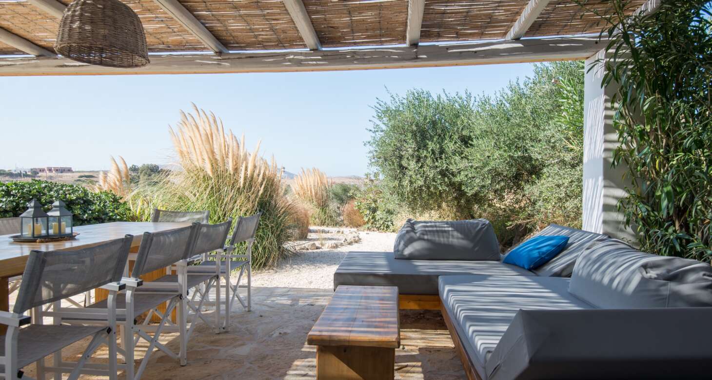 From the villa you can enjoy breathtaking views of the olive grove and the sea with lush bushes and natural elements all around. The outdoor area features a shaded dining table with a lounge area nestled in the trees creating a bright and airy space with stunning views.