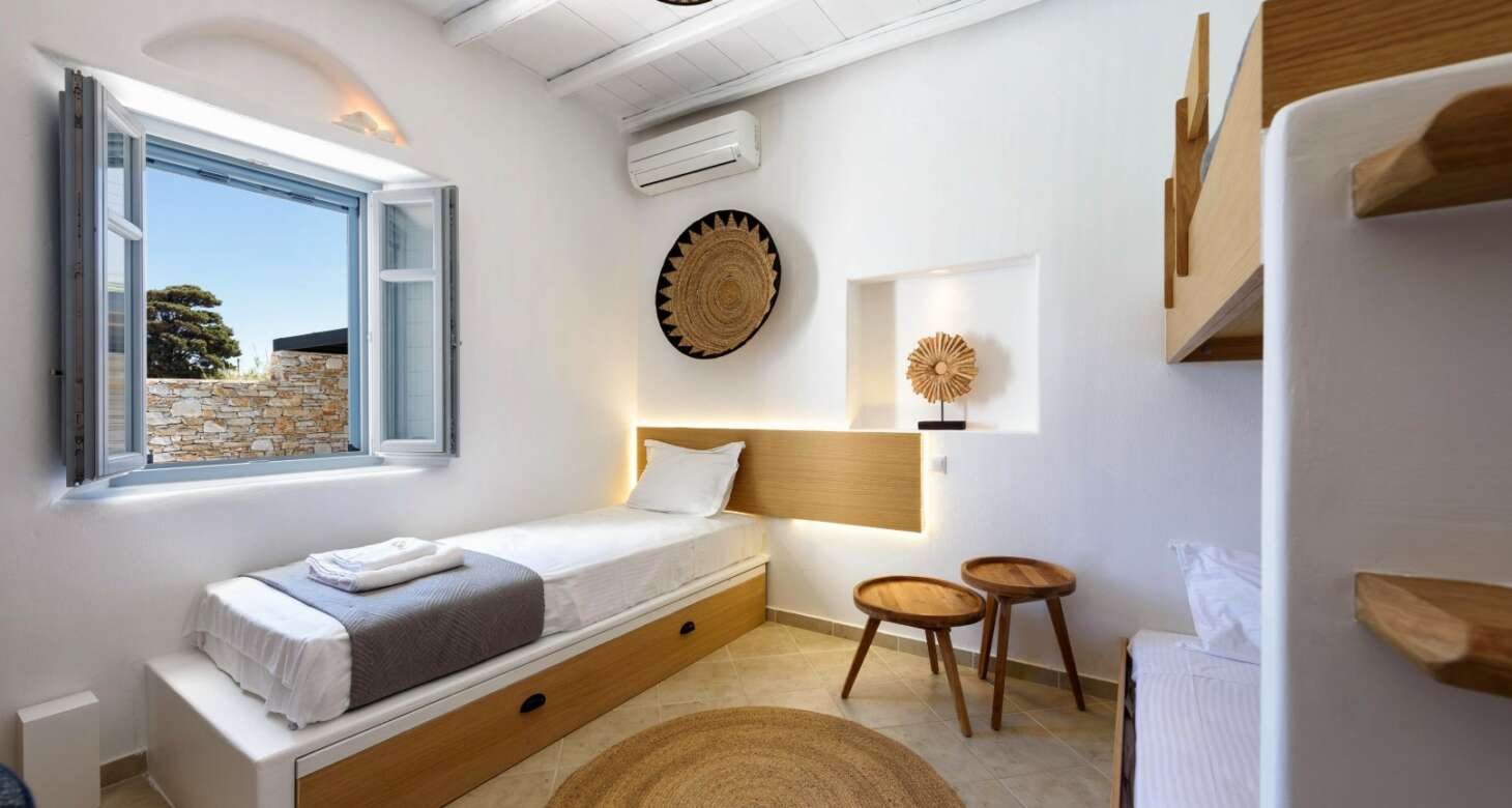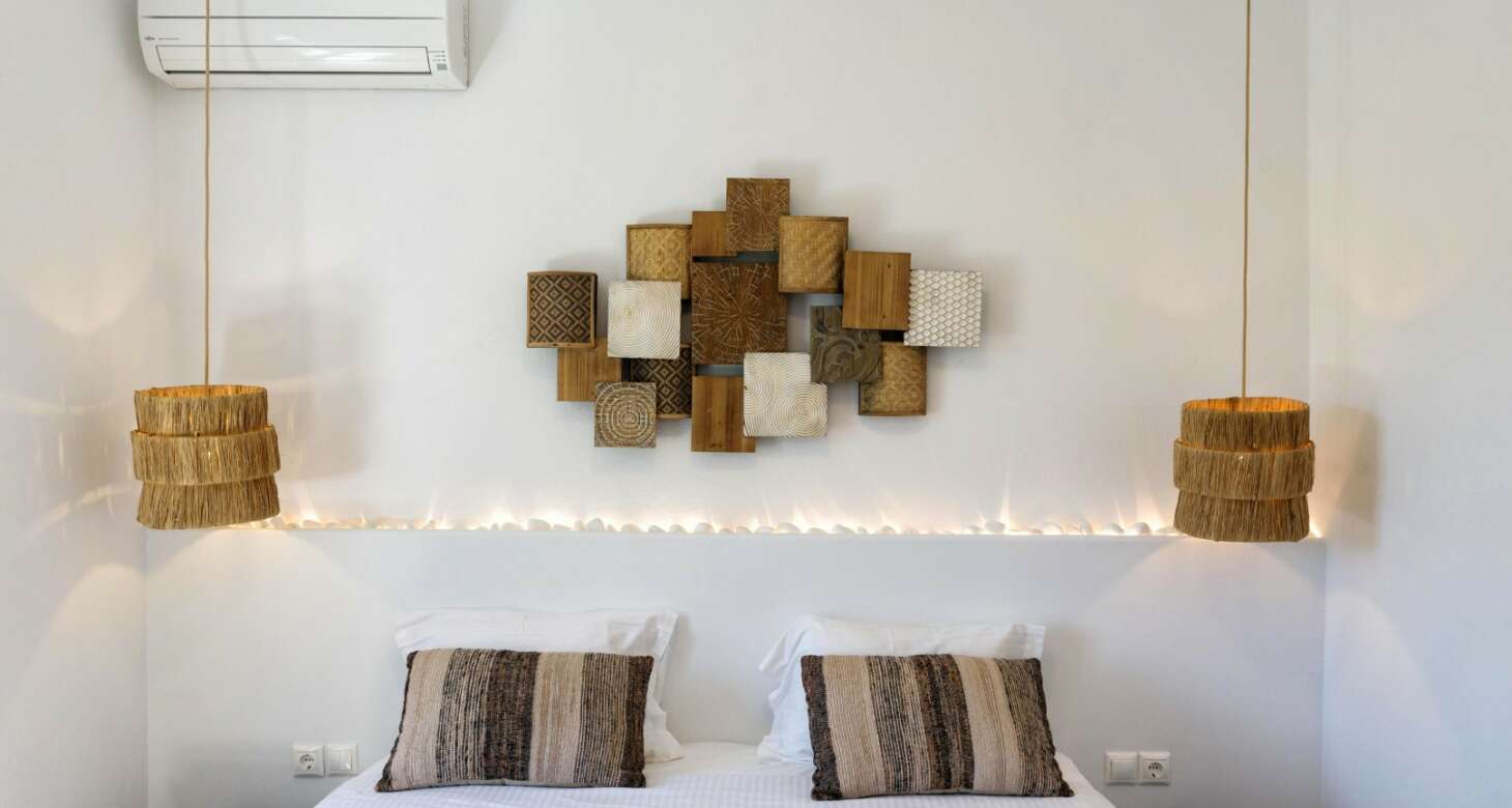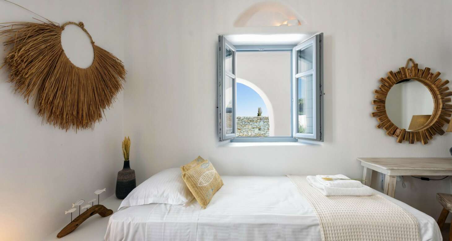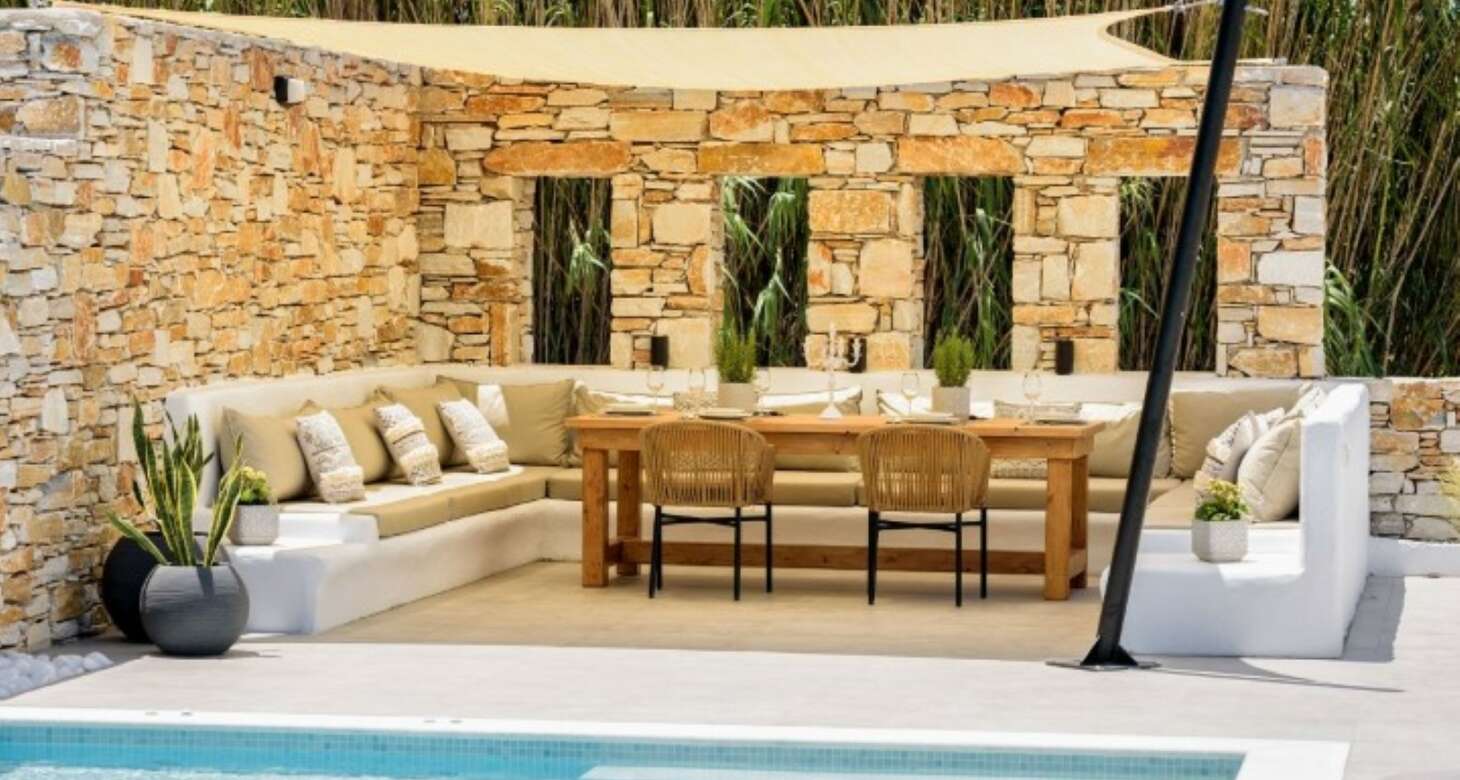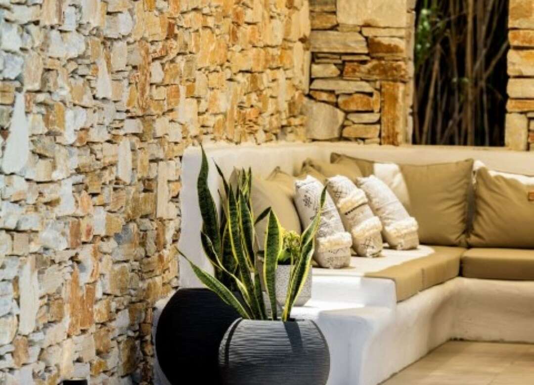 Villa Antheia I in Dryos is a beautiful property that combines boho style with traditional island details in its decoration. The villa features natural wood elements, black accents, and other natural materials that create a cozy and welcoming atmosphere. The white and red stone used in the external walls give the villa an authentic Greek island feel.
