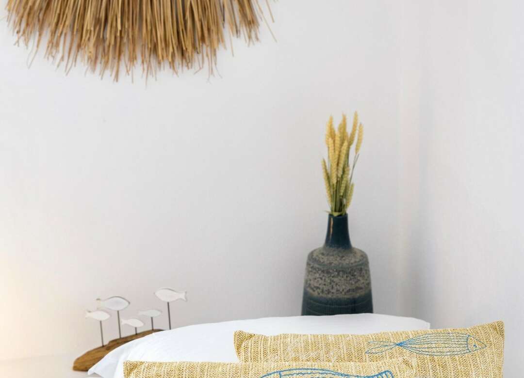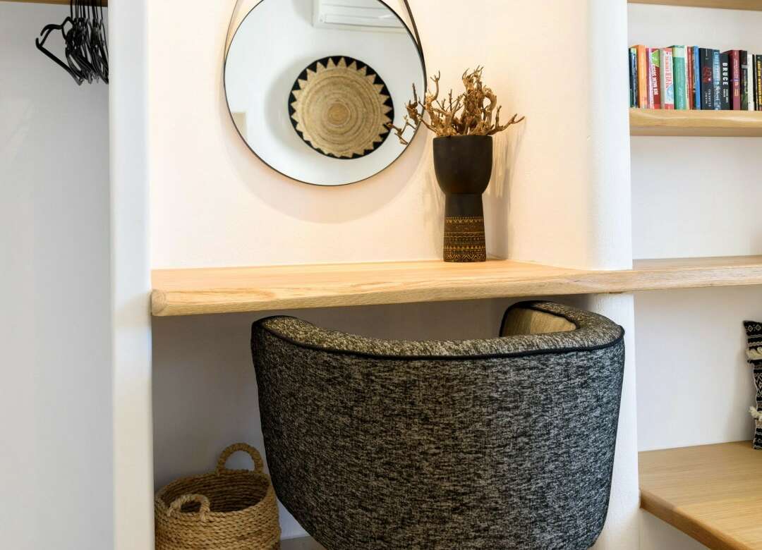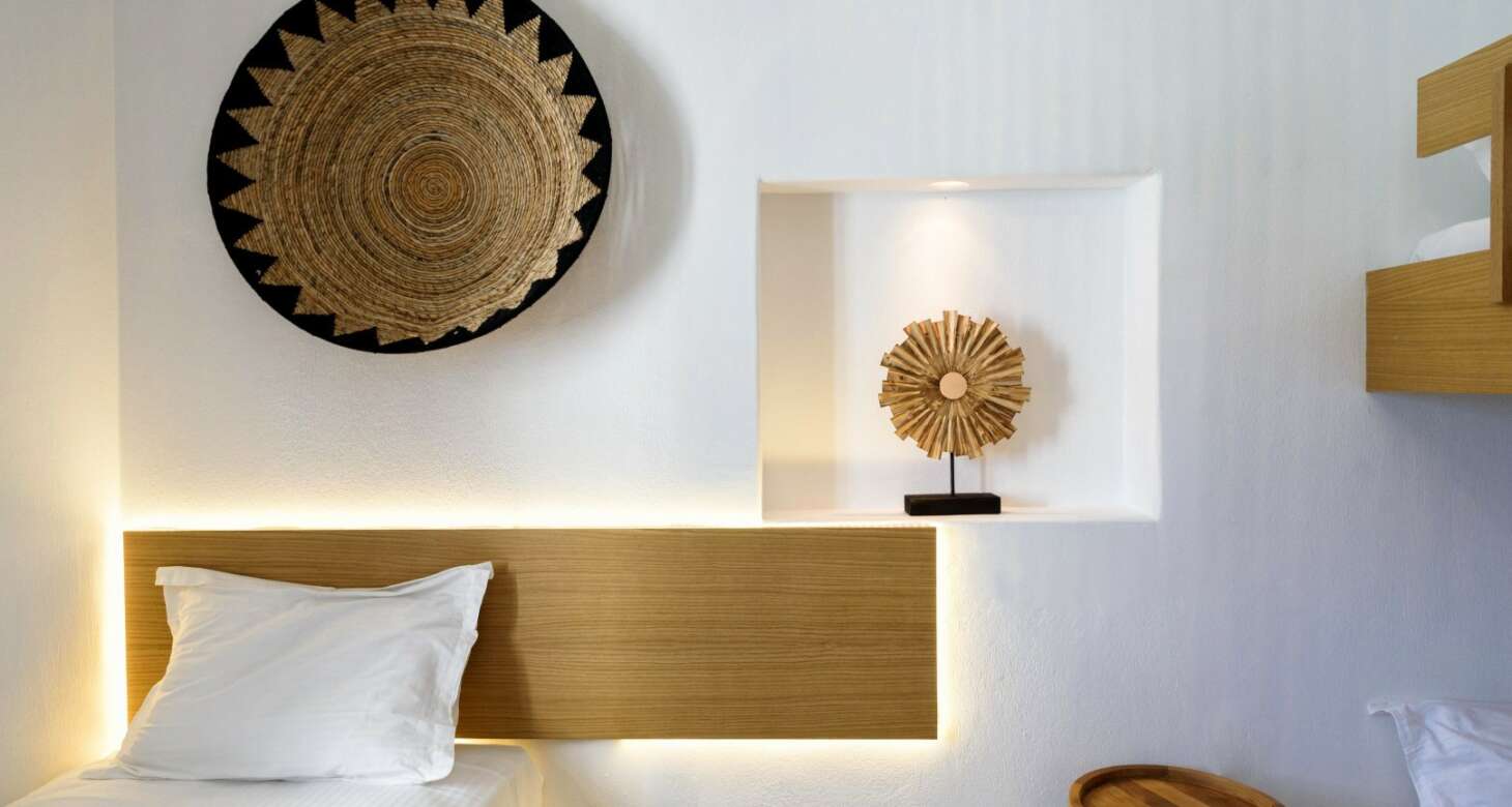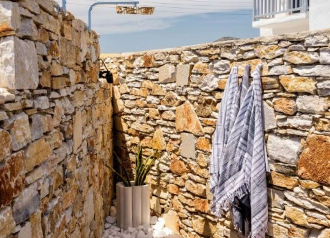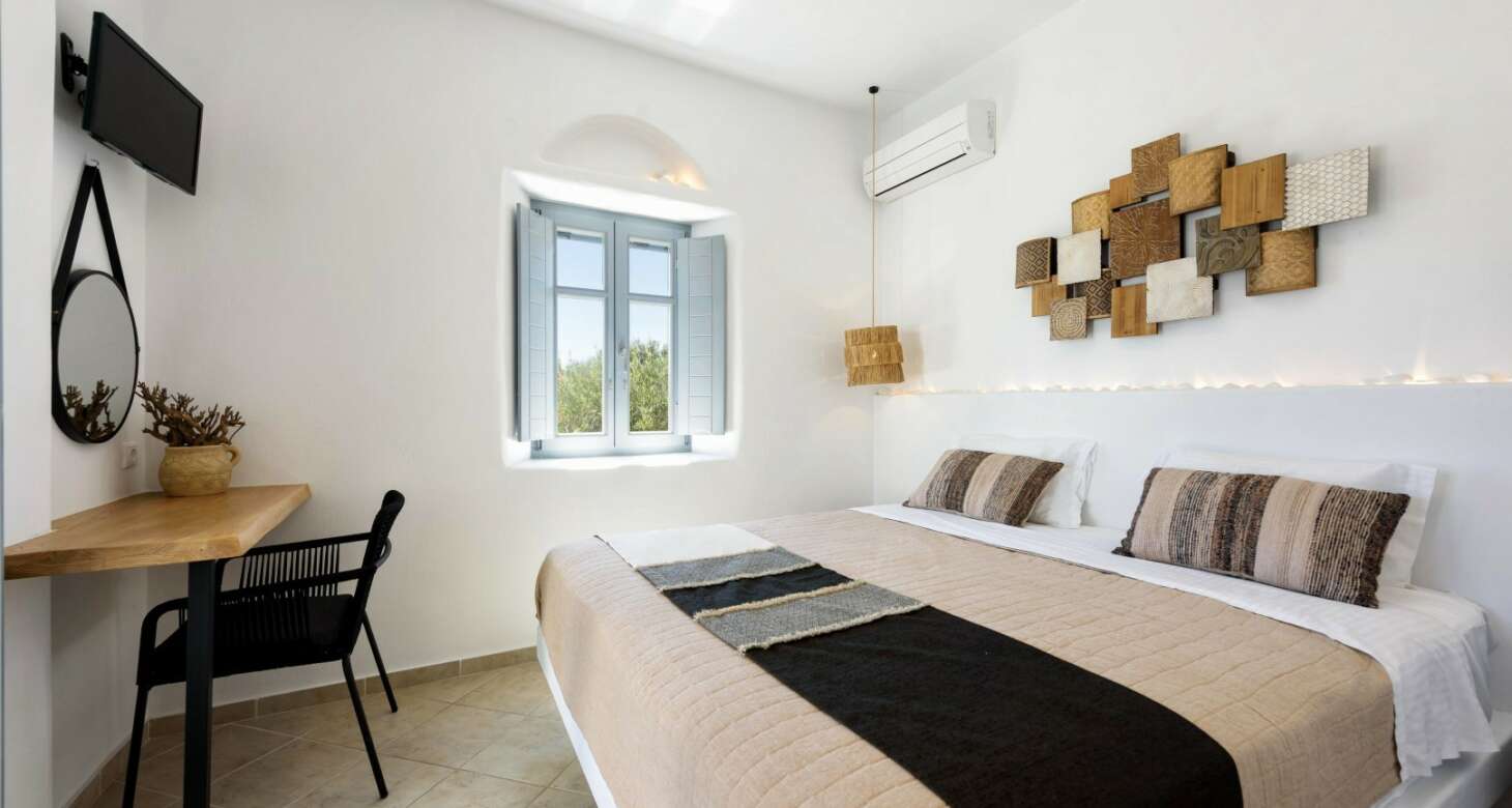 Villa Antheia I in Dryos is a beautiful property that combines boho style with traditional island details in its decoration. The villa features natural wood elements, black accents, and other natural materials that create a cozy and welcoming atmosphere. The white and red stone used in the external walls give the villa an authentic Greek island feel.