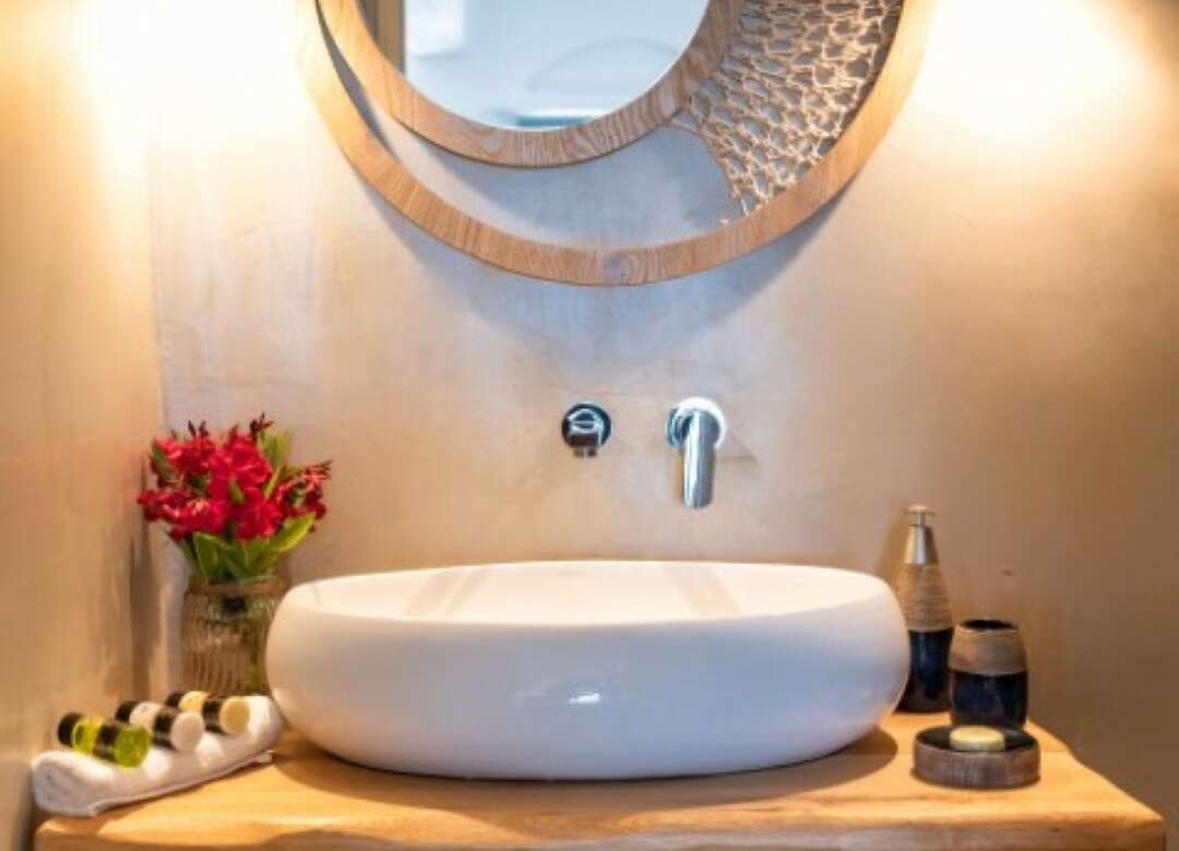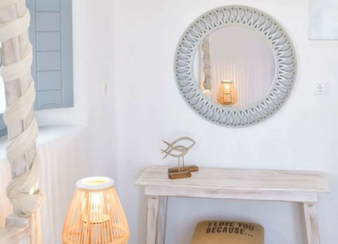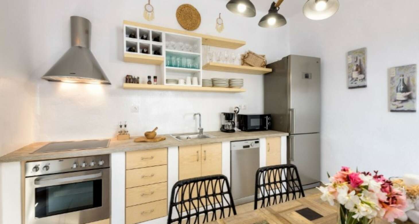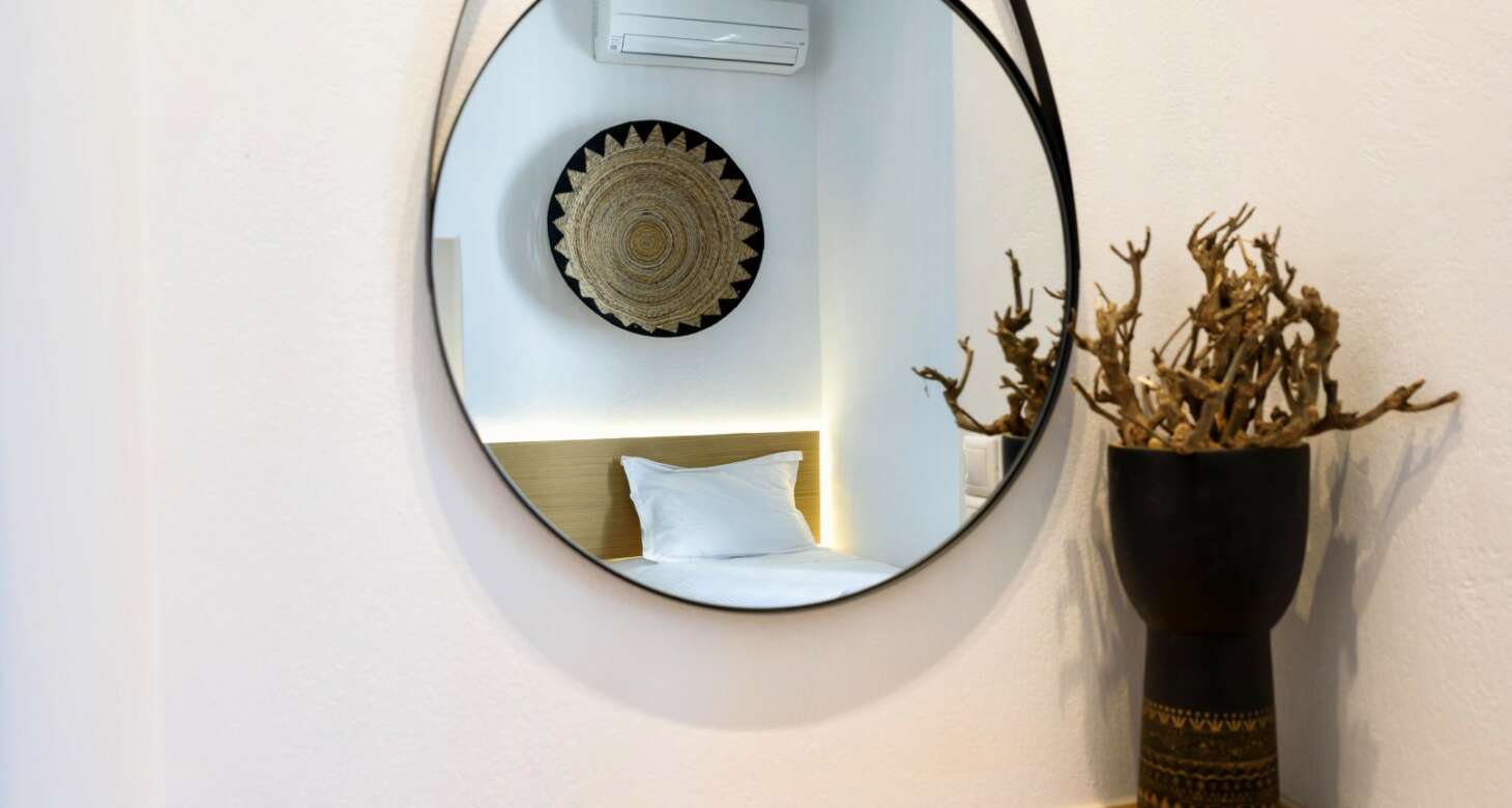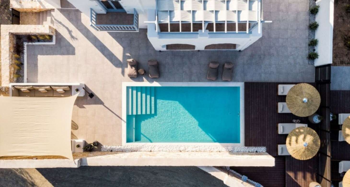 Villa Antheia I in Dryos is a beautiful property that combines boho style with traditional island details in its decoration. The villa features natural wood elements, black accents, and other natural materials that create a cozy and welcoming atmosphere. The white and red stone used in the external walls give the villa an authentic Greek island feel.
