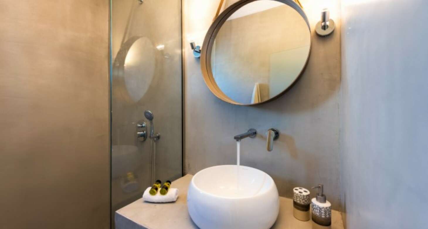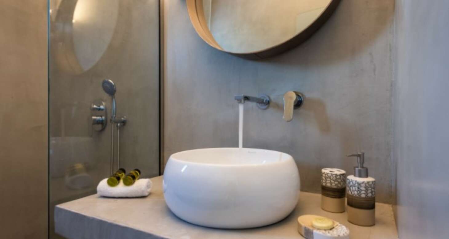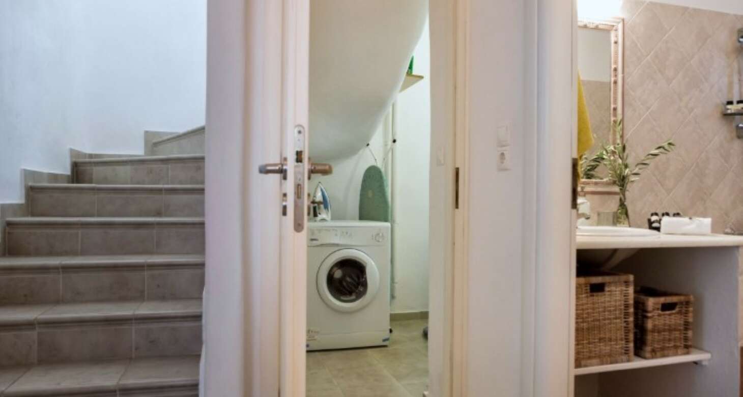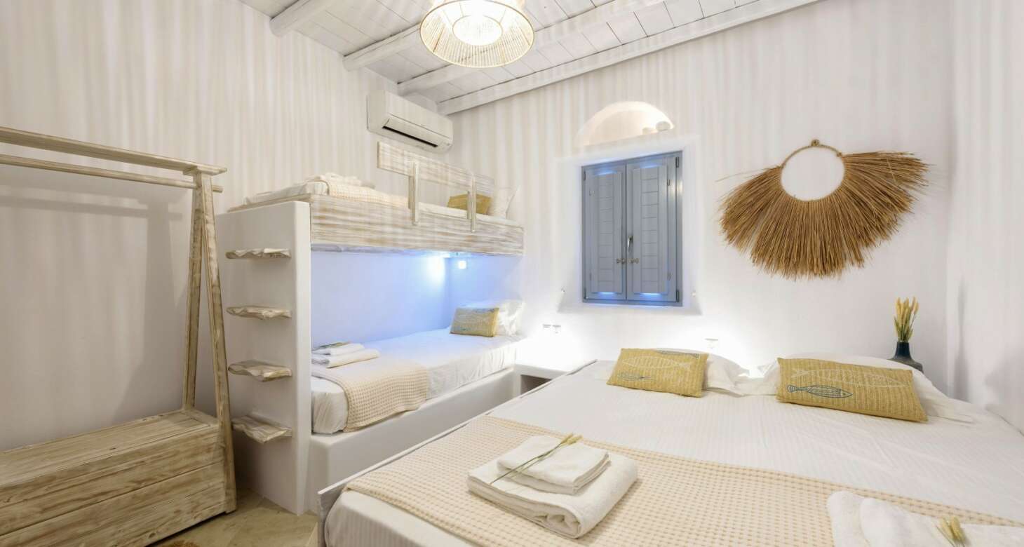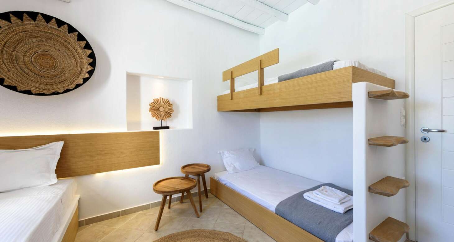 Inside the villa, there is a build-in sofa with natural color pillows and build-in beds. Villa Antheia I offers four bedrooms, which can accommodate up to 12 people and two babies (up to two years old). The villa also features three bathrooms.