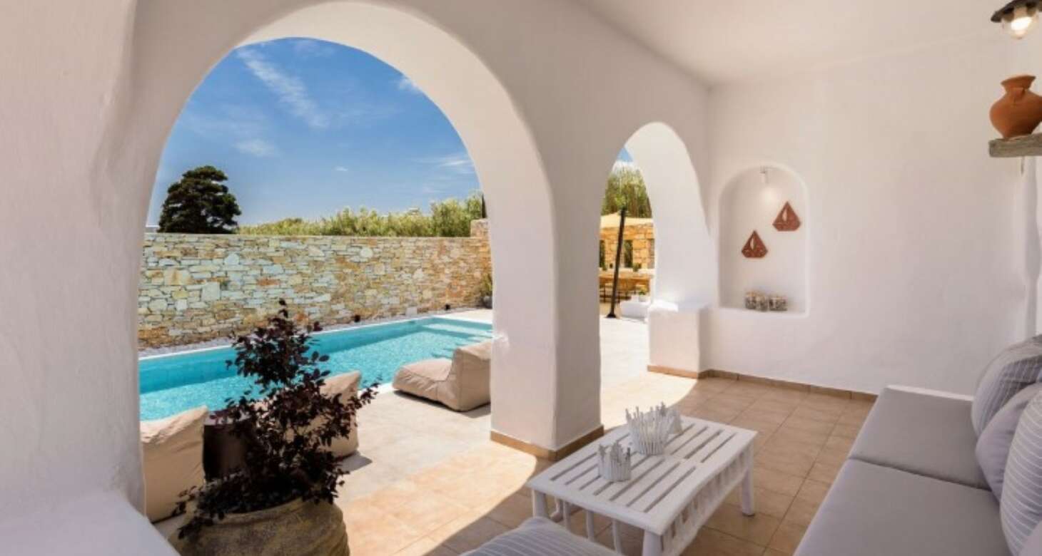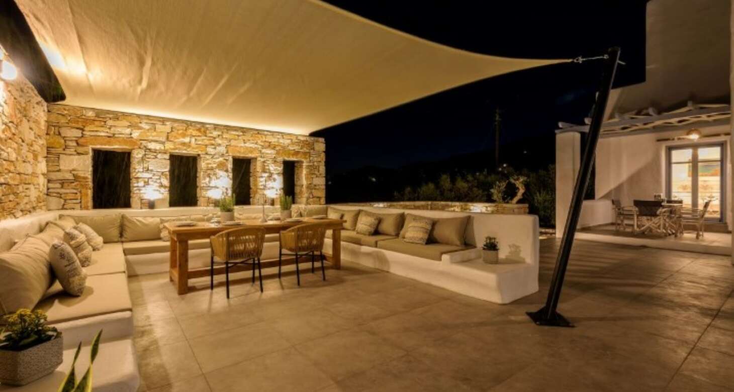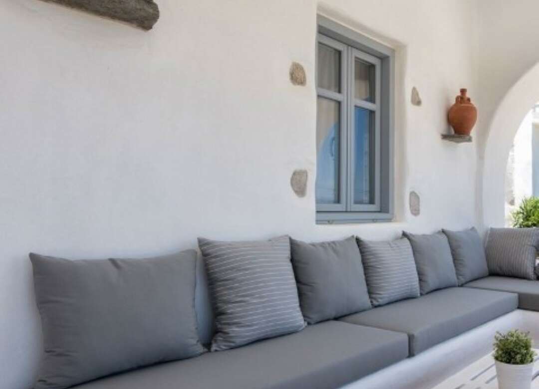One of the main highlights of the villa is the swimming pool, which offers complete privacy for guests. Also its just steps away from Dryos beach.The shaded outside dining area is perfect for enjoying meals or drinks with friends and family. The dining table is made of natural wood and there is a built-in sofa around it. The traditional arches in the exterior of the villa add to the traditional island house feeling.