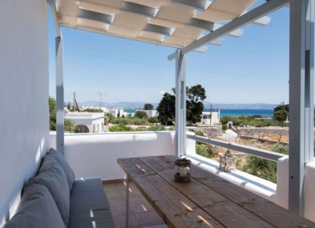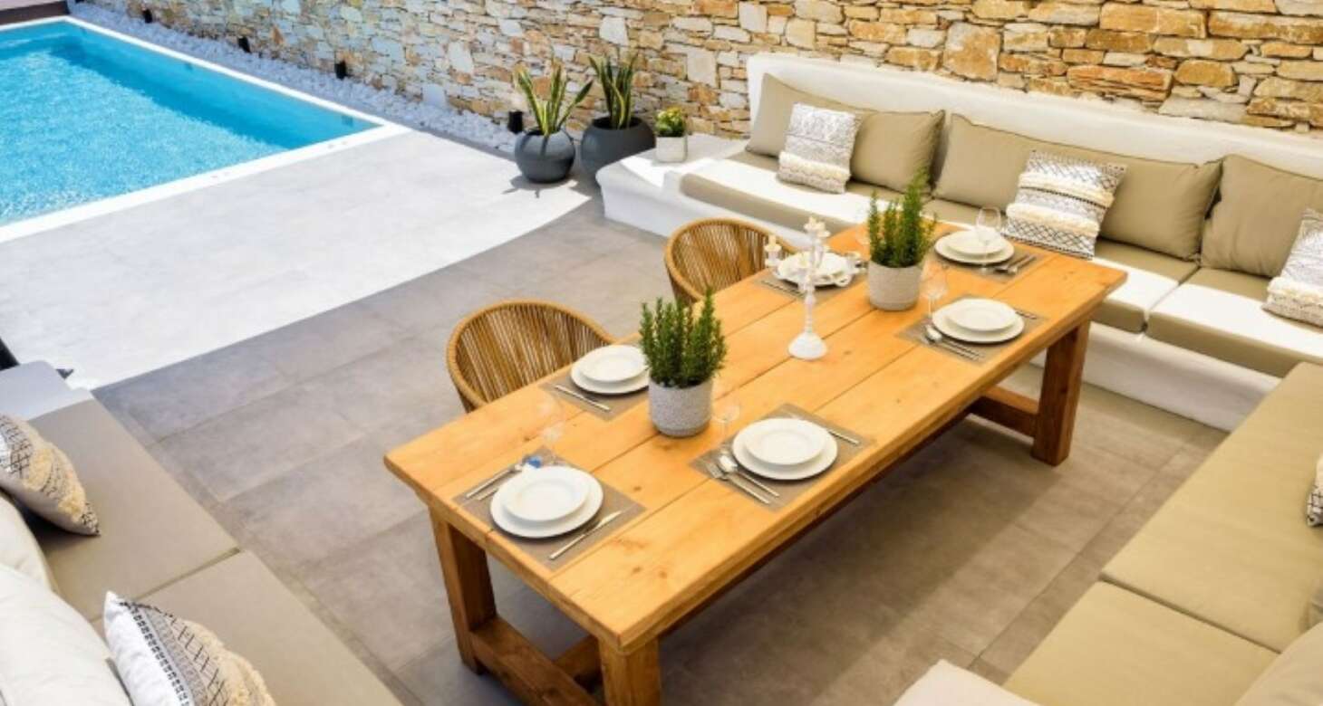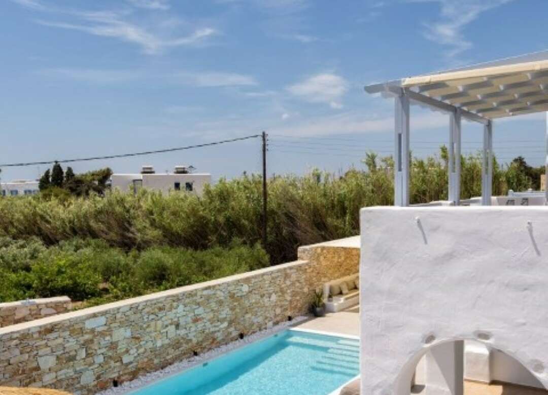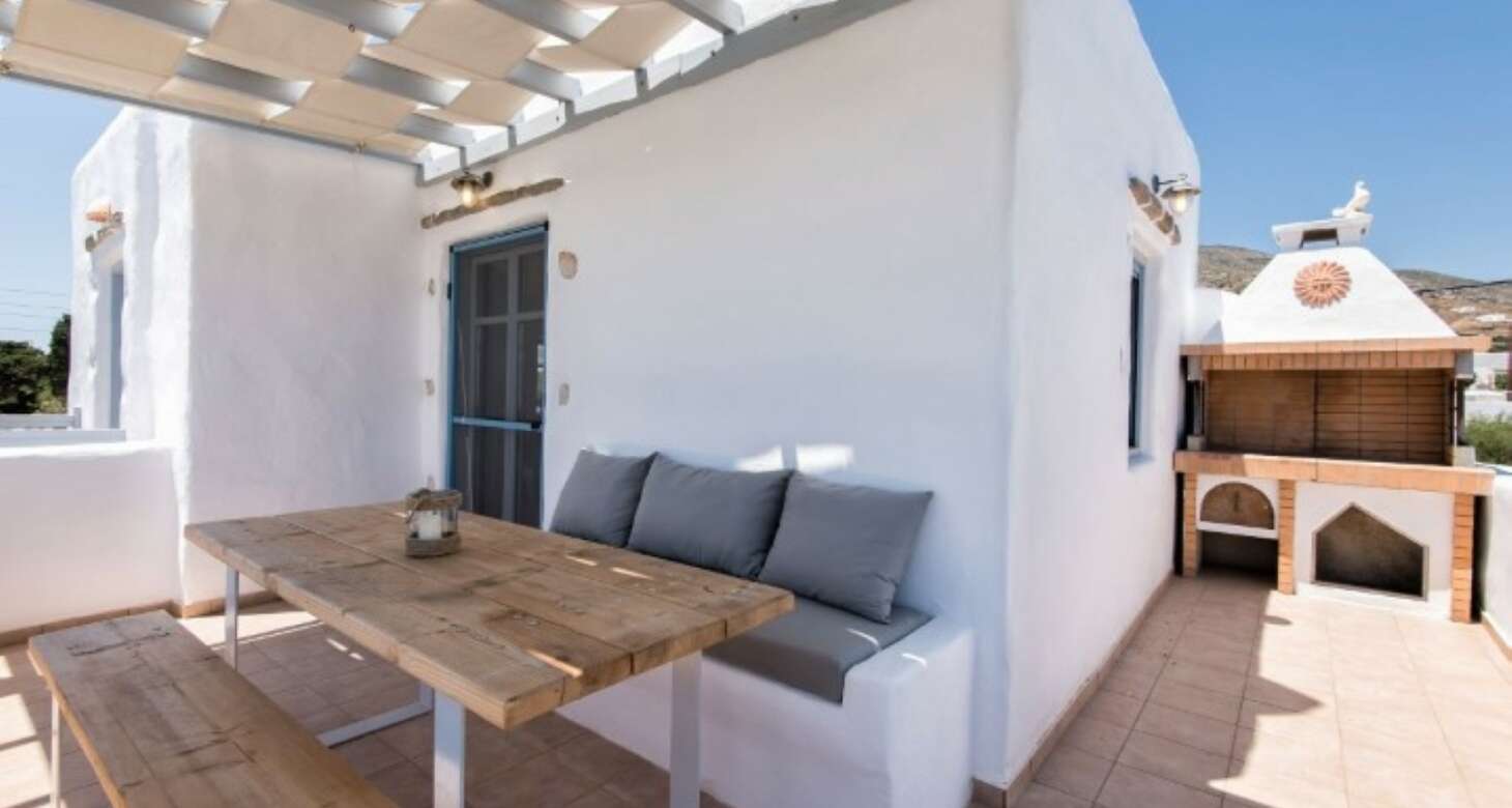 One of the main highlights of the villa is the swimming pool, which offers complete privacy for guests. Also its just steps away from Dryos beach.The shaded outside dining area is perfect for enjoying meals or drinks with friends and family. The dining table is made of natural wood and there is a built-in sofa around it. The traditional arches in the exterior of the villa add to the traditional island house feeling.