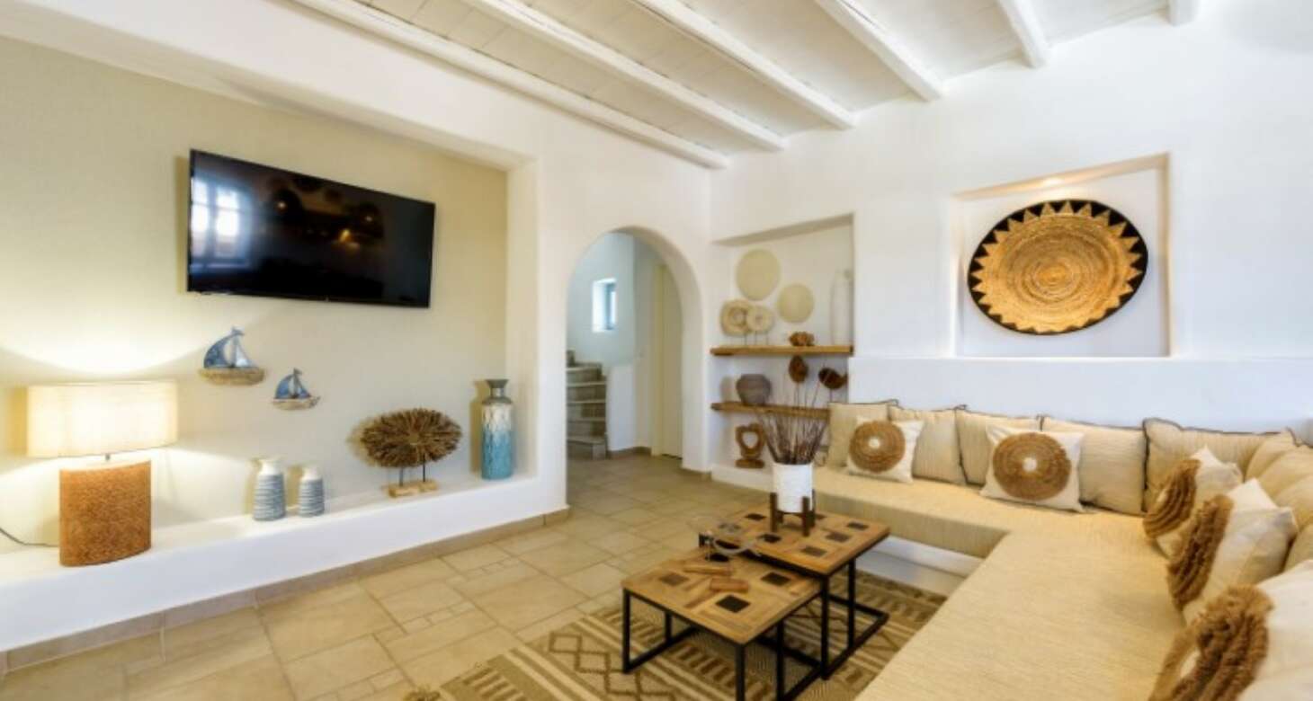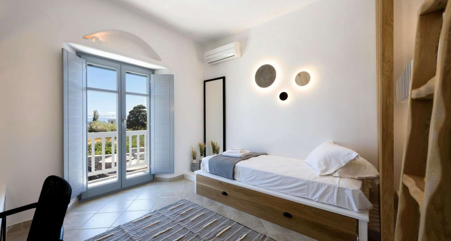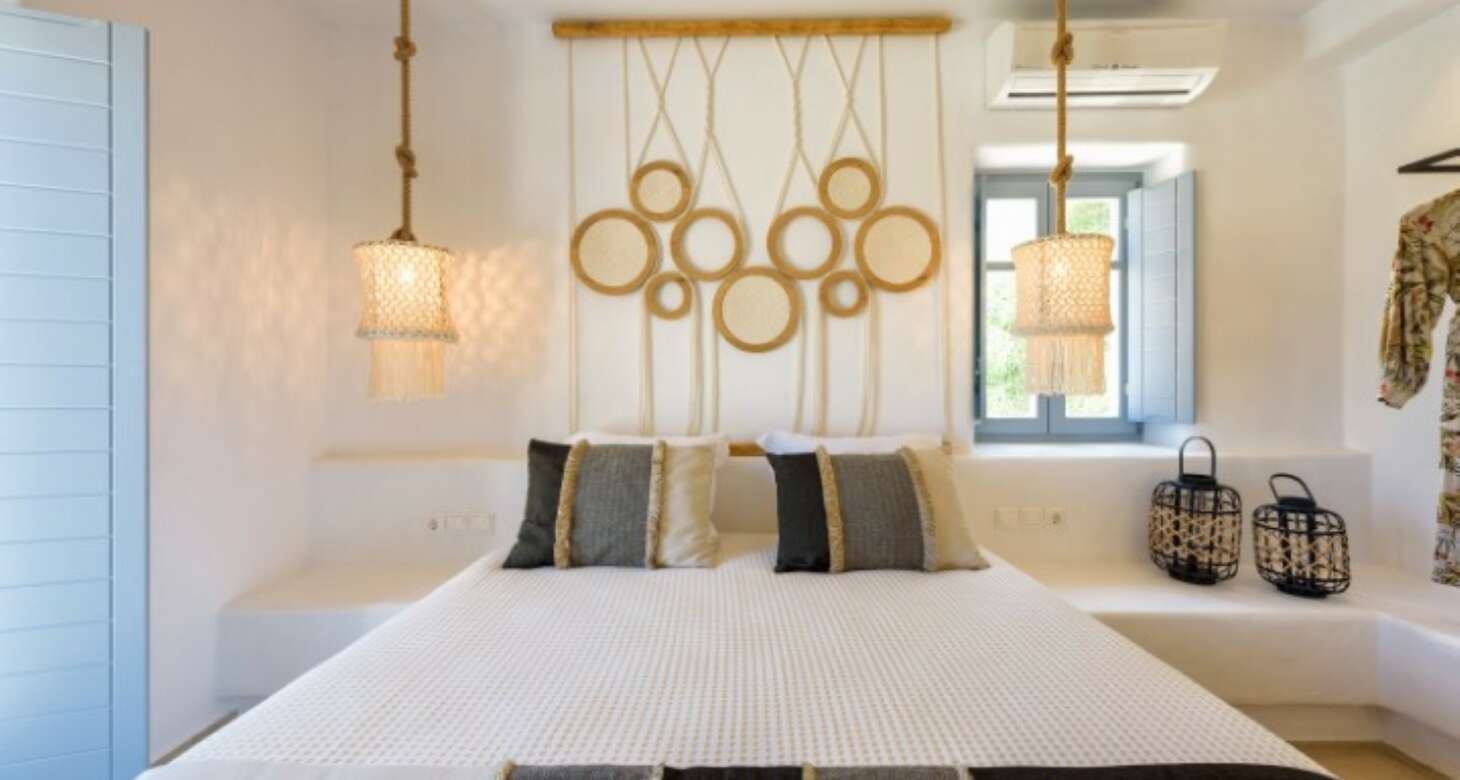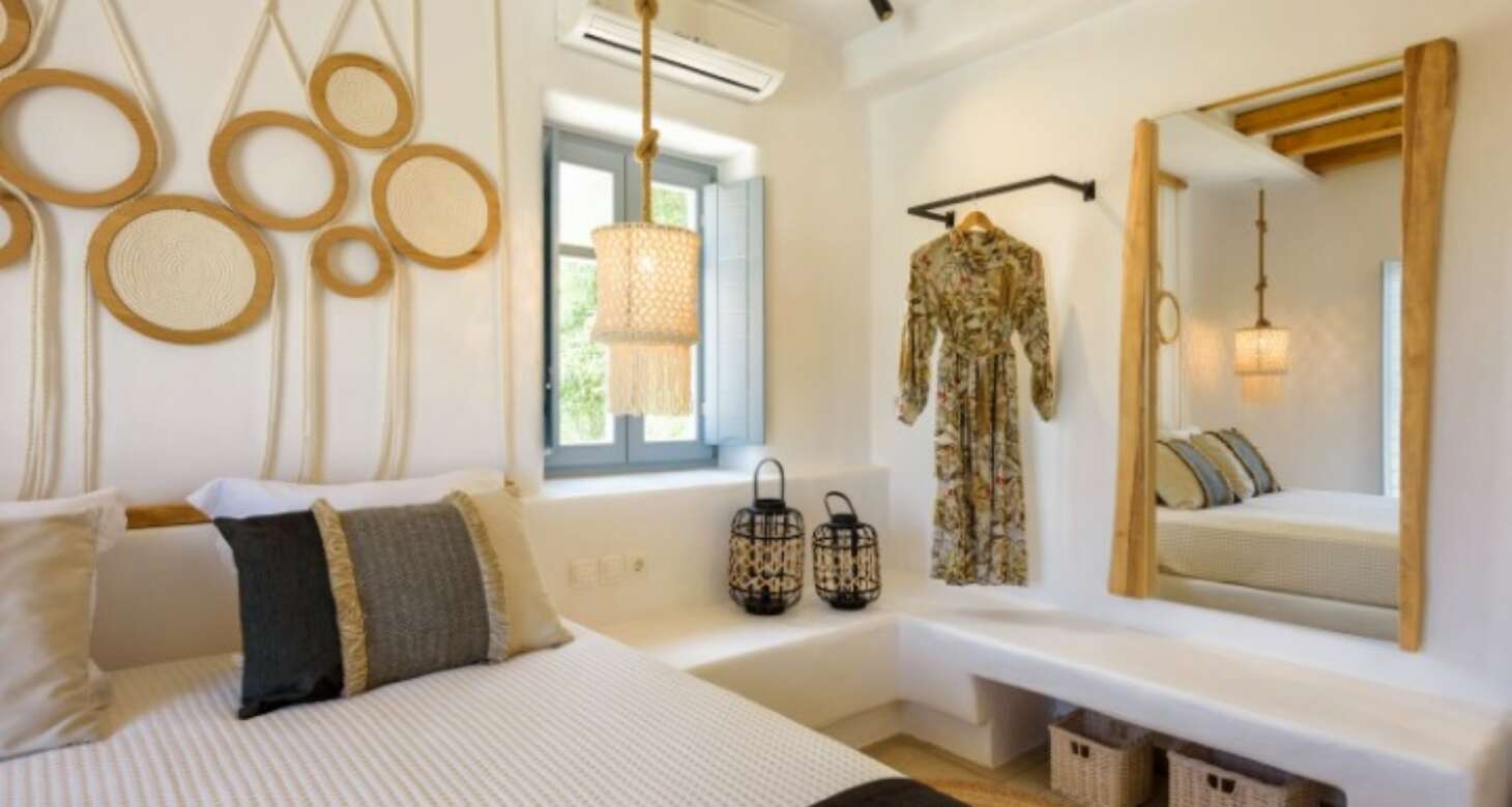 Villa Antheia II in Dryos is a stunning property that seamlessly blends boho style with traditional island details in its decor. The villa features natural wood elements, black accents, and other natural materials that create a cozy and warm ambiance. The bedrooms are especially noteworthy, with floor-to-ceiling wood decorations that exude rustic charm.