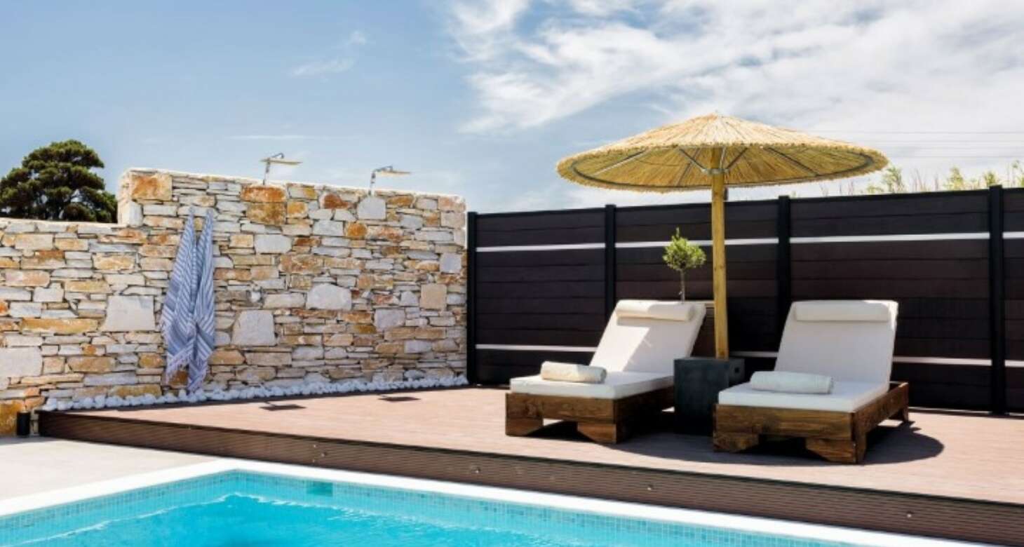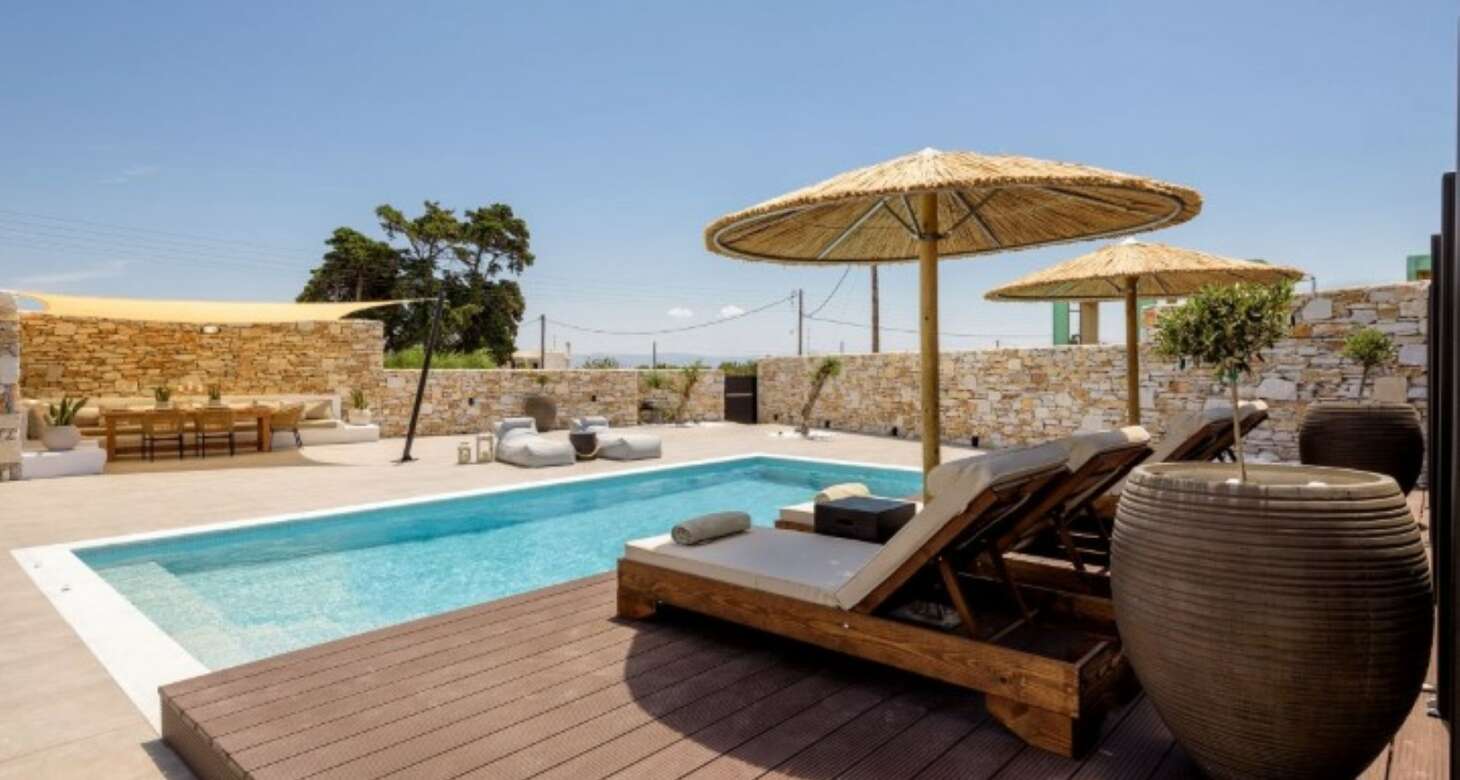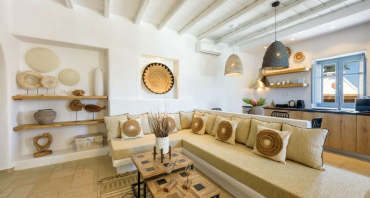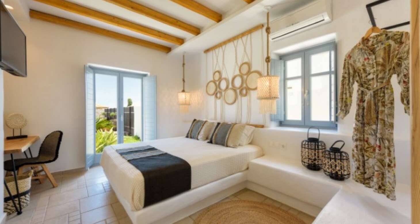 Villa Antheia II in Dryos is a stunning property that seamlessly blends boho style with traditional island details in its decor. The villa features natural wood elements, black accents, and other natural materials that create a cozy and warm ambiance. The bedrooms are especially noteworthy, with floor-to-ceiling wood decorations that exude rustic charm.