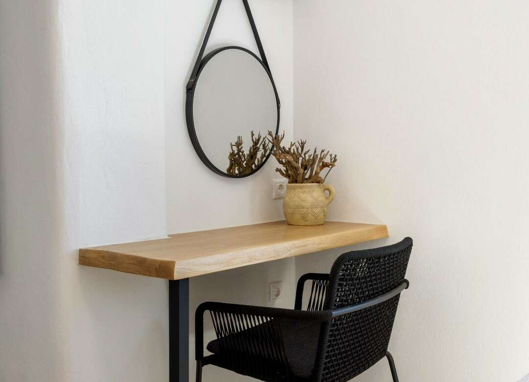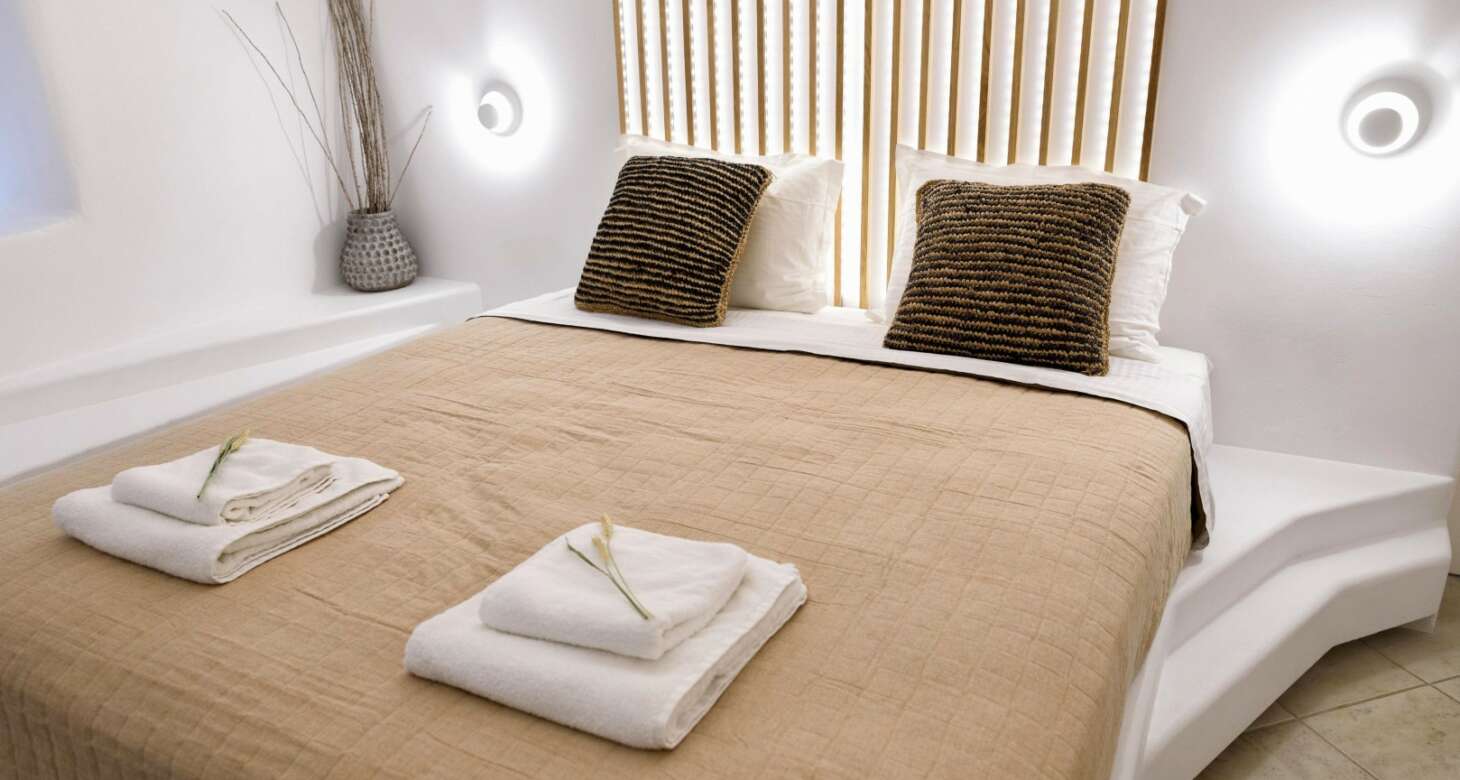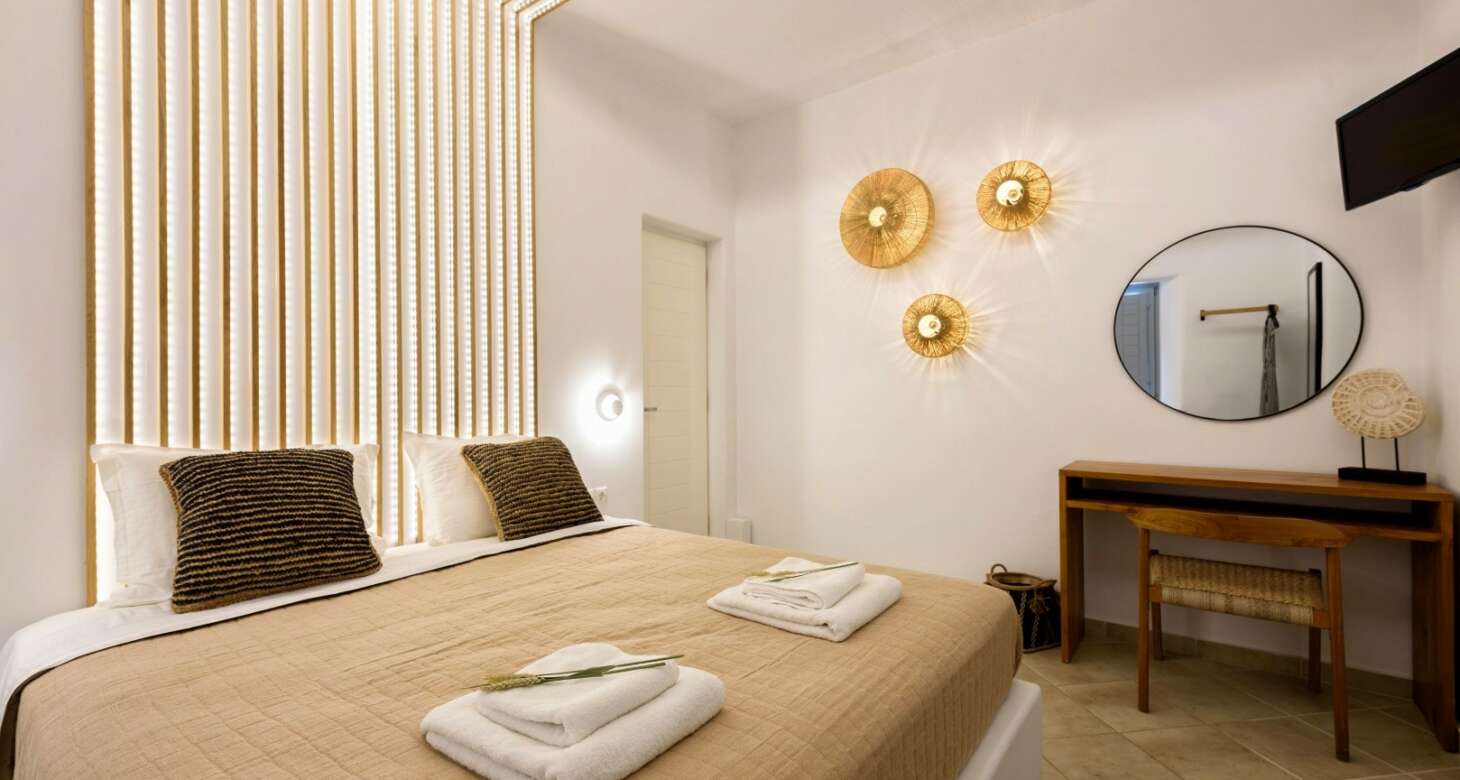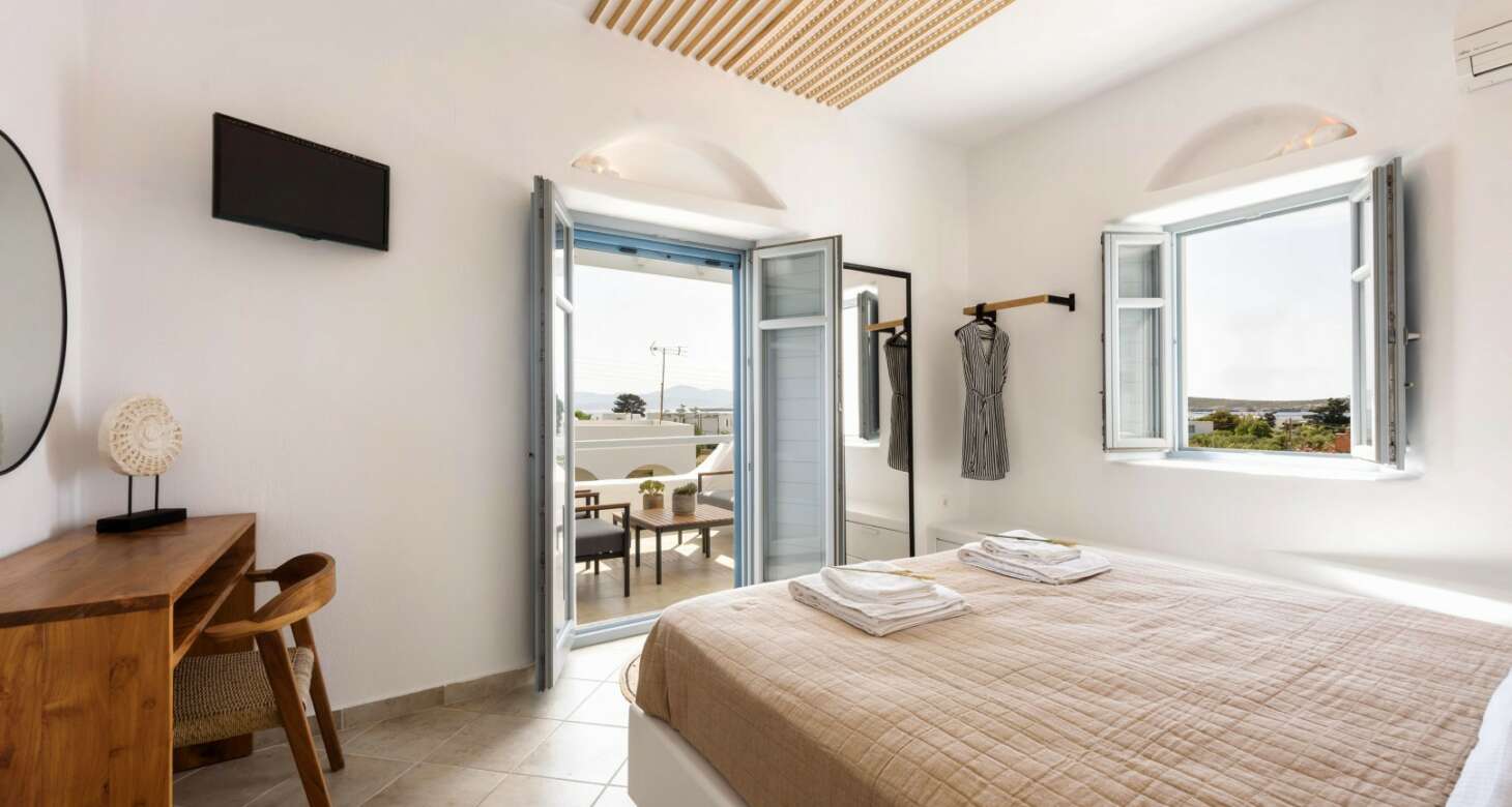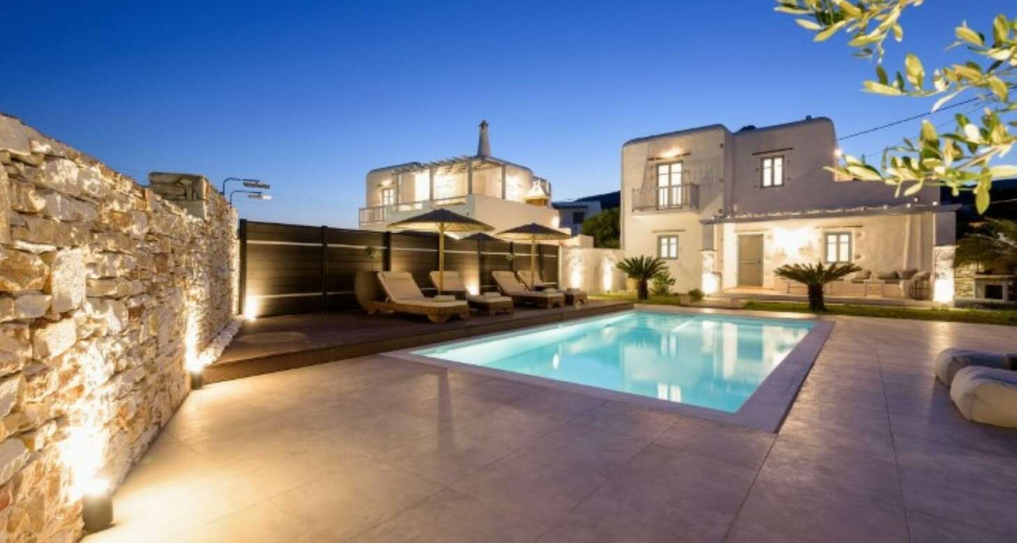 Villa Antheia II in Dryos is a stunning property that seamlessly blends boho style with traditional island details in its decor. The villa features natural wood elements, black accents, and other natural materials that create a cozy and warm ambiance. The bedrooms are especially noteworthy, with floor-to-ceiling wood decorations that exude rustic charm.