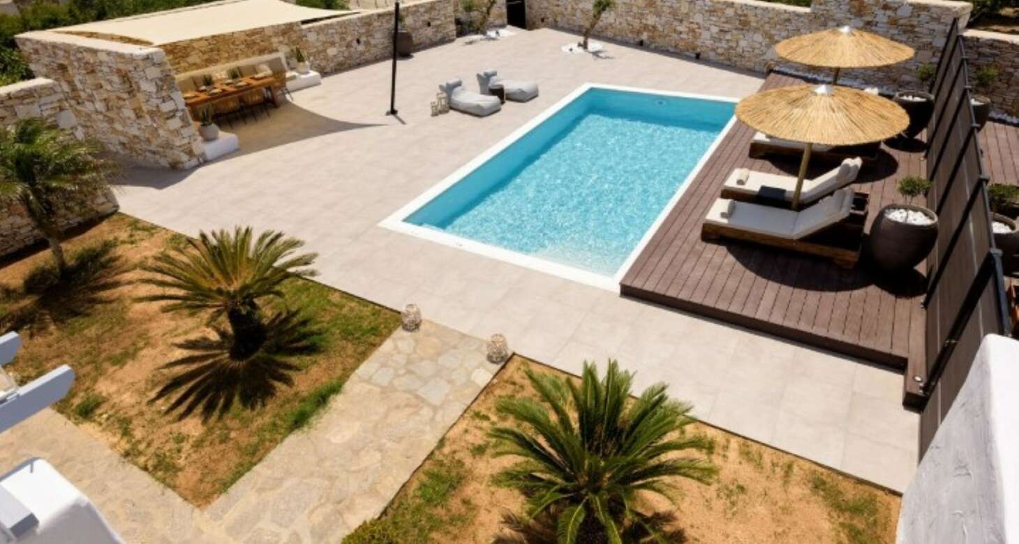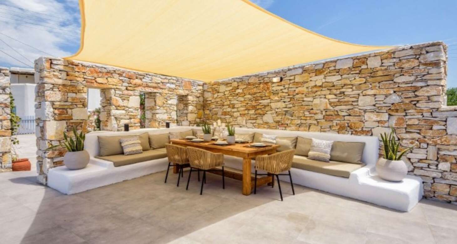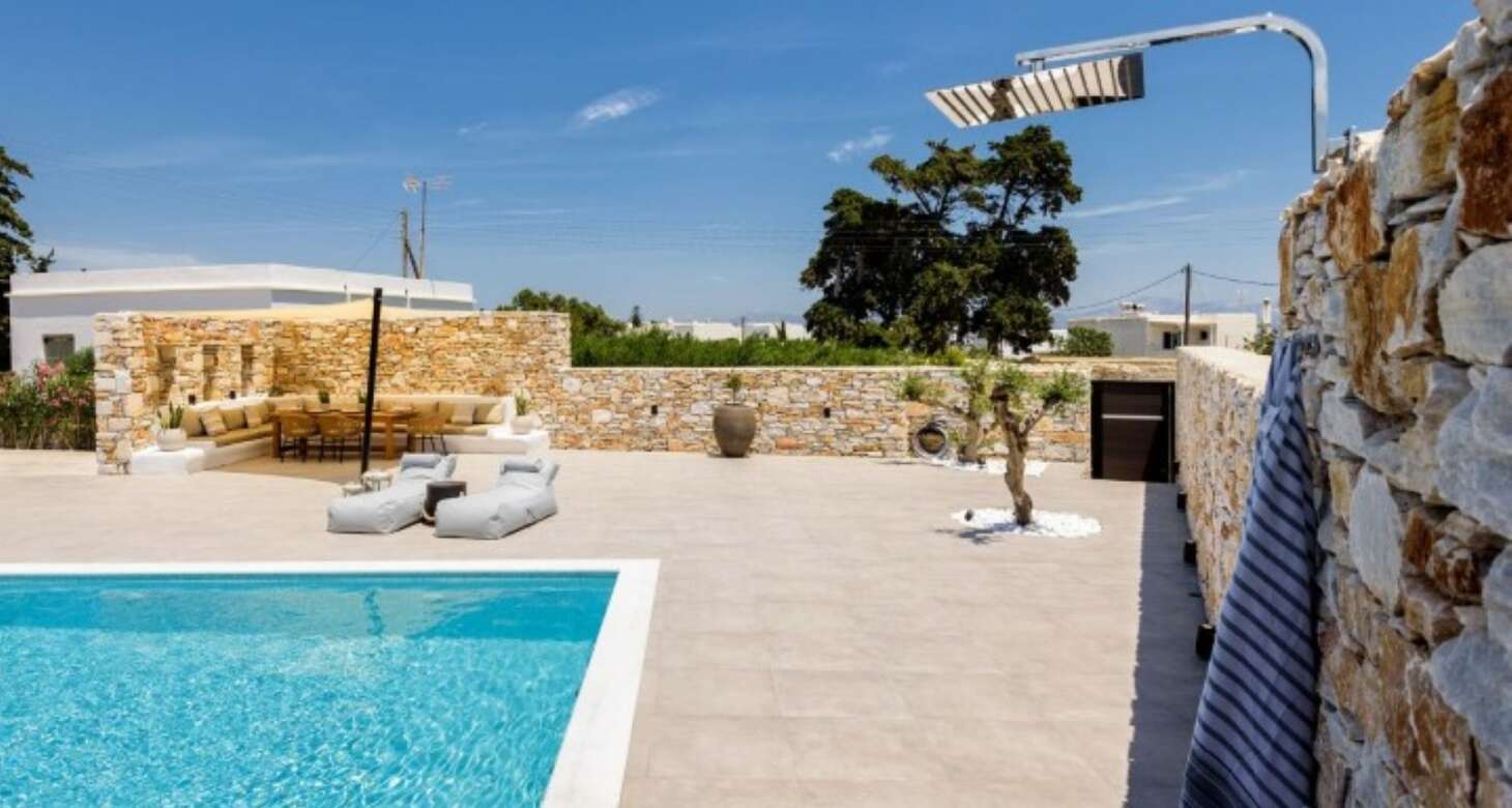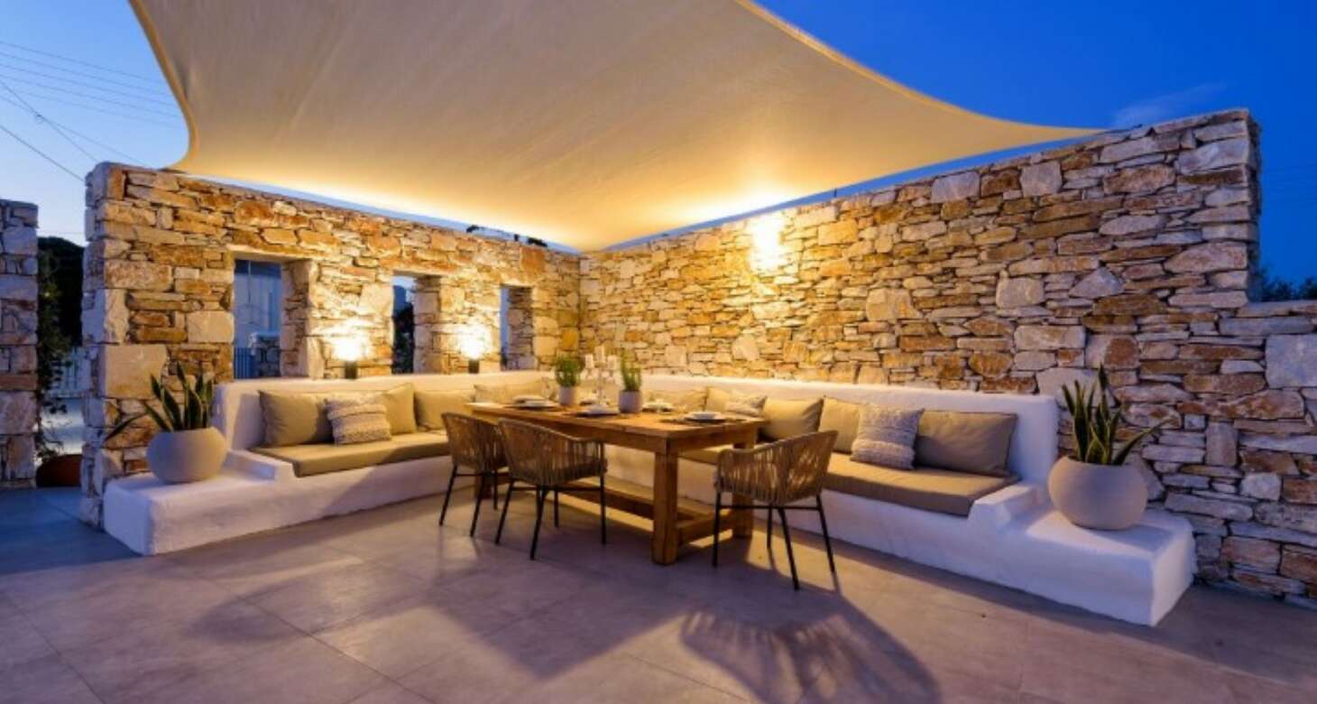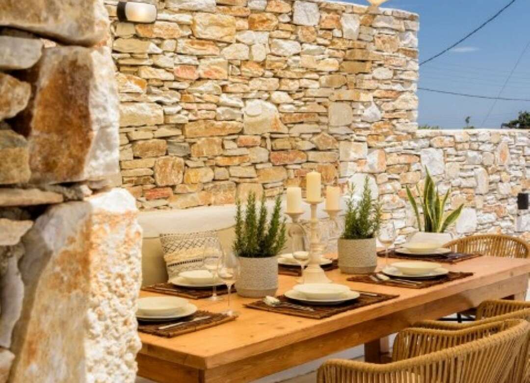 The villa’s exterior is equally impressive, with white and red stone used in the external walls that provide an authentic Greek island feel. The swimming pool is a highlight, offering complete privacy for guests. The shaded outside dining area, complete with a natural wood dining table and a built-in sofa, is the perfect spot for enjoying meals or drinks with family and friends. The traditional arches in the exterior further add to the traditional island house ambiance.