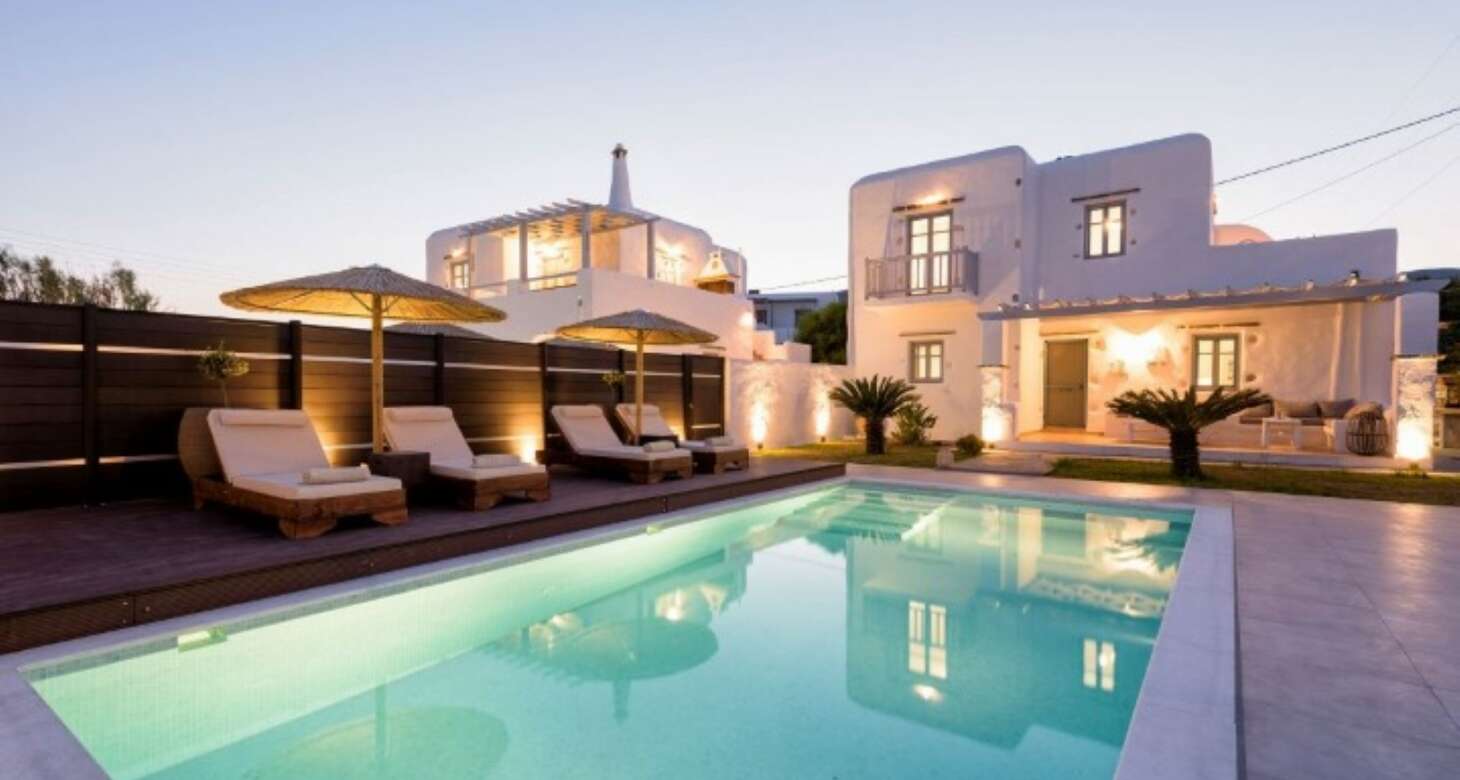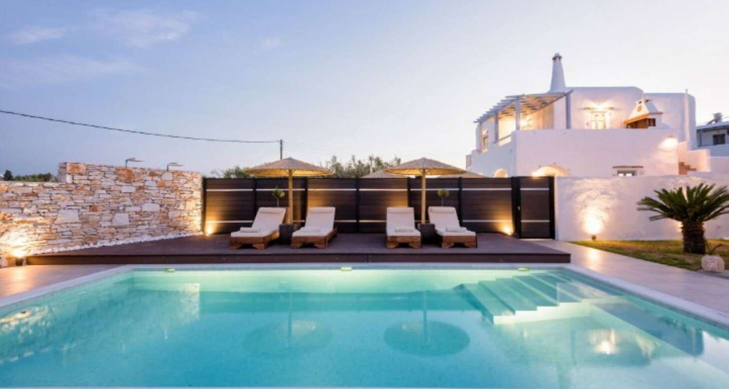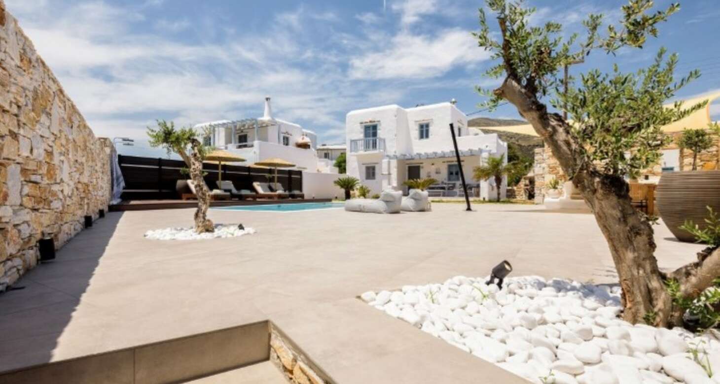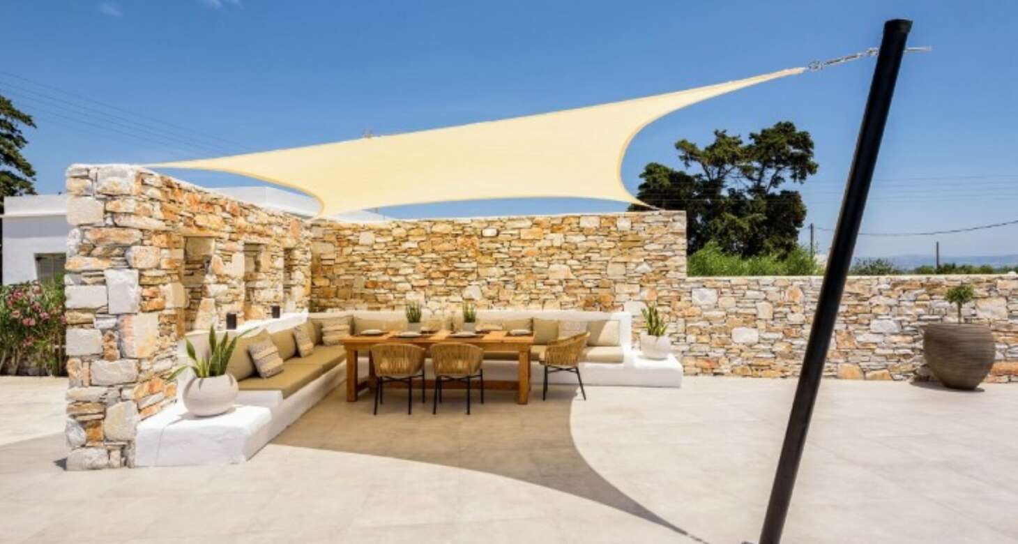 The villa’s exterior is equally impressive, with white and red stone used in the external walls that provide an authentic Greek island feel. The swimming pool is a highlight, offering complete privacy for guests. The shaded outside dining area, complete with a natural wood dining table and a built-in sofa, is the perfect spot for enjoying meals or drinks with family and friends. The traditional arches in the exterior further add to the traditional island house ambiance.