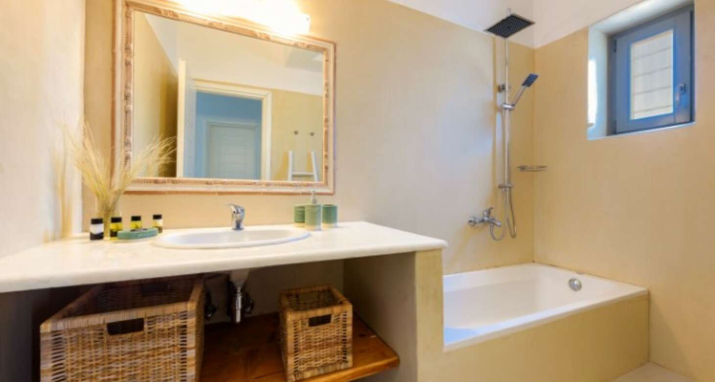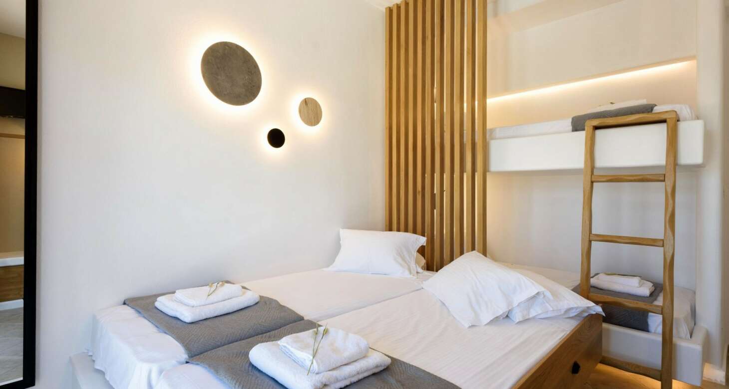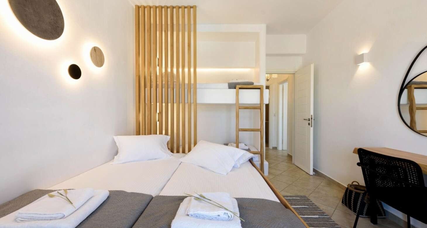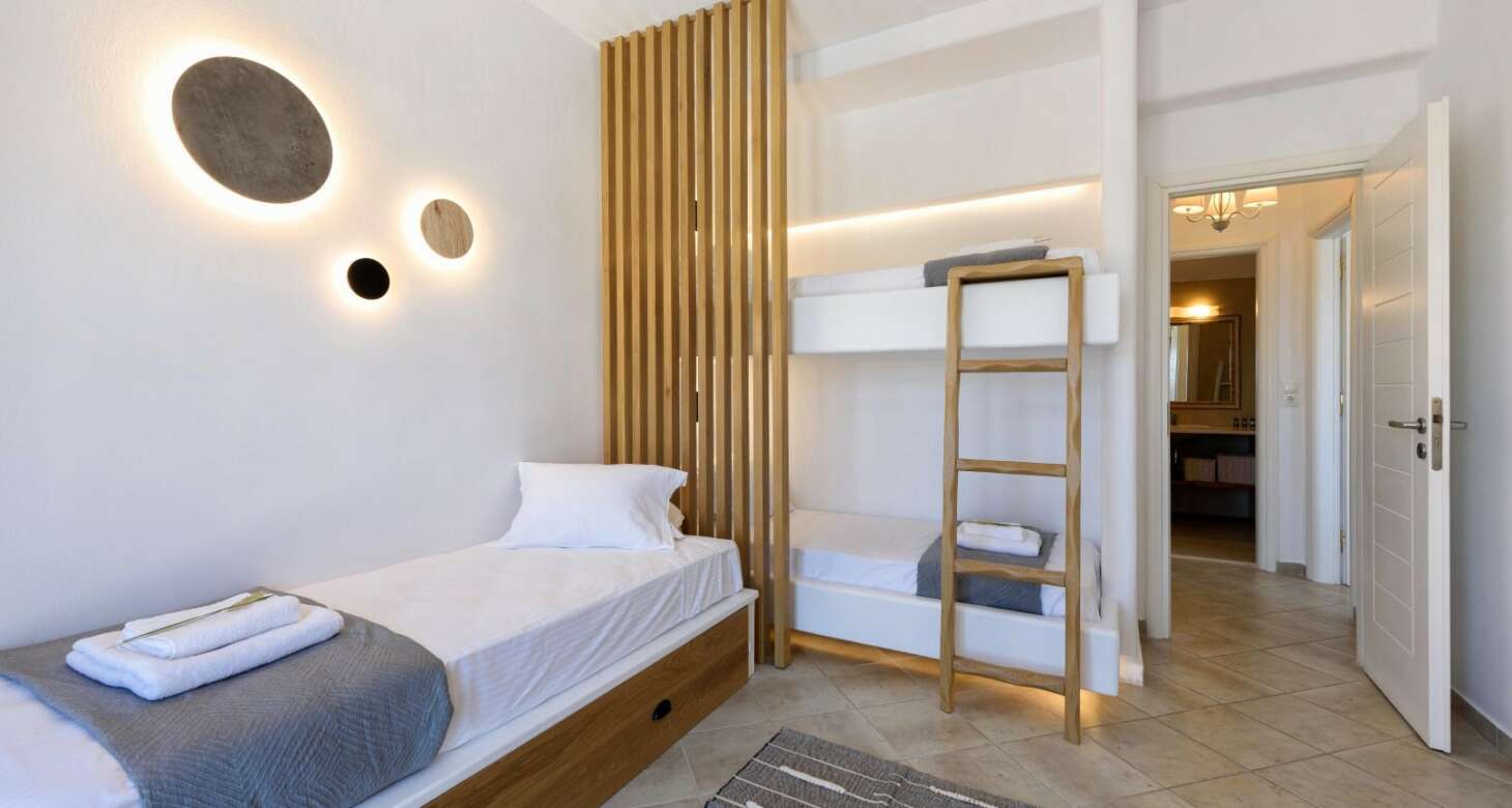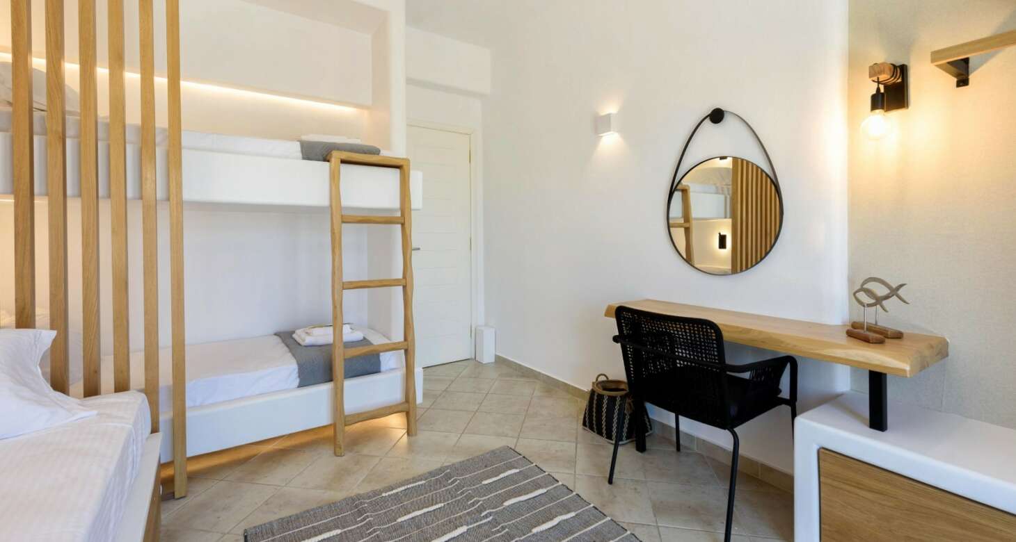 Inside, Villa Antheia II features a build-in sofa with natural-colored pillows and build-in beds. The villa has three bedrooms, which can accommodate up to eight people and two babies (up to two years old), along with two bathrooms. The bedroom layout is as follows: two bedrooms with double beds and one bedroom with one bunk bed and one double sofa bed. This setup is ideal for families or groups of friends traveling together, as there is plenty of space for everyone to sleep comfortably.
