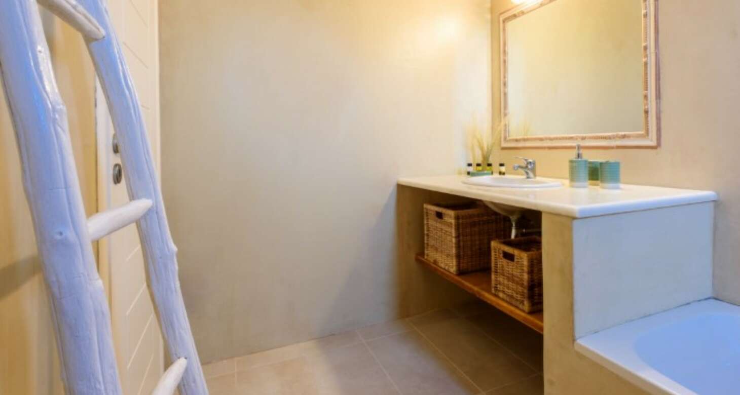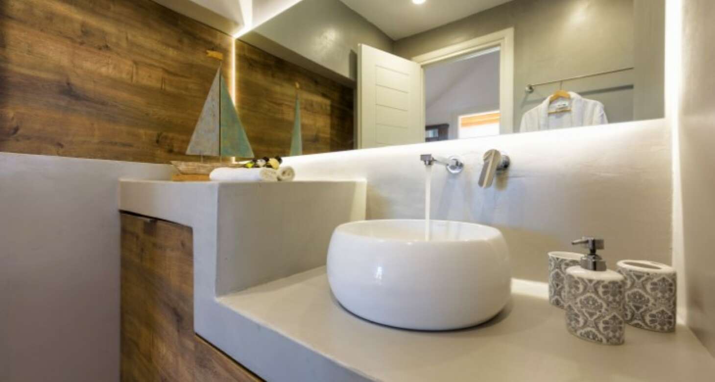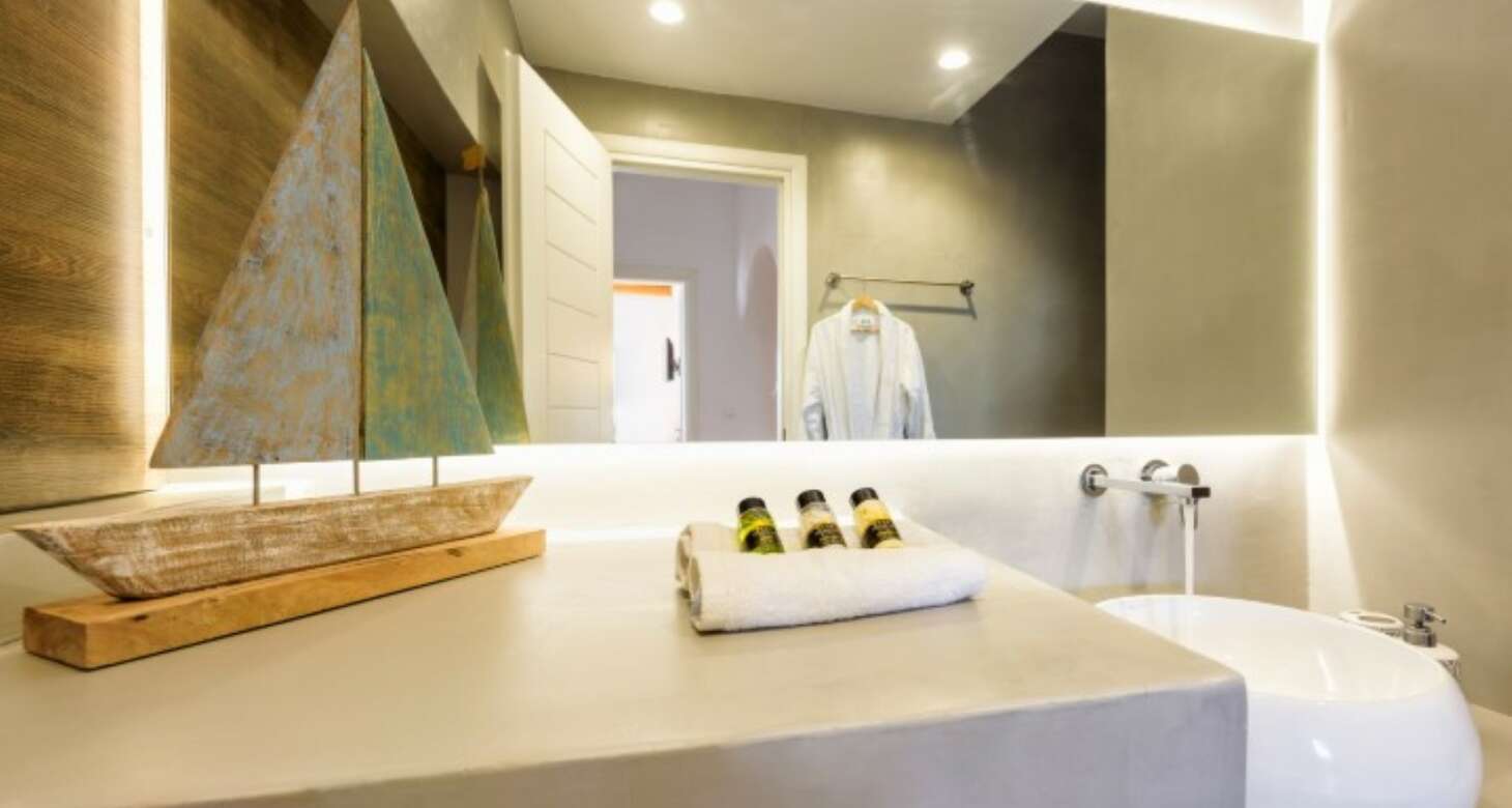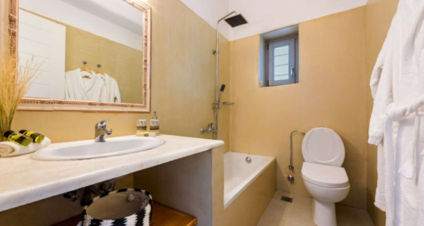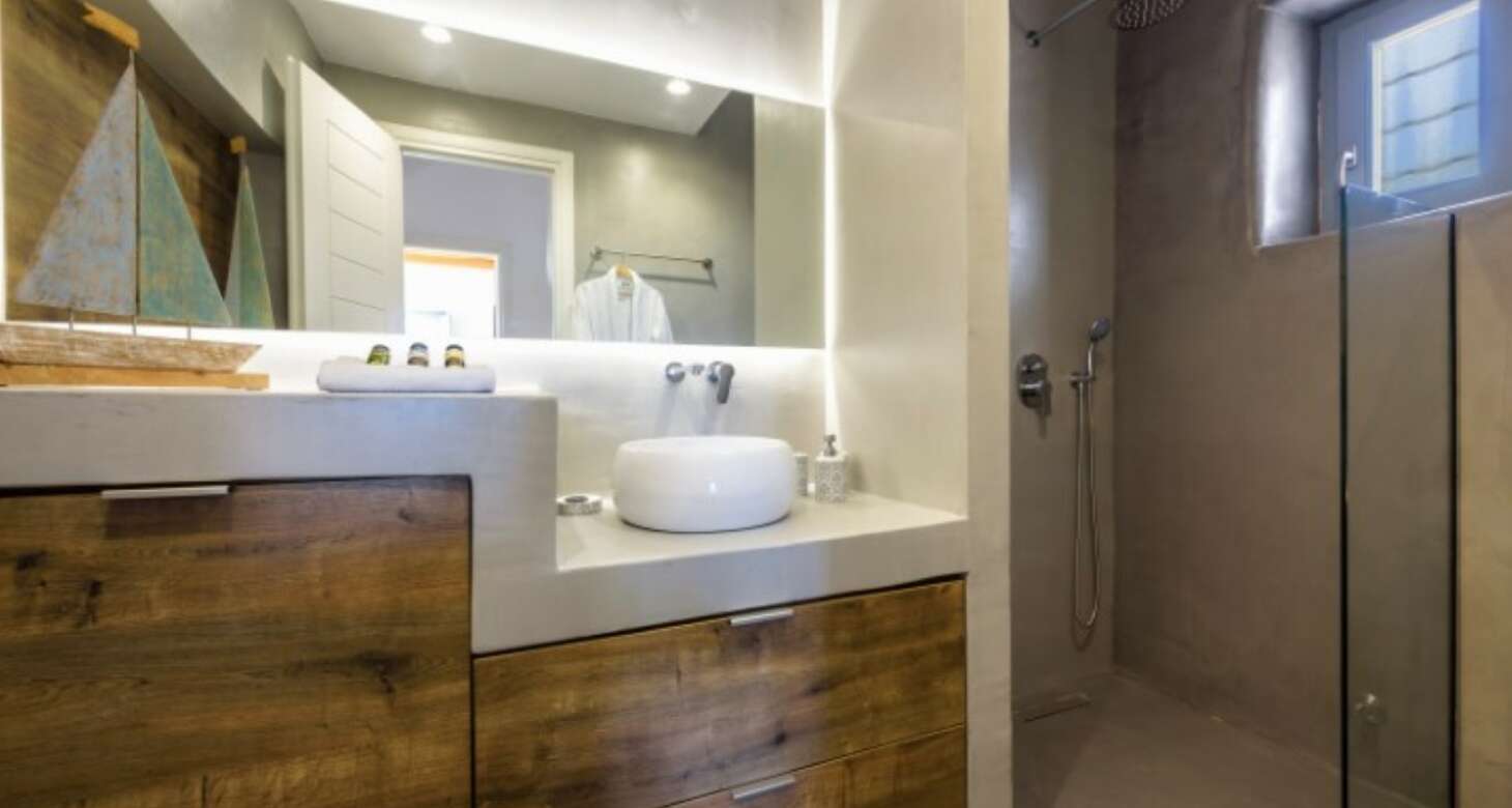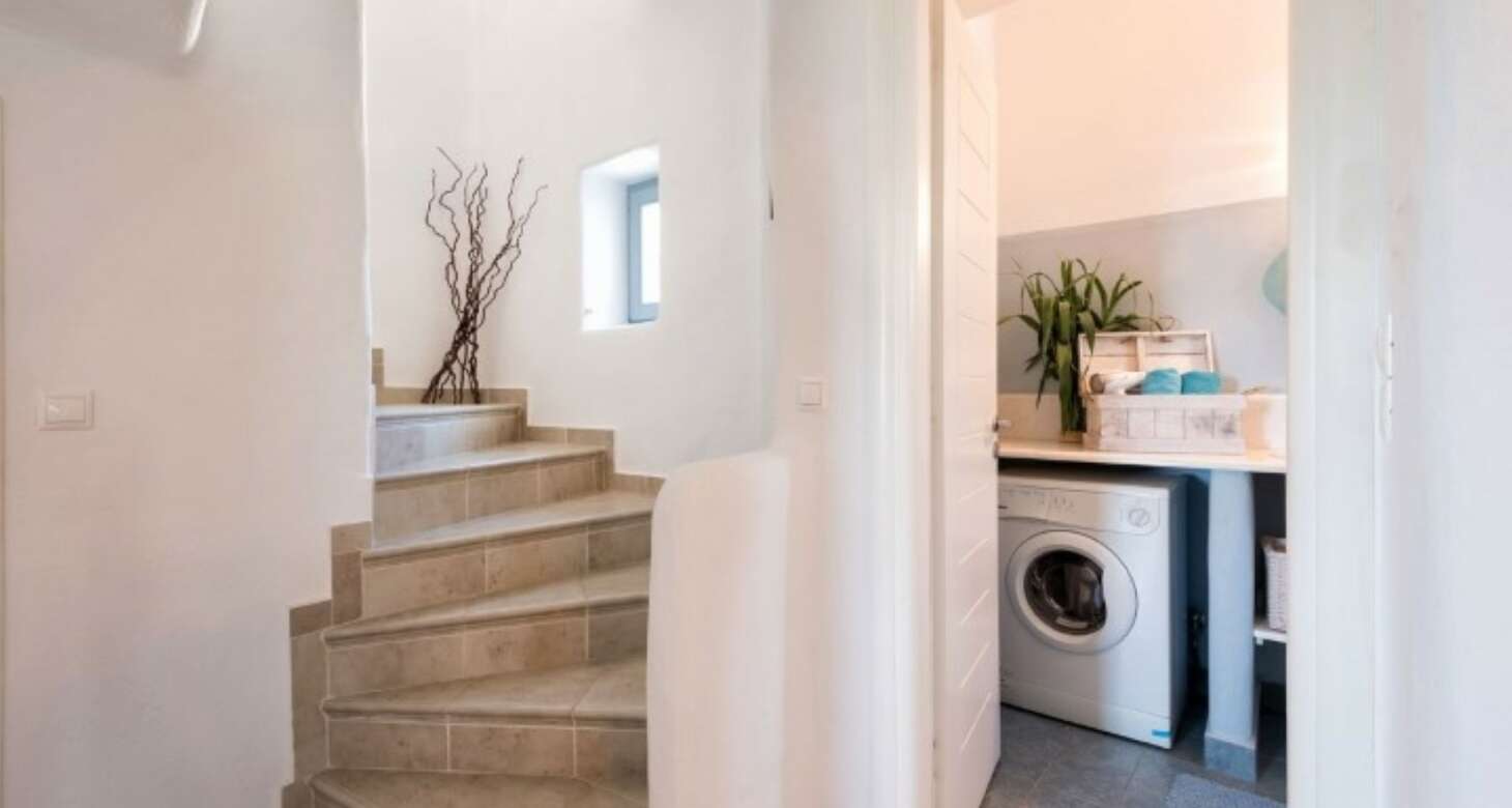 Inside, Villa Antheia II features a build-in sofa with natural-colored pillows and build-in beds. The villa has three bedrooms, which can accommodate up to eight people and two babies (up to two years old), along with two bathrooms. The bedroom layout is as follows: two bedrooms with double beds and one bedroom with one bunk bed and one double sofa bed. This setup is ideal for families or groups of friends traveling together, as there is plenty of space for everyone to sleep comfortably.