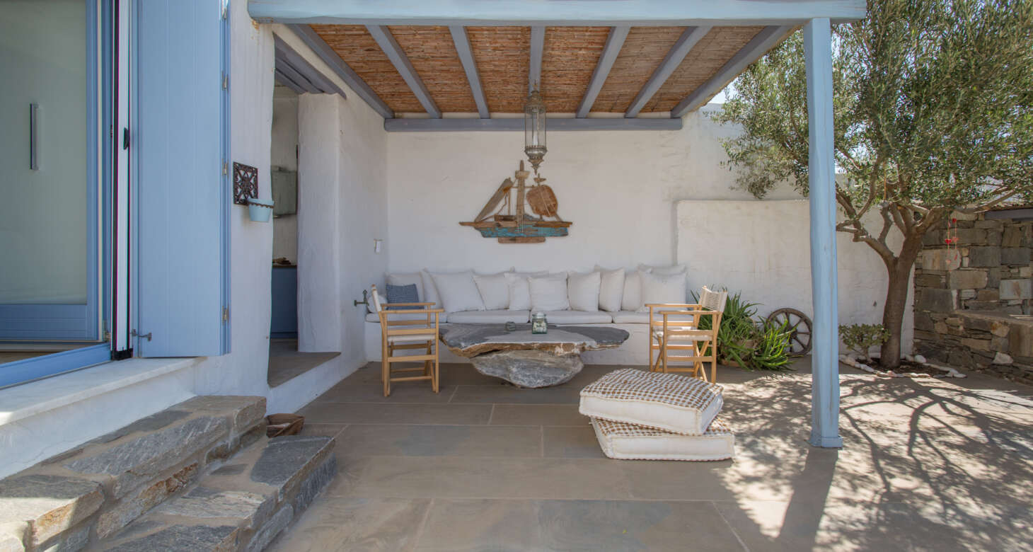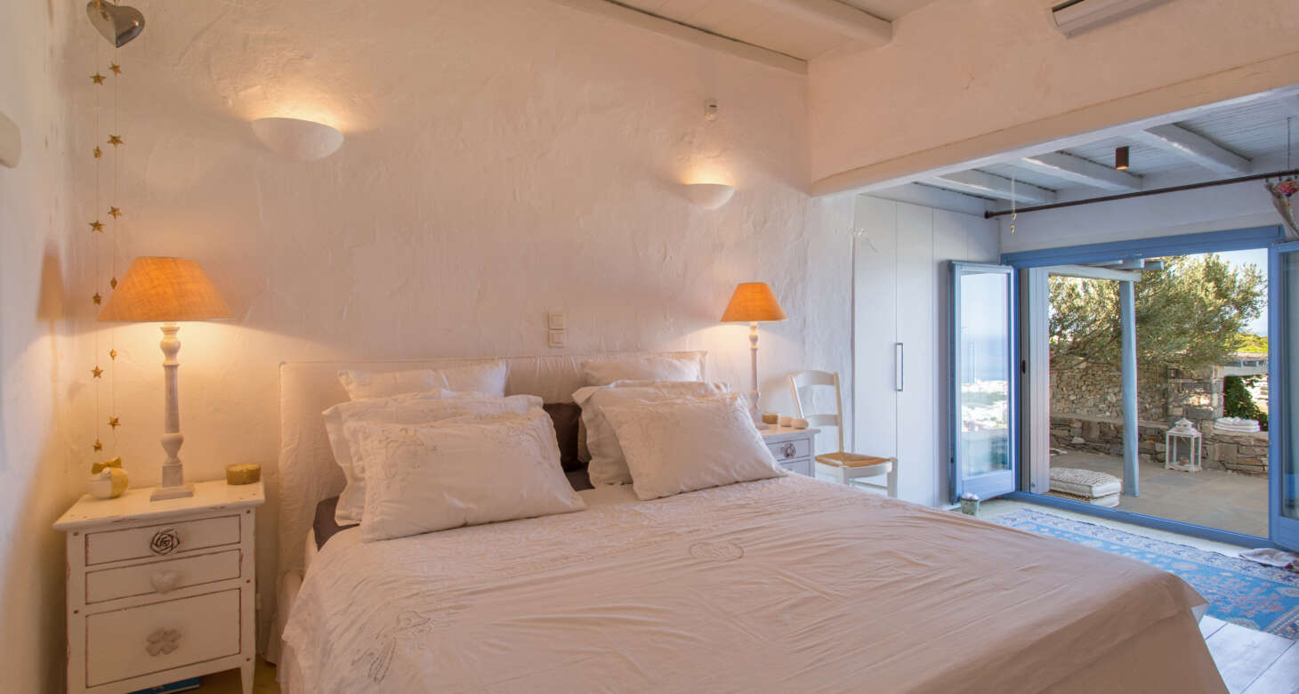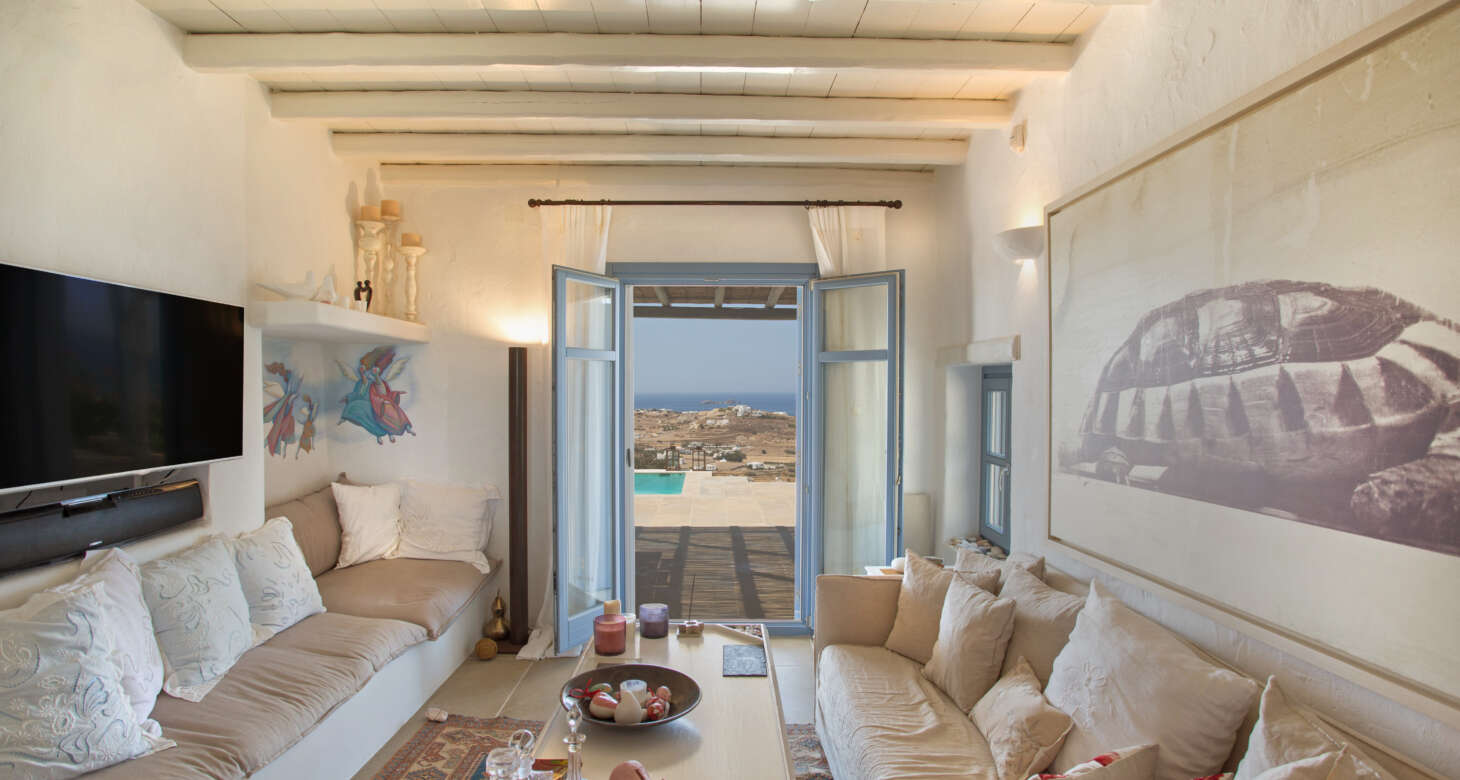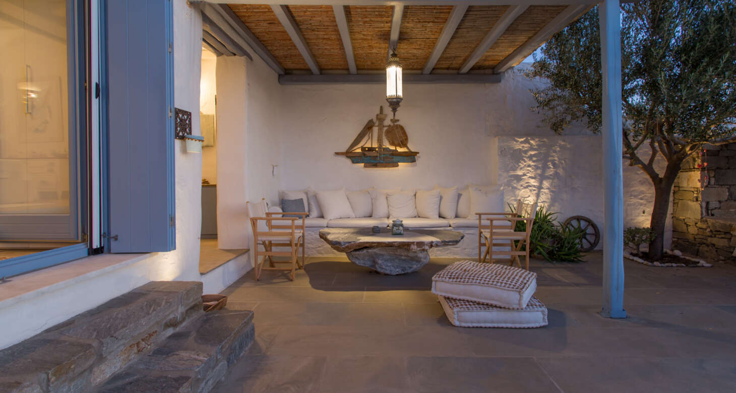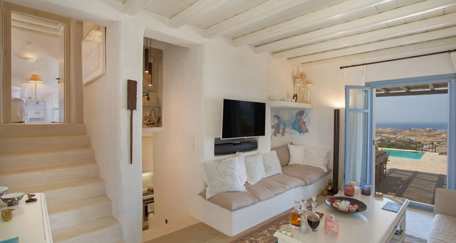 The stunning Villa Gold in Taxiarchaki Paroikia, seamlessly blends traditional island style with modern sophistication. The villa boasts wooden beam ceilings and white-washed walls, adding to the classic Greek island charm. The floors are made of cement mortar, giving the home a contemporary edge.