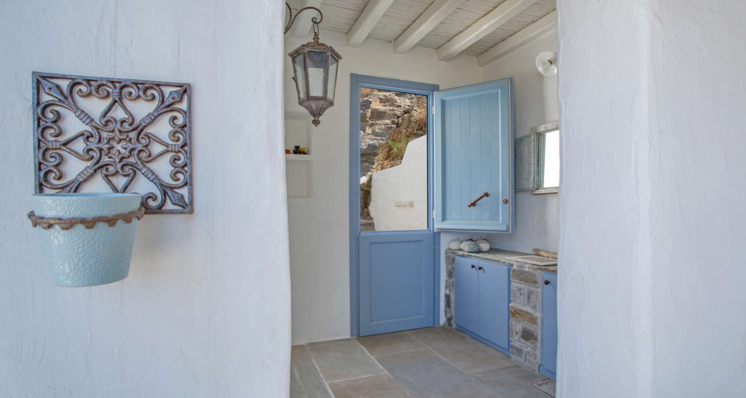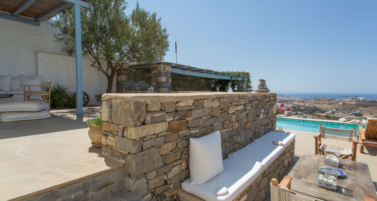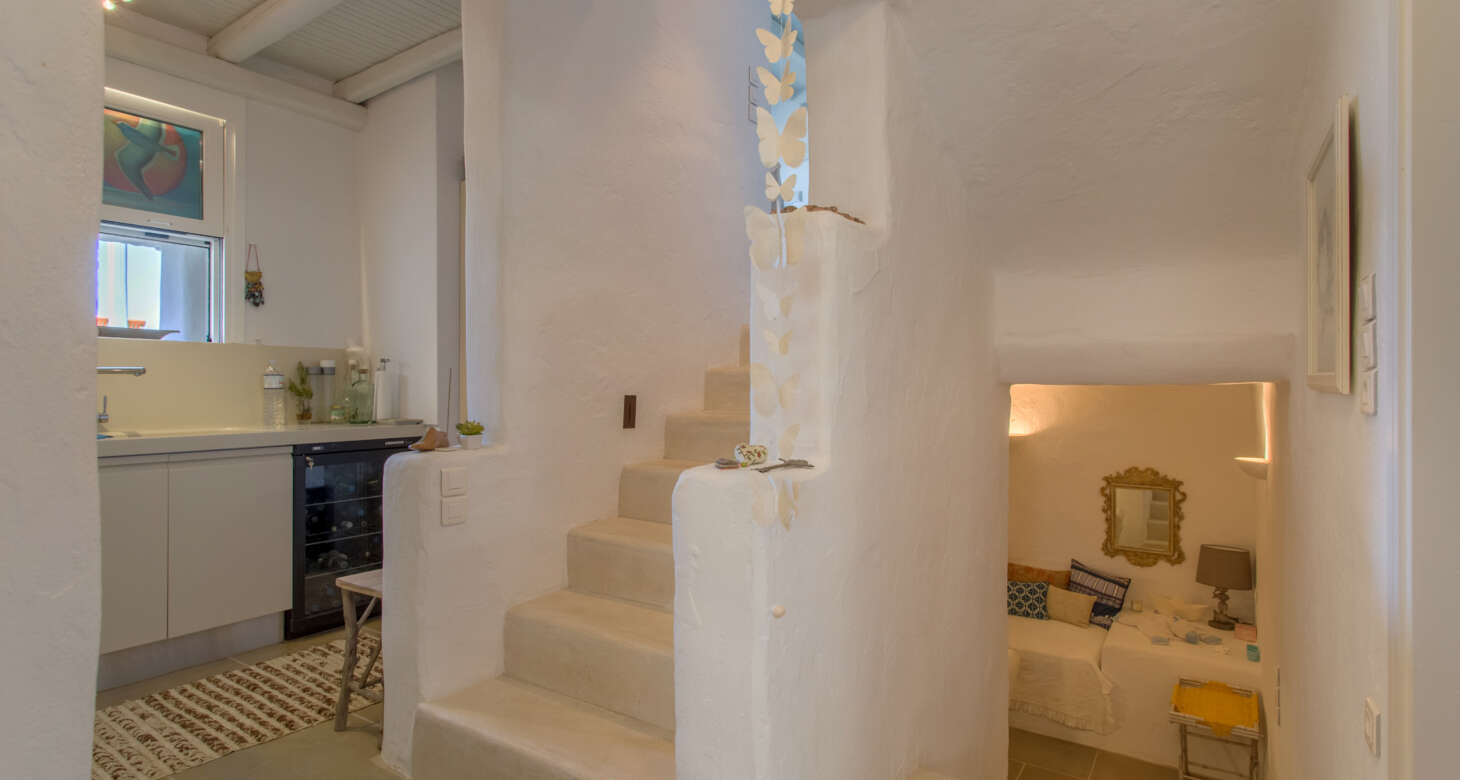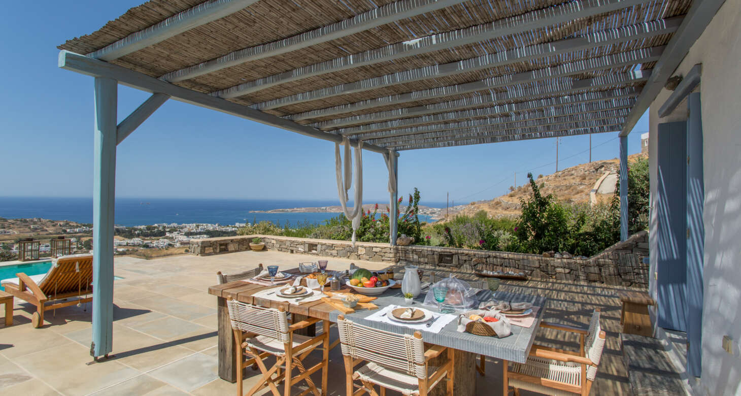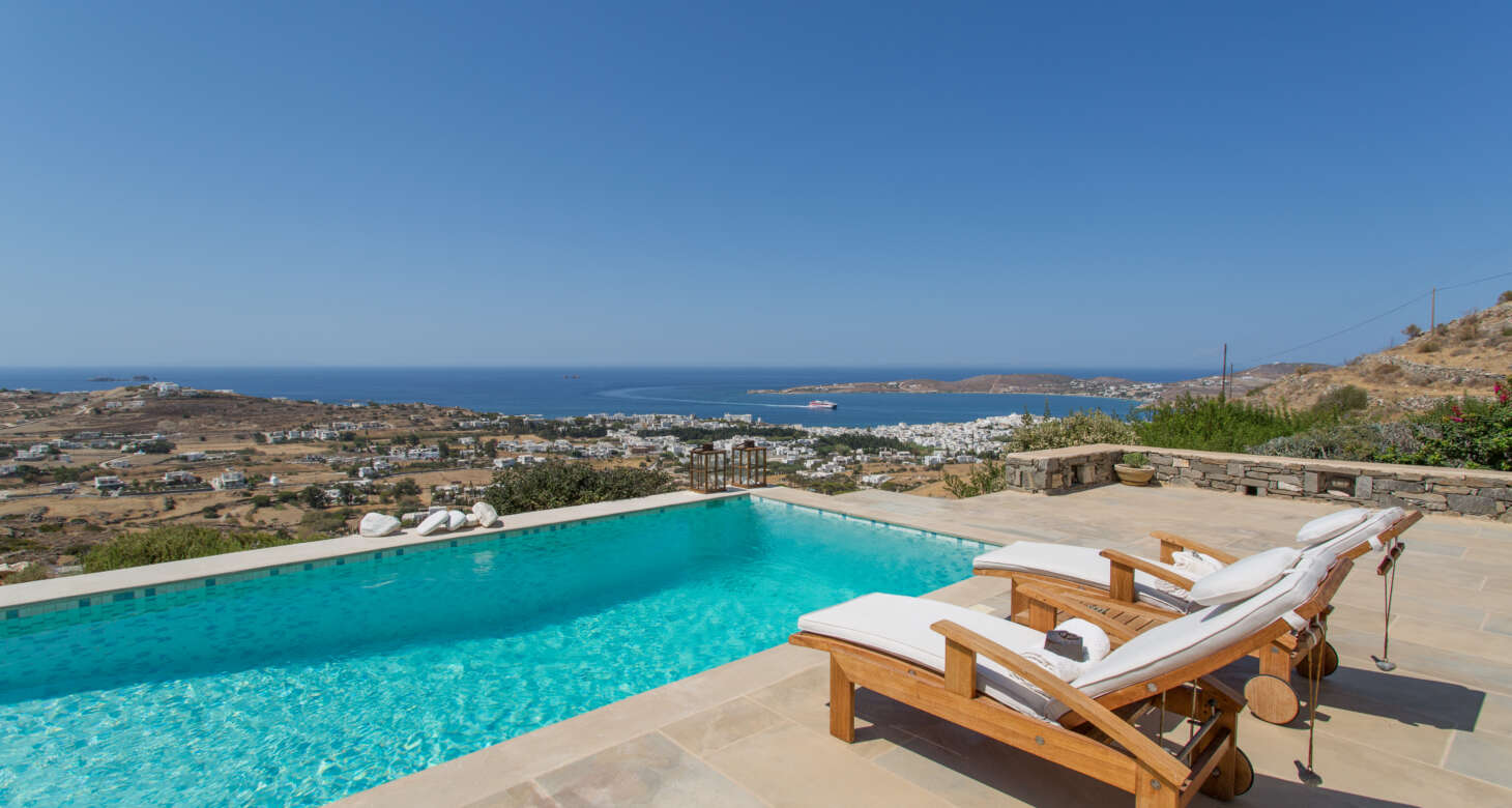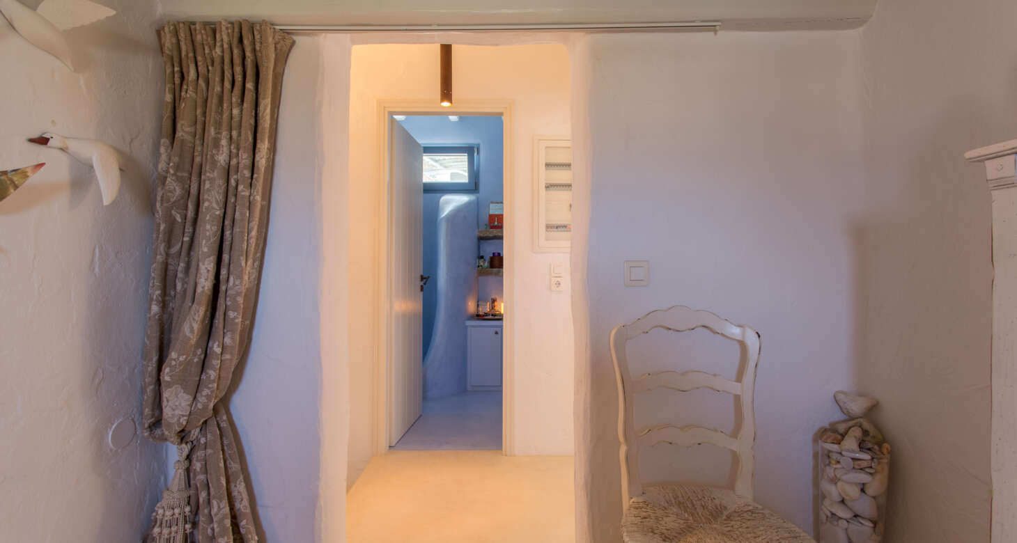 The stunning Villa Gold in Taxiarchaki Paroikia, seamlessly blends traditional island style with modern sophistication. The villa boasts wooden beam ceilings and white-washed walls, adding to the classic Greek island charm. The floors are made of cement mortar, giving the home a contemporary edge.