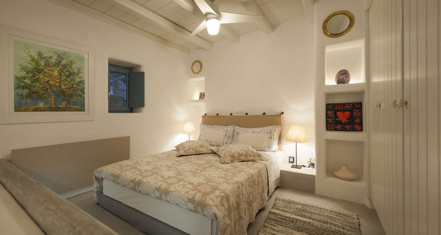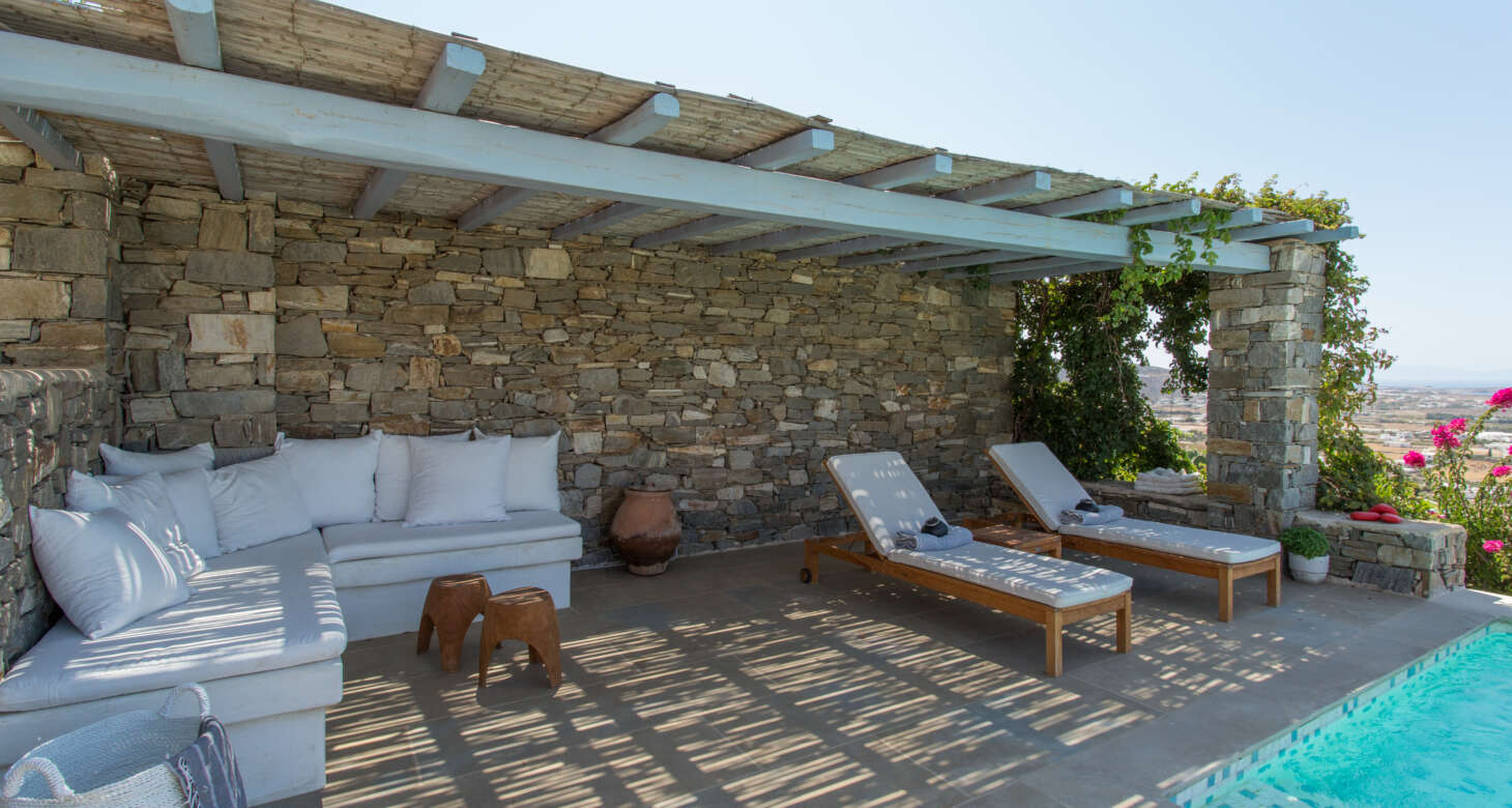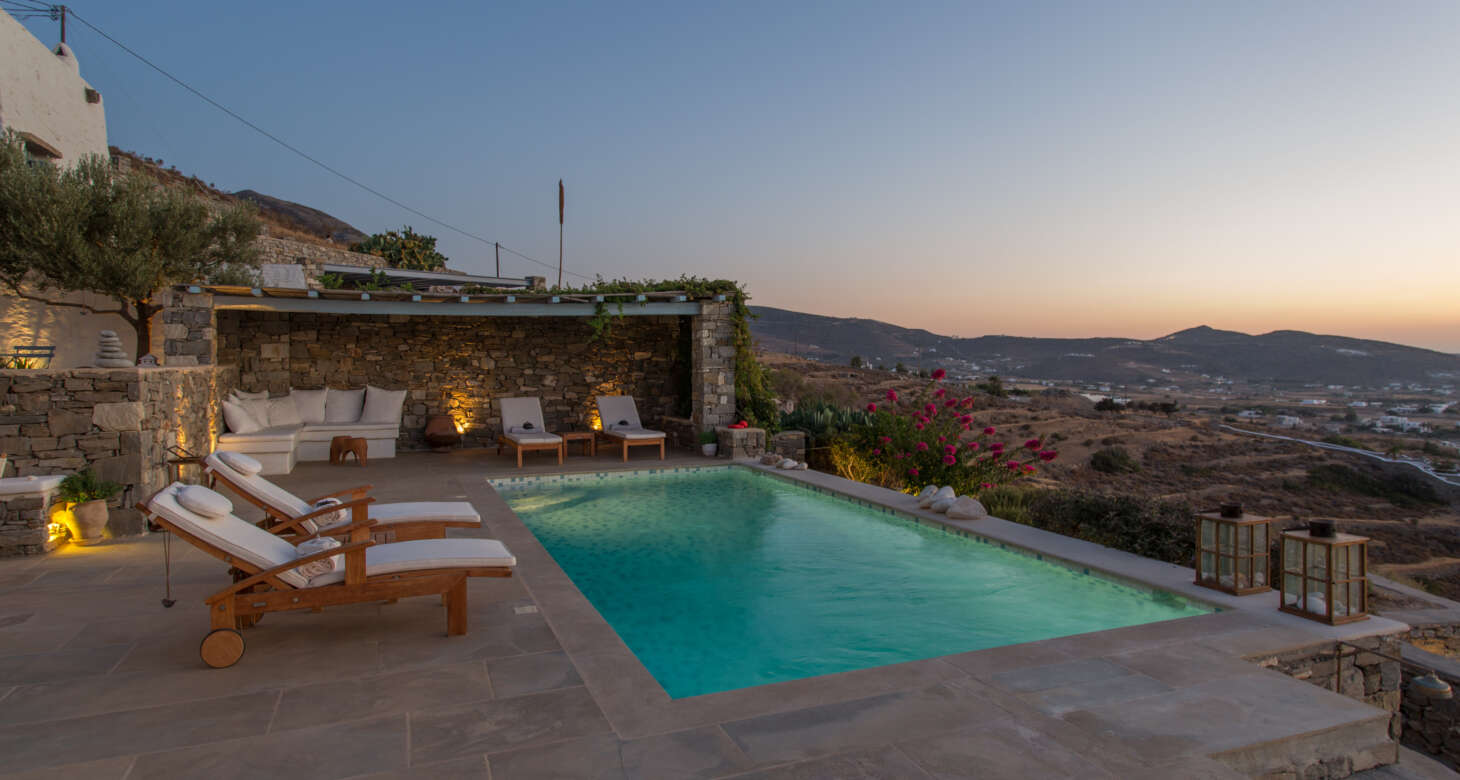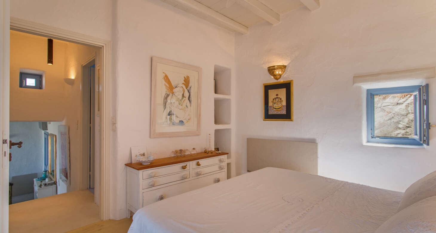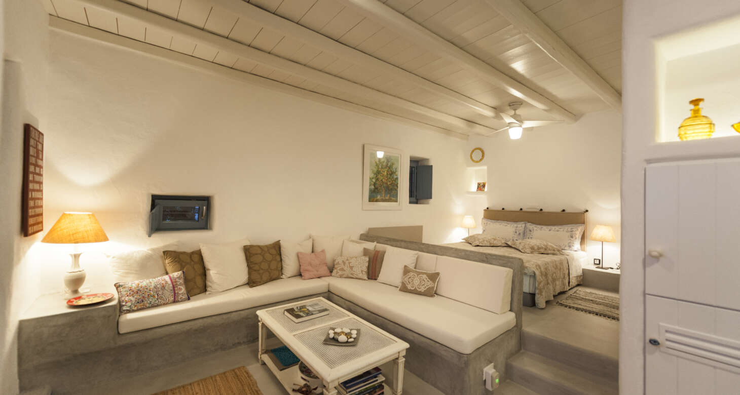 The stunning Villa Gold in Taxiarchaki Paroikia, seamlessly blends traditional island style with modern sophistication. The villa boasts wooden beam ceilings and white-washed walls, adding to the classic Greek island charm. The floors are made of cement mortar, giving the home a contemporary edge.