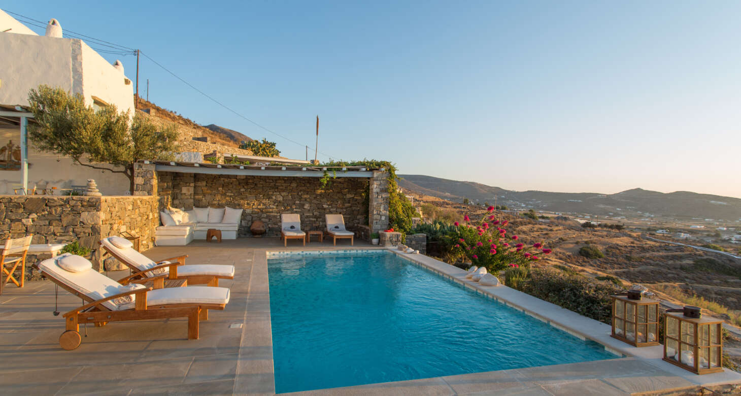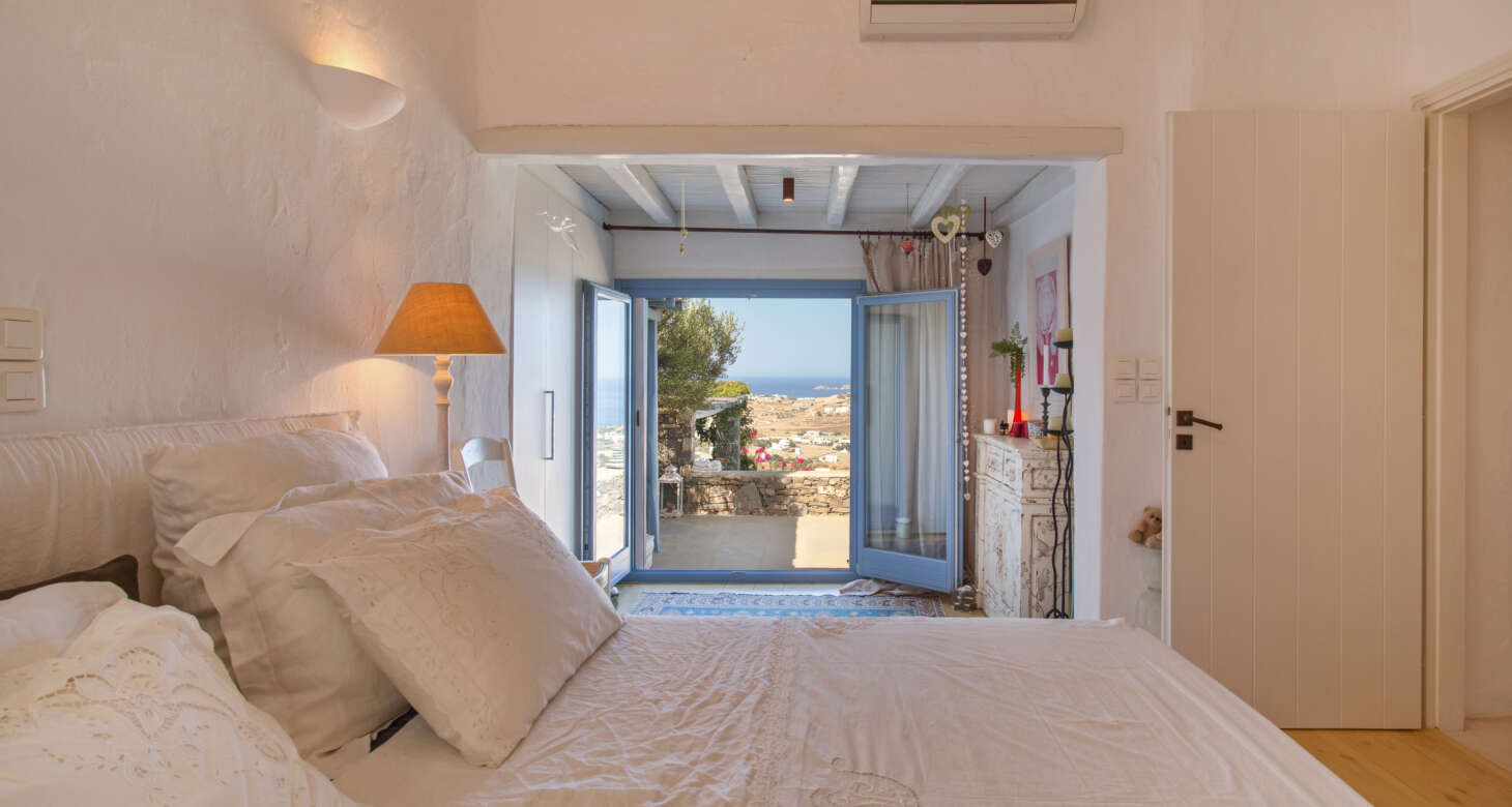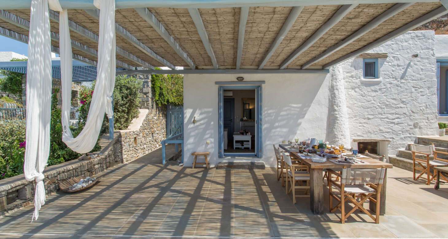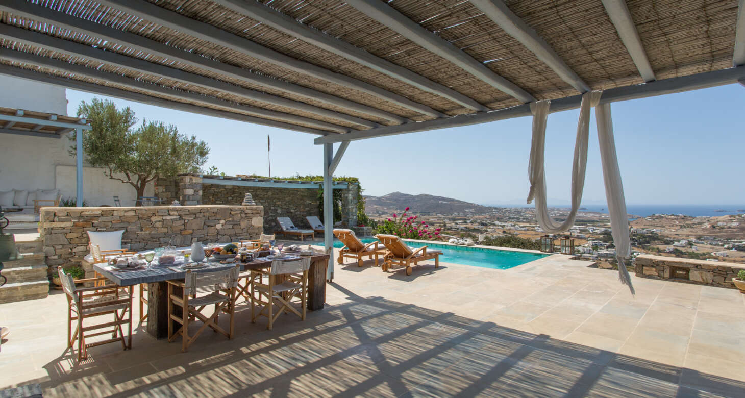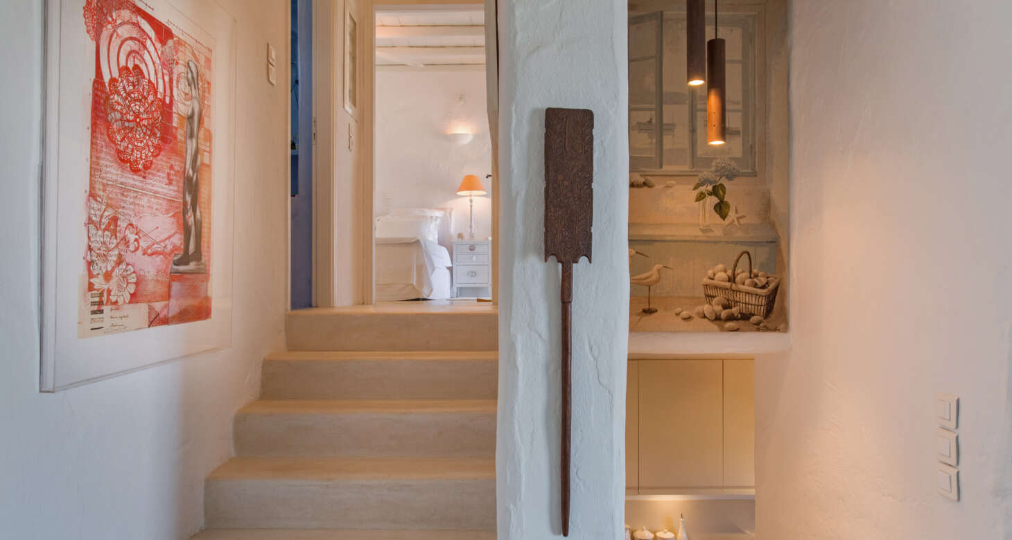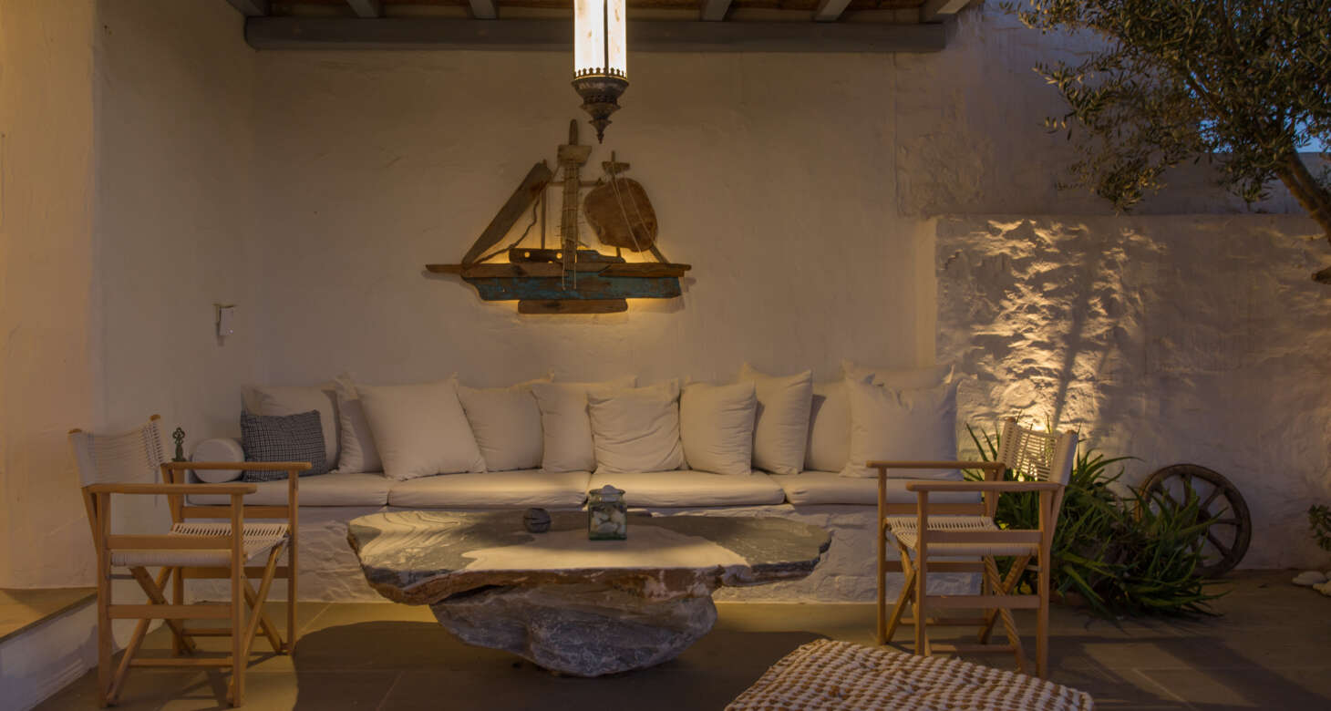 The stunning Villa Gold in Taxiarchaki Paroikia, seamlessly blends traditional island style with modern sophistication. The villa boasts wooden beam ceilings and white-washed walls, adding to the classic Greek island charm. The floors are made of cement mortar, giving the home a contemporary edge.