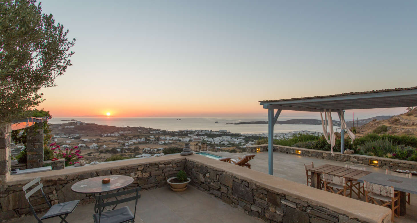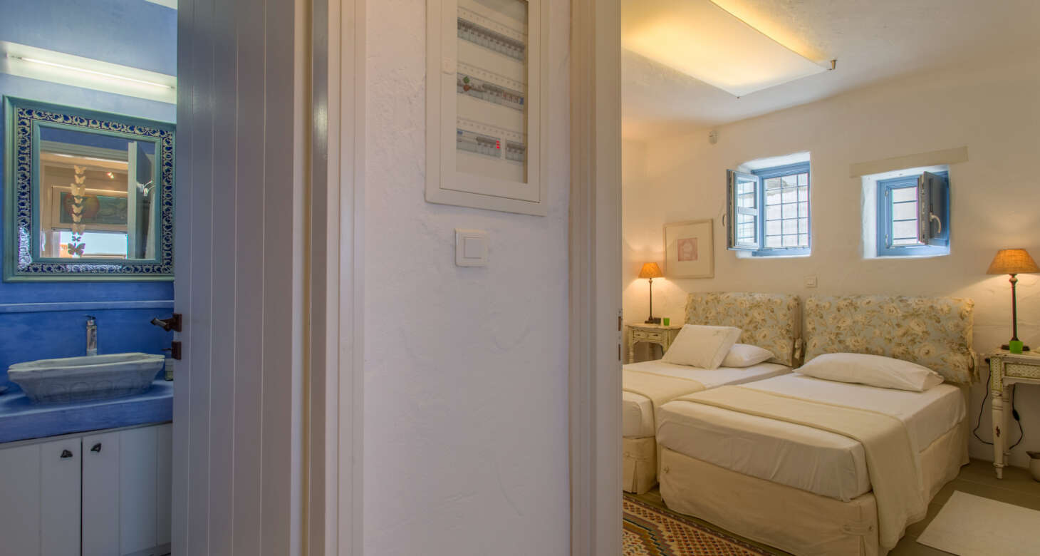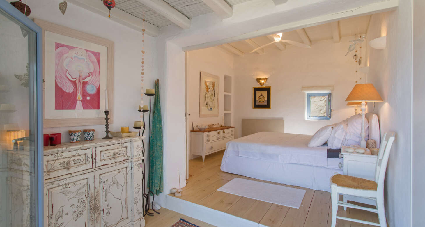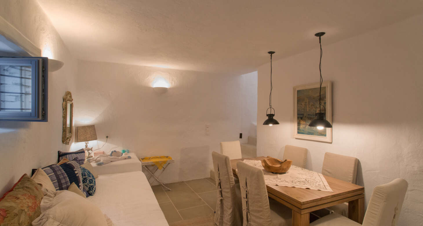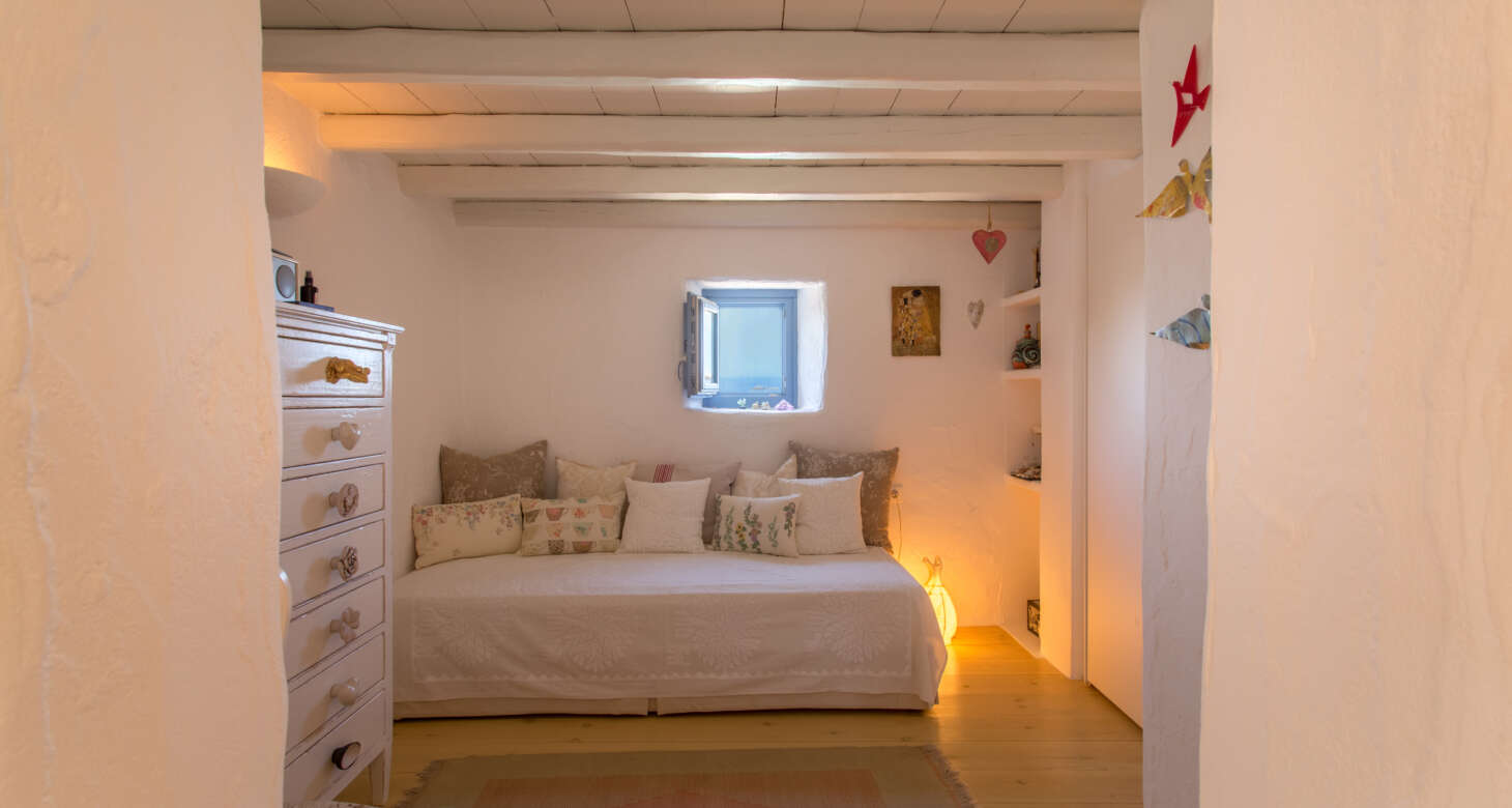 The stunning Villa Gold in Taxiarchaki Paroikia, seamlessly blends traditional island style with modern sophistication. The villa boasts wooden beam ceilings and white-washed walls, adding to the classic Greek island charm. The floors are made of cement mortar, giving the home a contemporary edge.