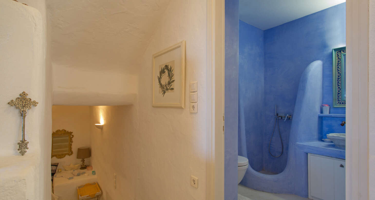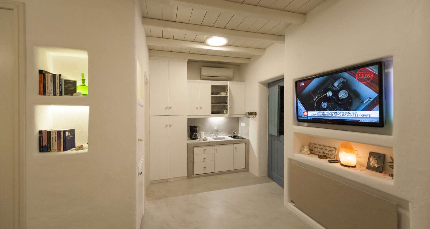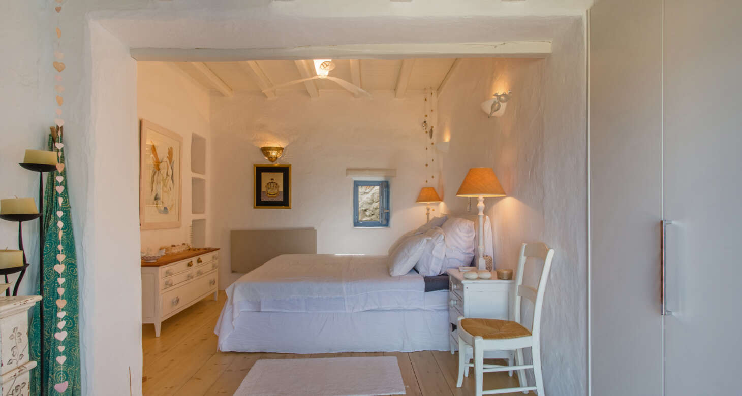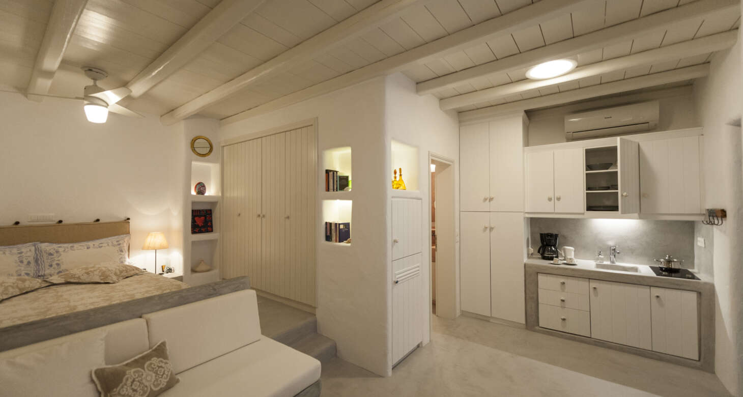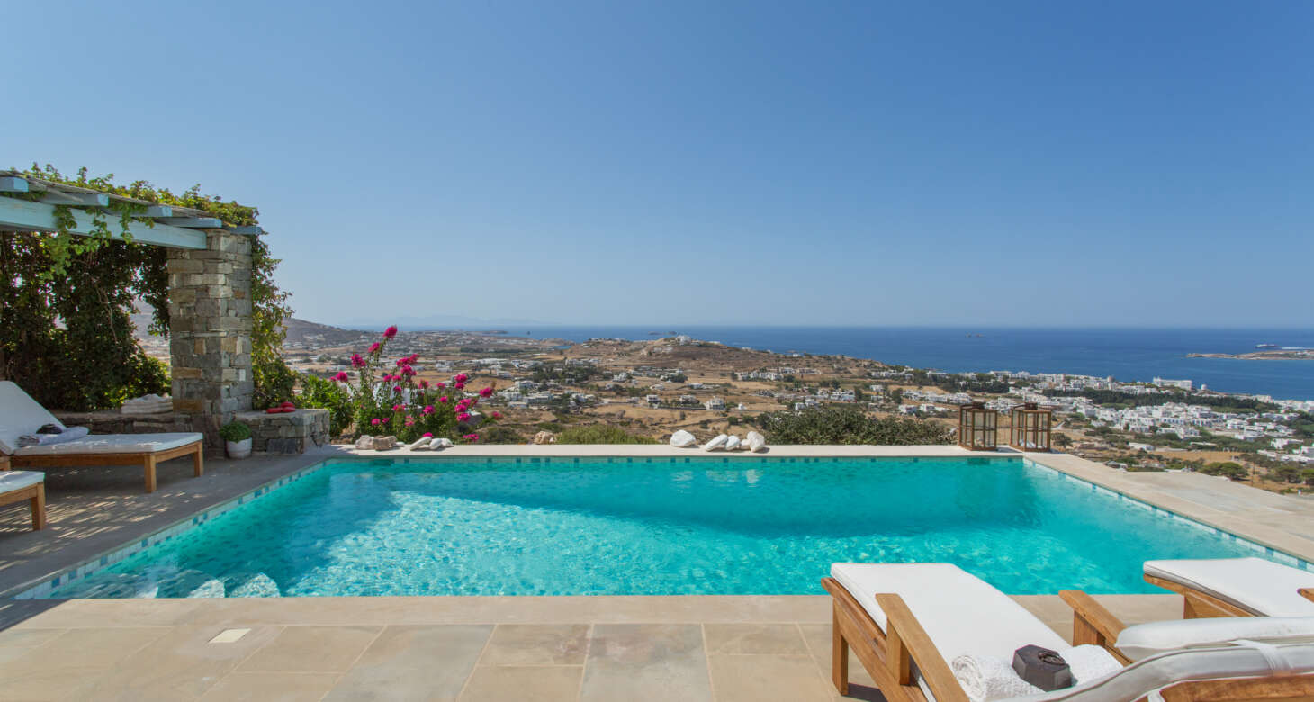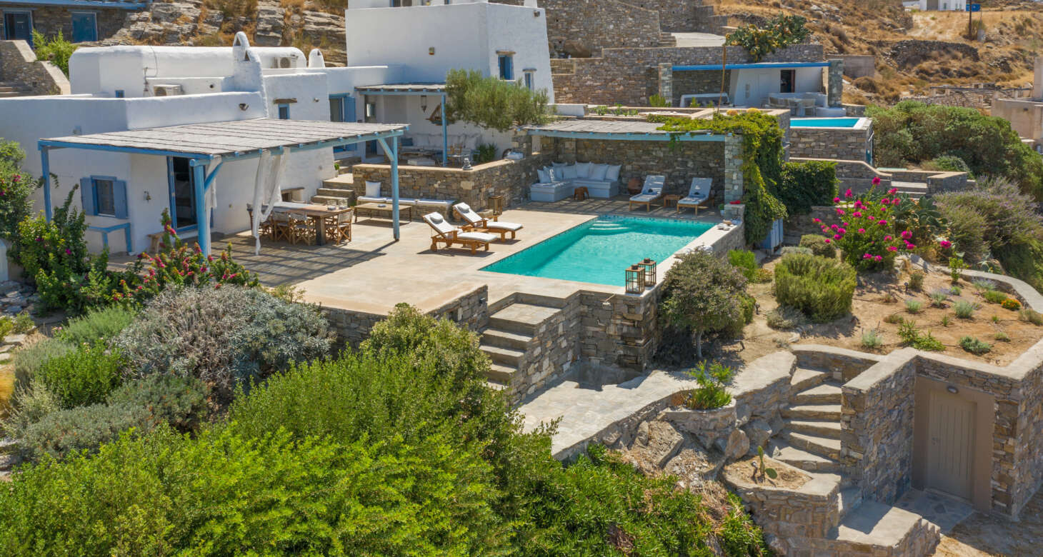 The stunning Villa Gold in Taxiarchaki Paroikia, seamlessly blends traditional island style with modern sophistication. The villa boasts wooden beam ceilings and white-washed walls, adding to the classic Greek island charm. The floors are made of cement mortar, giving the home a contemporary edge.