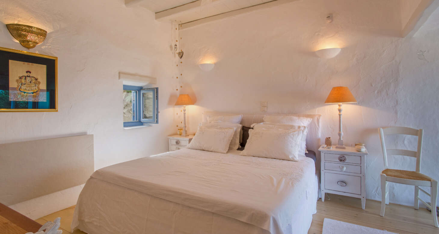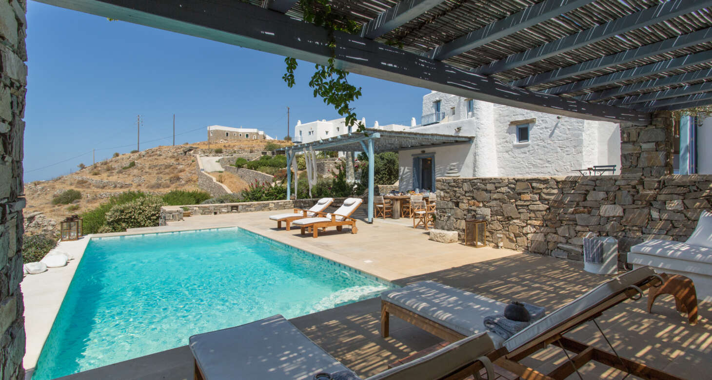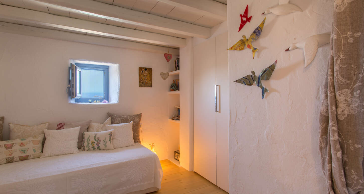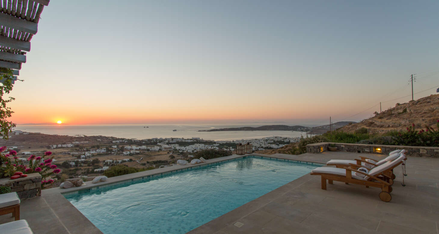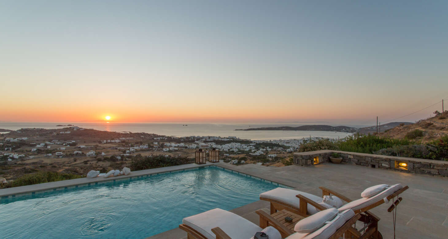 The stunning Villa Gold in Taxiarchaki Paroikia, seamlessly blends traditional island style with modern sophistication. The villa boasts wooden beam ceilings and white-washed walls, adding to the classic Greek island charm. The floors are made of cement mortar, giving the home a contemporary edge.