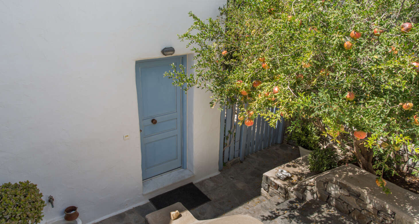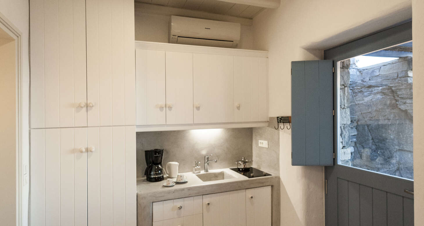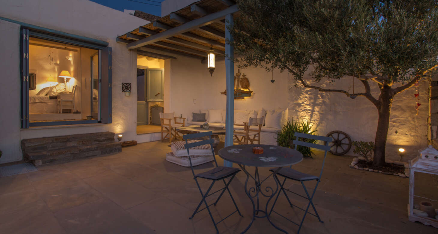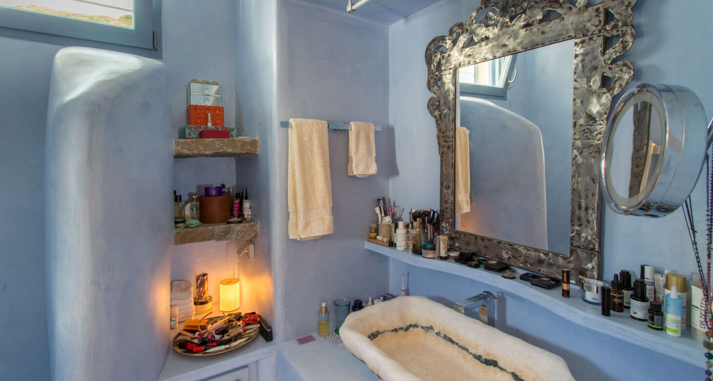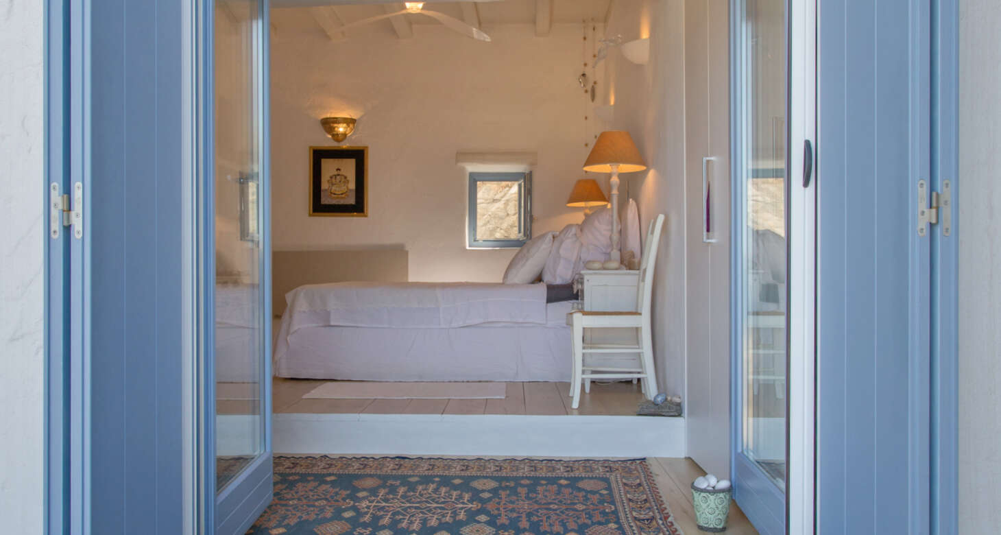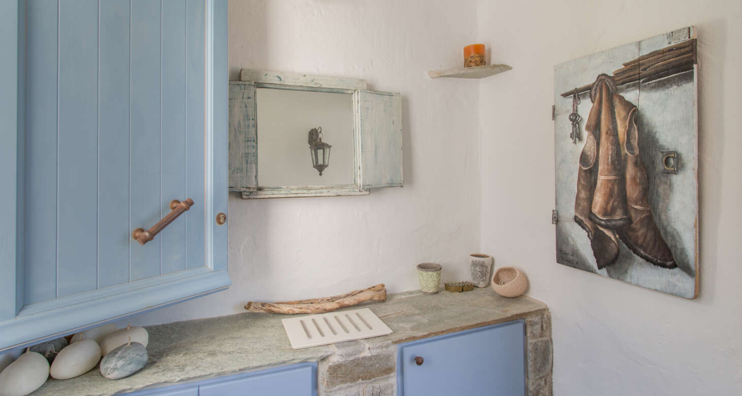 The stunning Villa Gold in Taxiarchaki Paroikia, seamlessly blends traditional island style with modern sophistication. The villa boasts wooden beam ceilings and white-washed walls, adding to the classic Greek island charm. The floors are made of cement mortar, giving the home a contemporary edge.