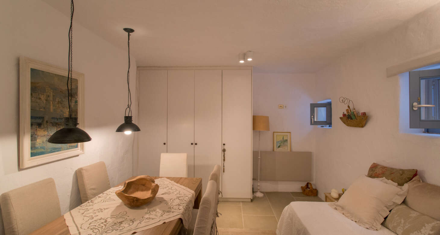 The main house includes a double bedroom and an additional space with a single bed, perfect for a couple with a small child. The villa also includes a bedroom with two single beds, an extra living room with a sofa bed, and a dining table for relaxation.