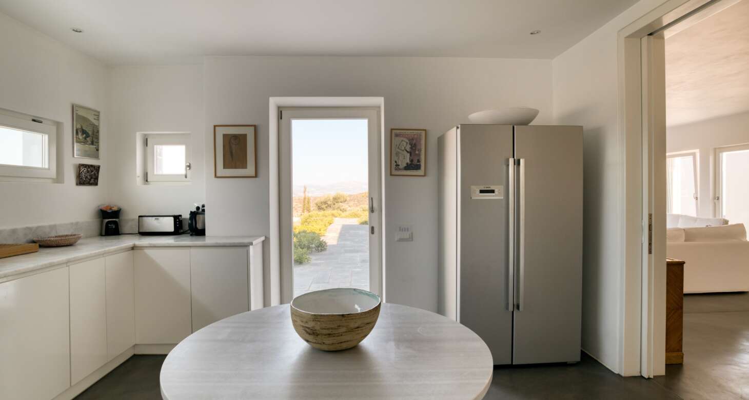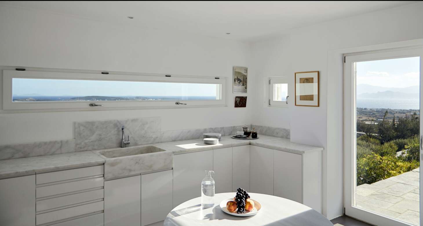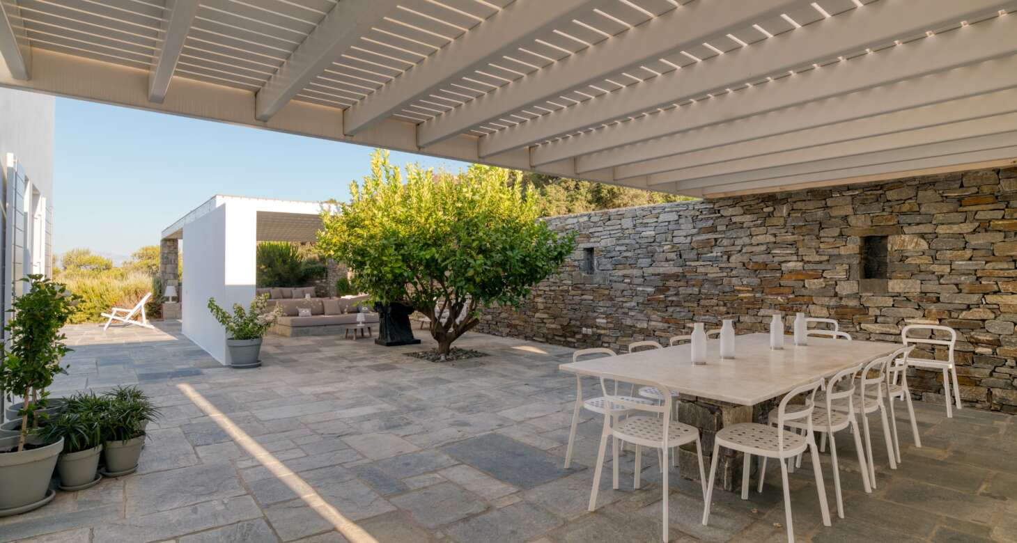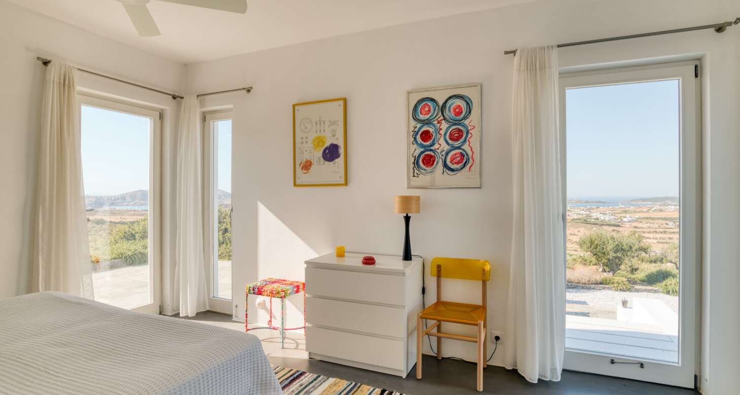 The villa features five bedrooms, each equipped with air conditioning and strategically isolated from the rest of the house to provide maximum comfort and privacy. The kitchen, dining area, and lounge space are separate from the bedrooms and offer panoramic views of the pool, sea, and the neighboring island of Naxos. Large sliding glass doors can be opened to let in the refreshing sea breeze. The dining table comfortably accommodates ten people, and the fully equipped kitchen provides everything you need to prepare delicious meals and drinks for everyone.