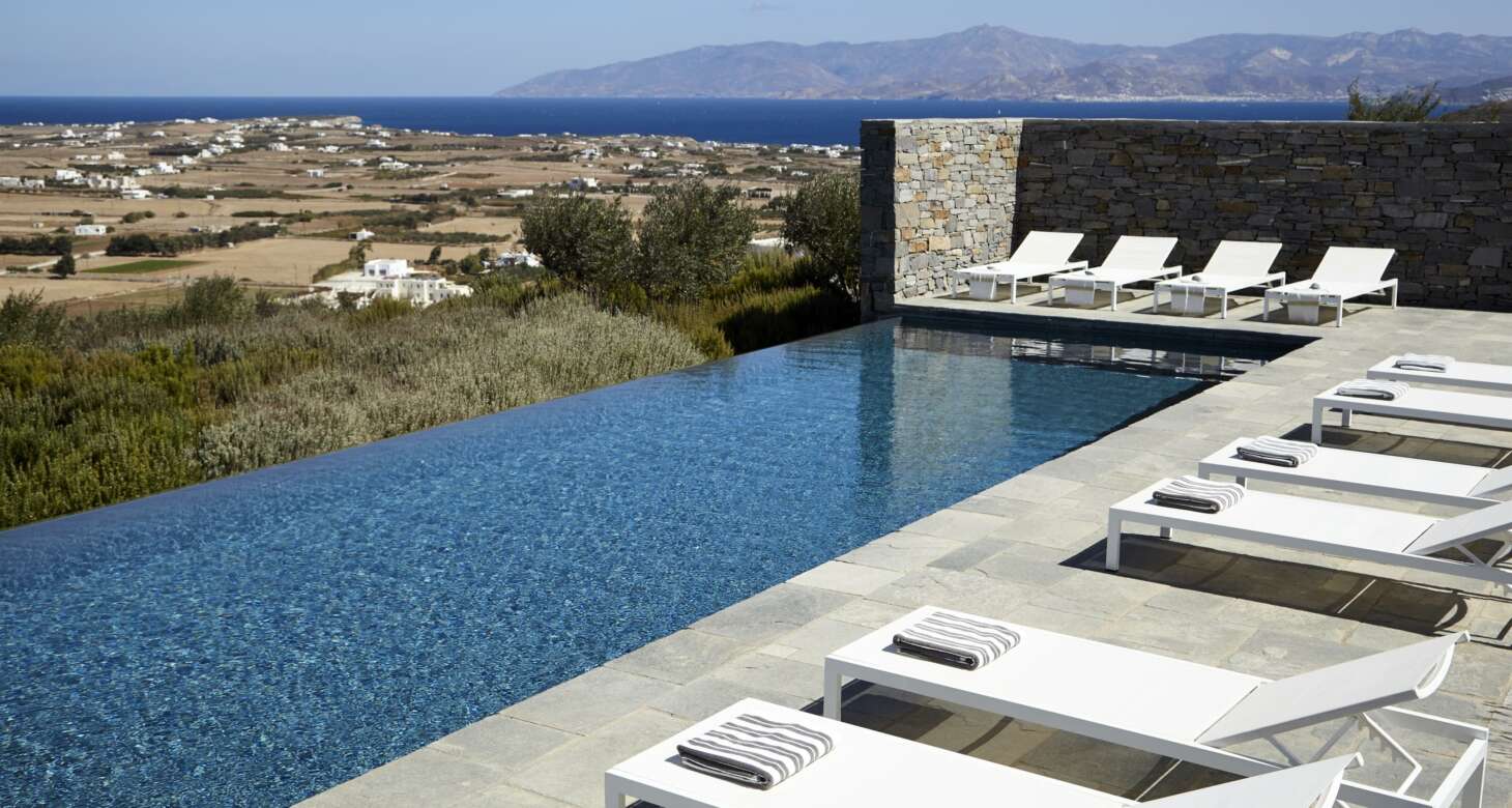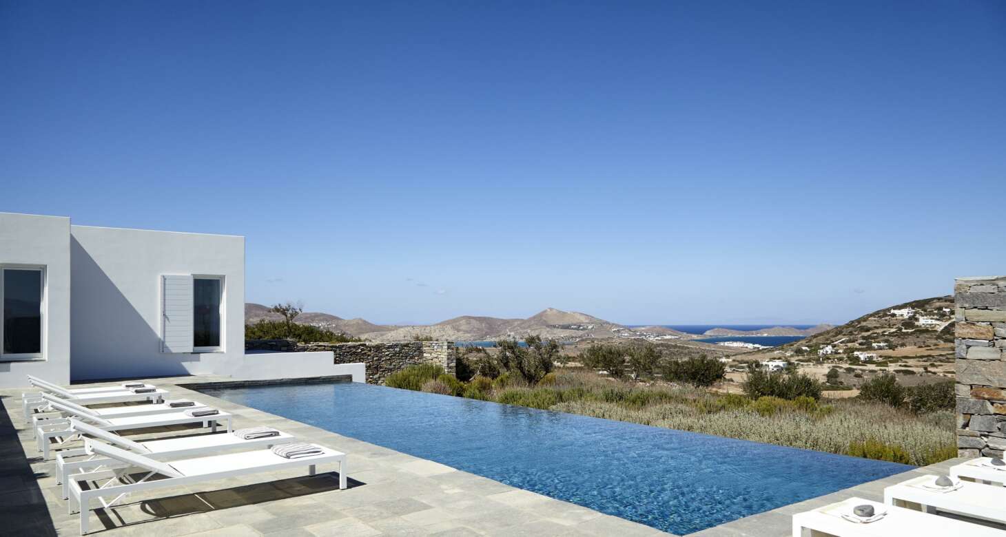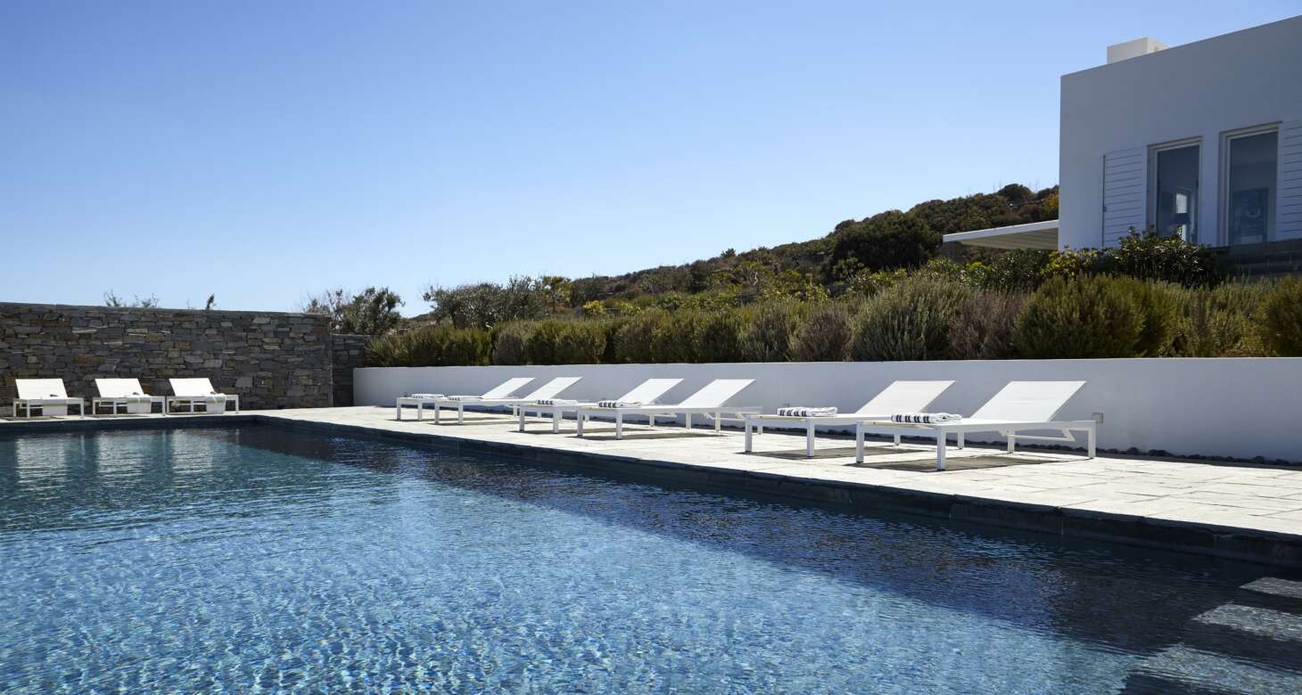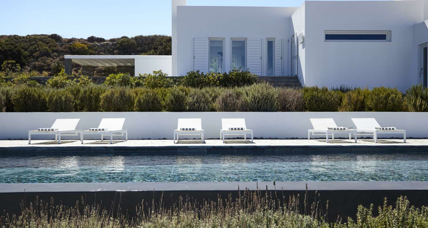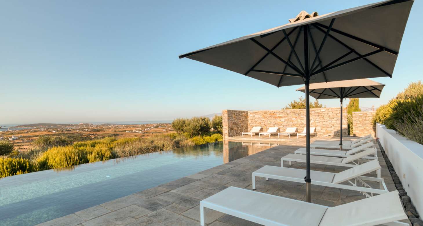 The villa features five bedrooms, each equipped with air conditioning and strategically isolated from the rest of the house to provide maximum comfort and privacy. The kitchen, dining area, and lounge space are separate from the bedrooms and offer panoramic views of the pool, sea, and the neighboring island of Naxos. Large sliding glass doors can be opened to let in the refreshing sea breeze. The dining table comfortably accommodates ten people, and the fully equipped kitchen provides everything you need to prepare delicious meals and drinks for everyone.