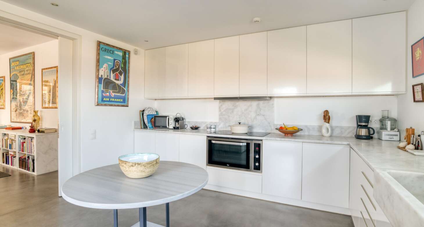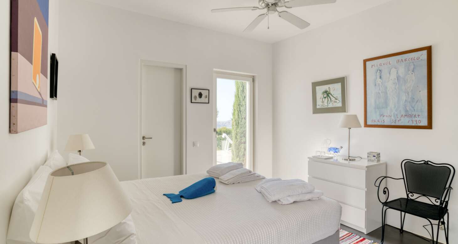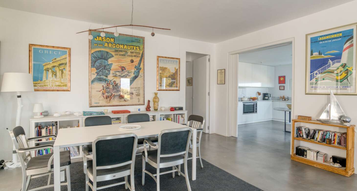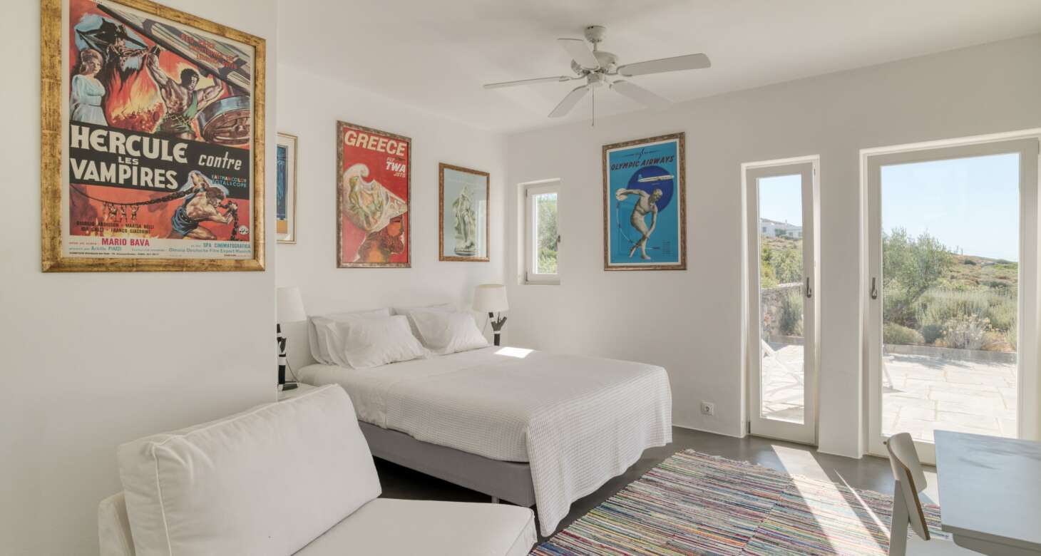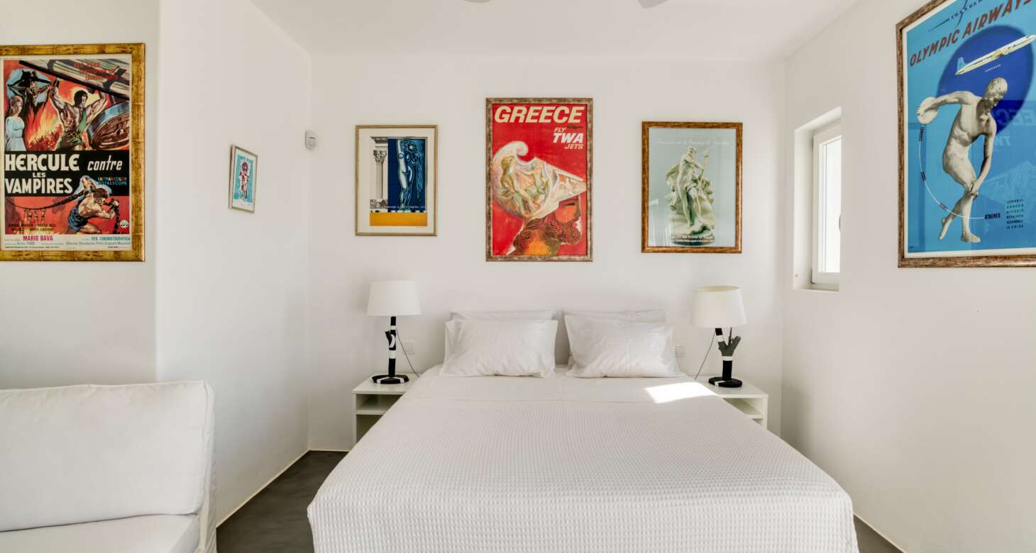 Owned by a renowned French auctioneer, Villa Arte is not only a retreat but also a museum-like space adorned with art pieces throughout the house. With movie posters, statues, and modern architectural lines, the villa exudes a unique and contemporary ambiance. The decor is minimalist, featuring white furnishings and traditional cement mortar flooring, creating a bright and airy atmosphere.