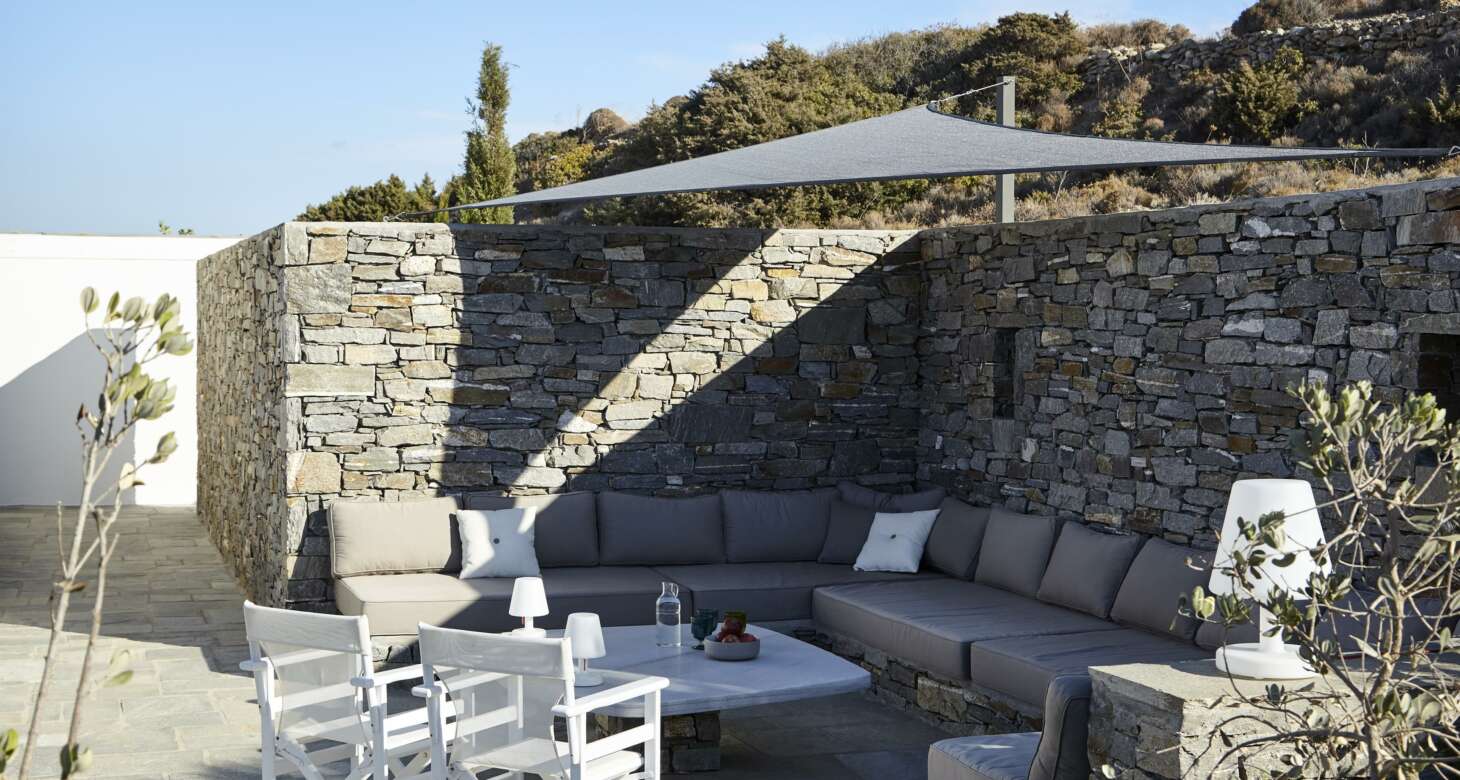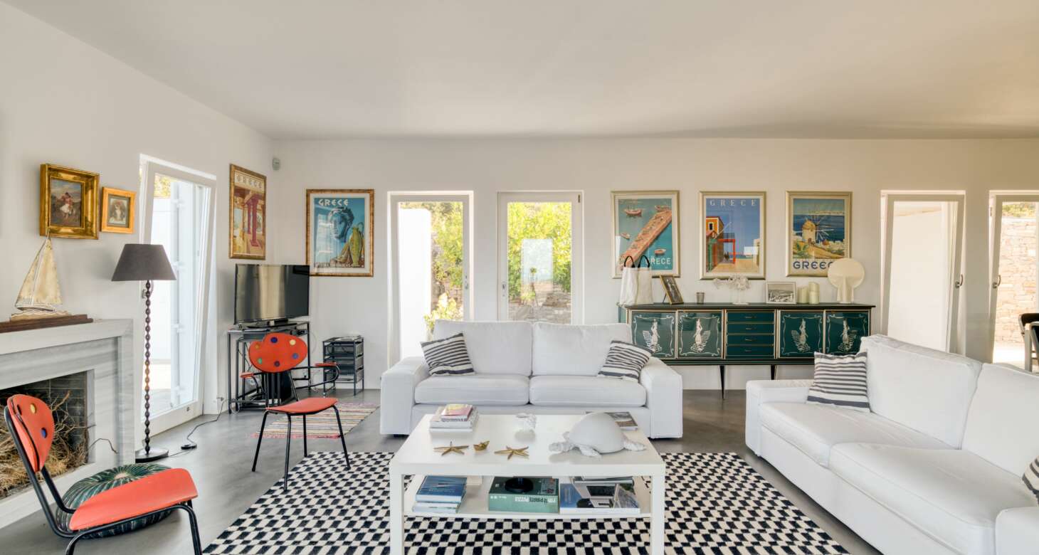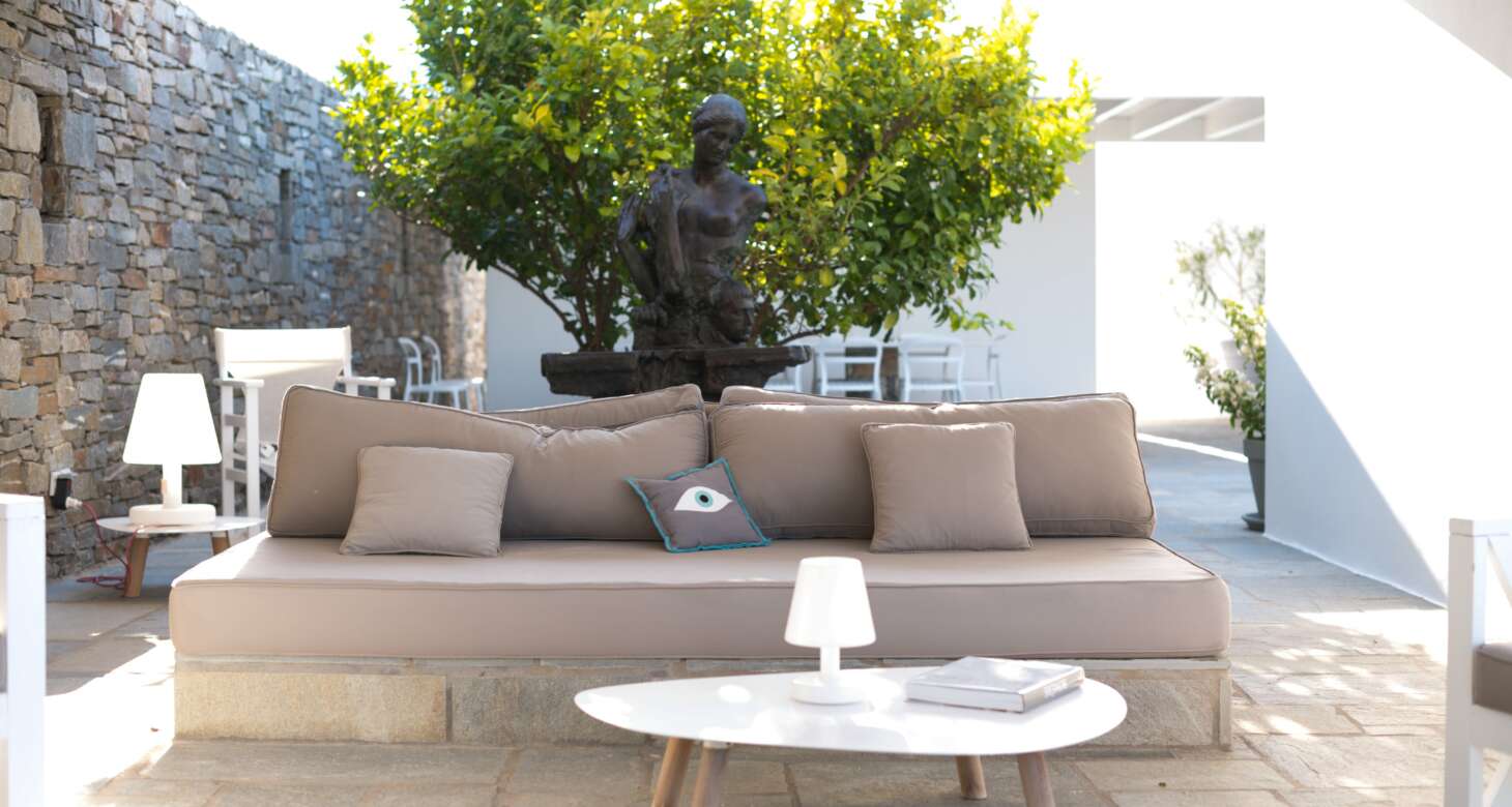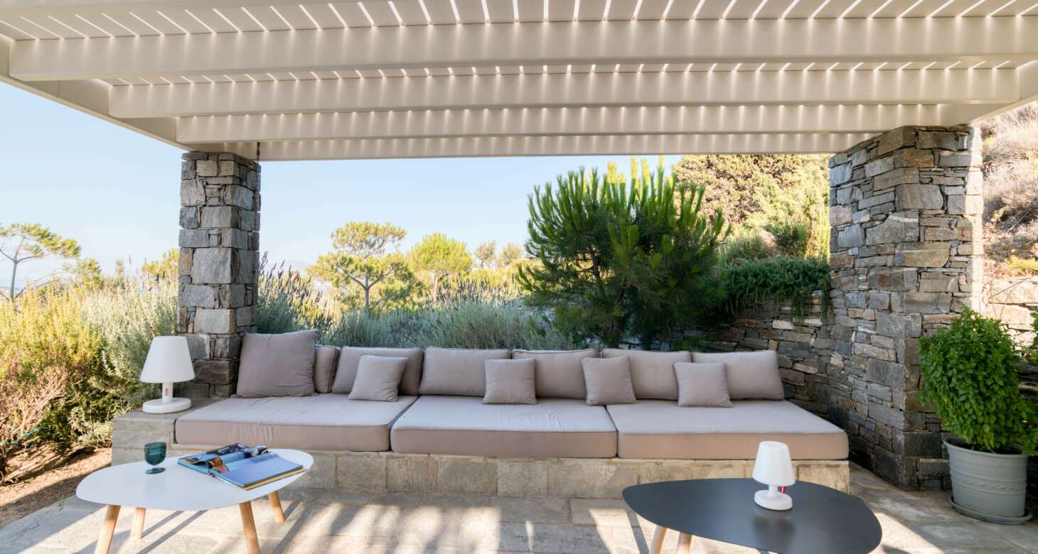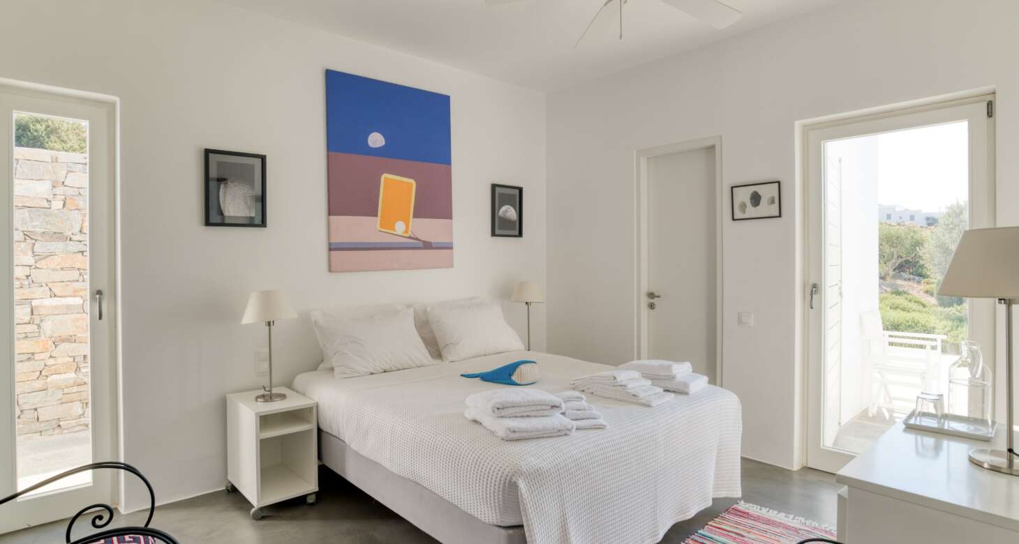 The highlight of Villa Arte is undoubtedly the pool area, offering stunning views of Paros’ coastline and an expansive garden. Whether you prefer sunbathing or relaxing in the shade, the pool area with its umbrella provides the perfect spot to unwind and soak up the beauty of the surroundings. Numerous sitting areas are scattered around the property, inviting you to enjoy a good book in the morning or sip a drink while witnessing the mesmerizing sunset.
