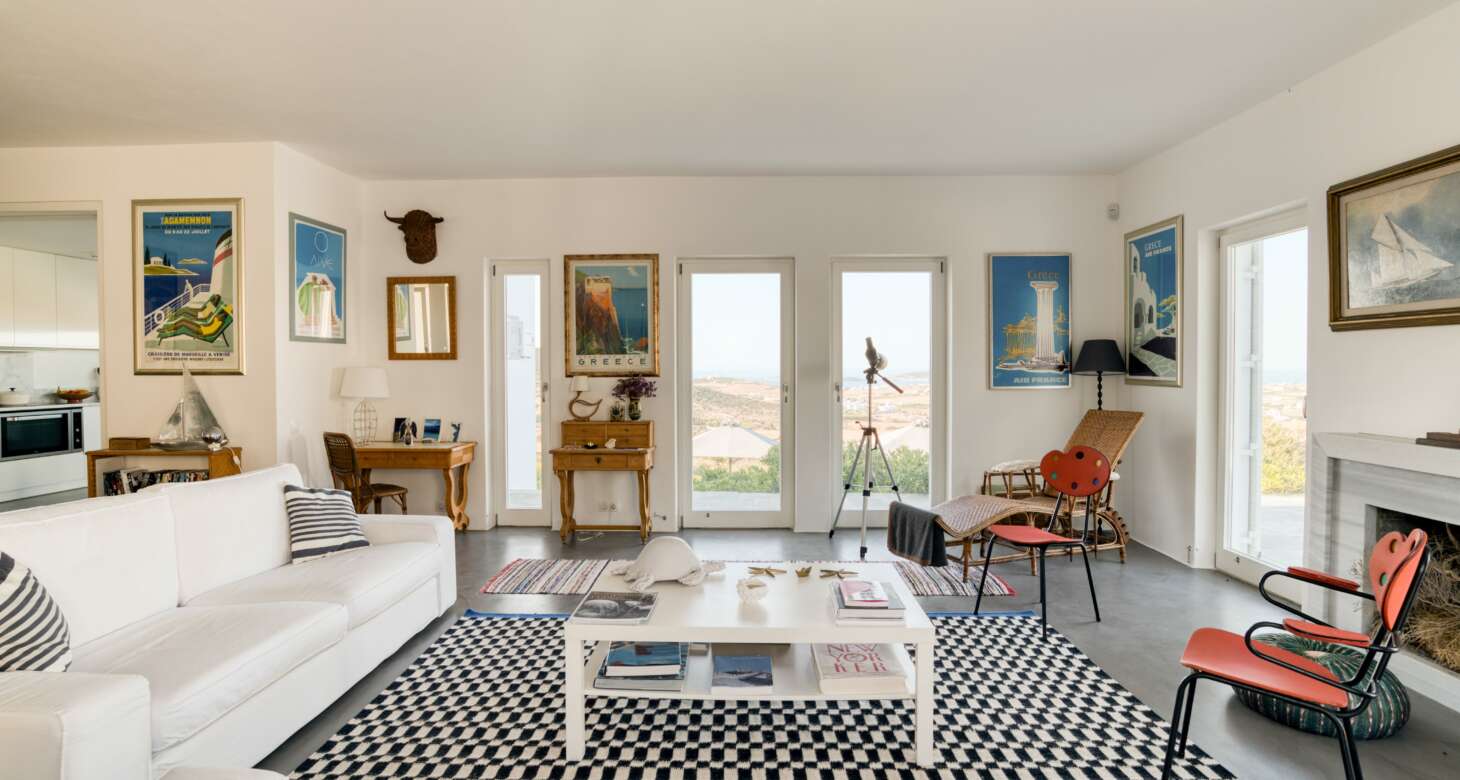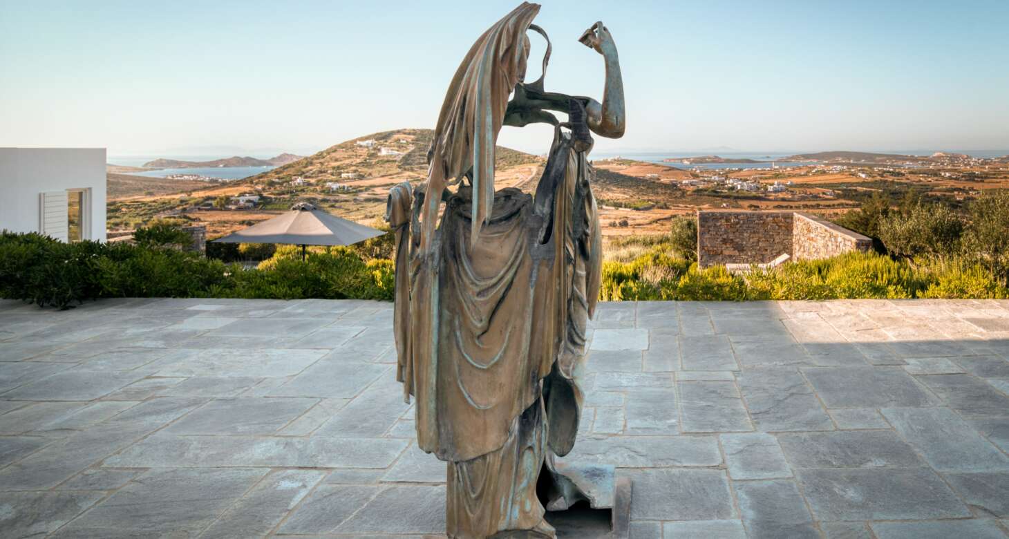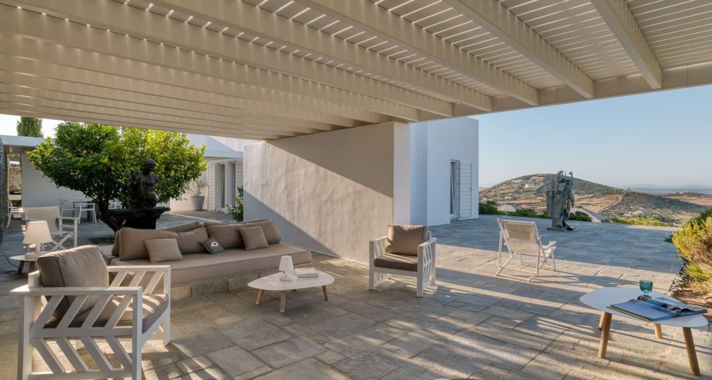 Welcome to Villa Arte, a traditional villa perched on a hilltop in the heart of Paros. With breathtaking views stretching across fields, charming whitewashed houses, and the sparkling Aegean Sea, this villa offers a picturesque setting. Designed to embrace outdoor living, you’ll find yourself spending most of your time lounging by the infinity pool or relaxing on a shaded sofa beneath a pergola. Multiple private terraces and patios allow guests to spread out and enjoy the serene surroundings, while striking metal sculptures add an artistic touch to the landscape.