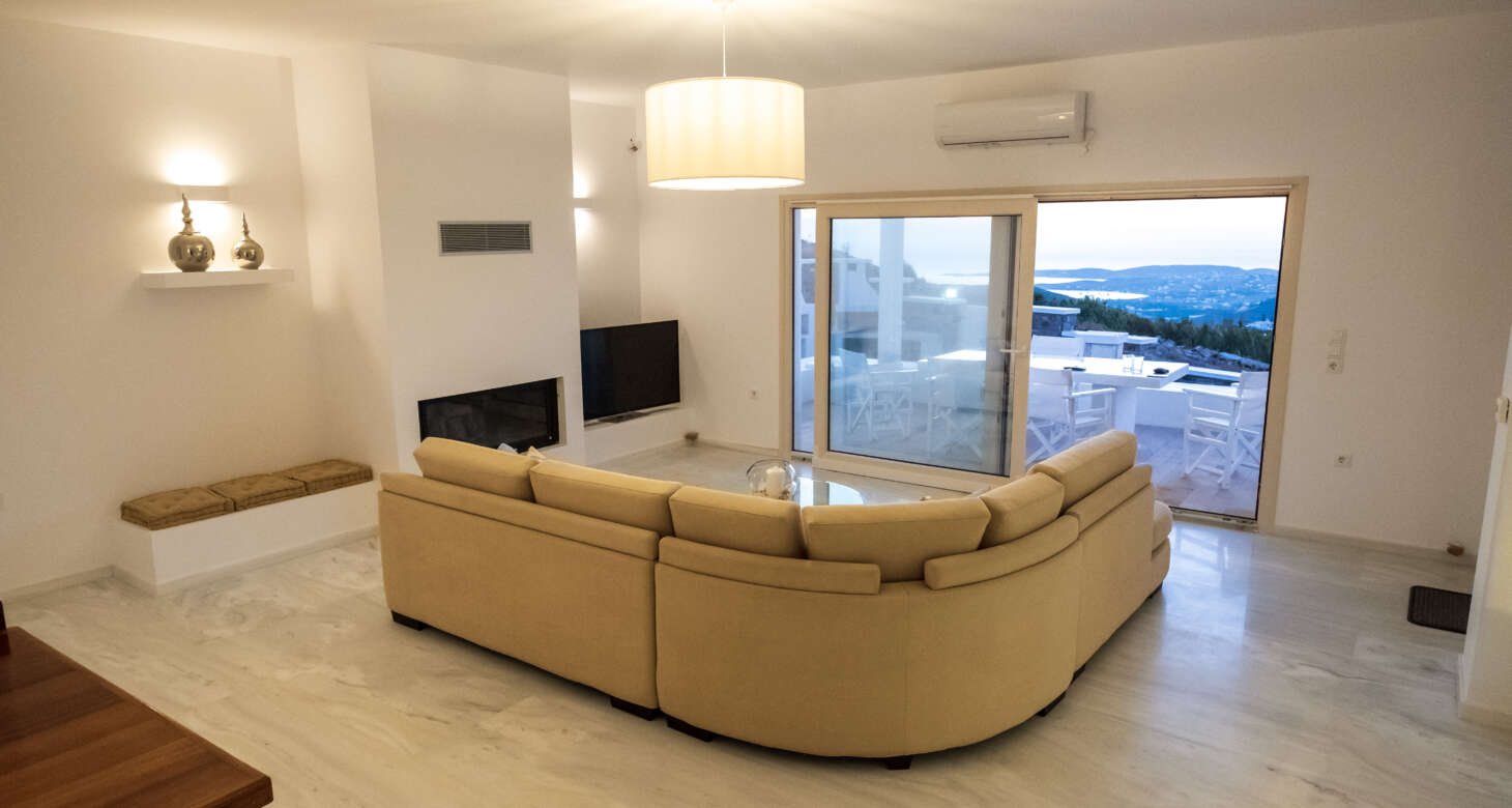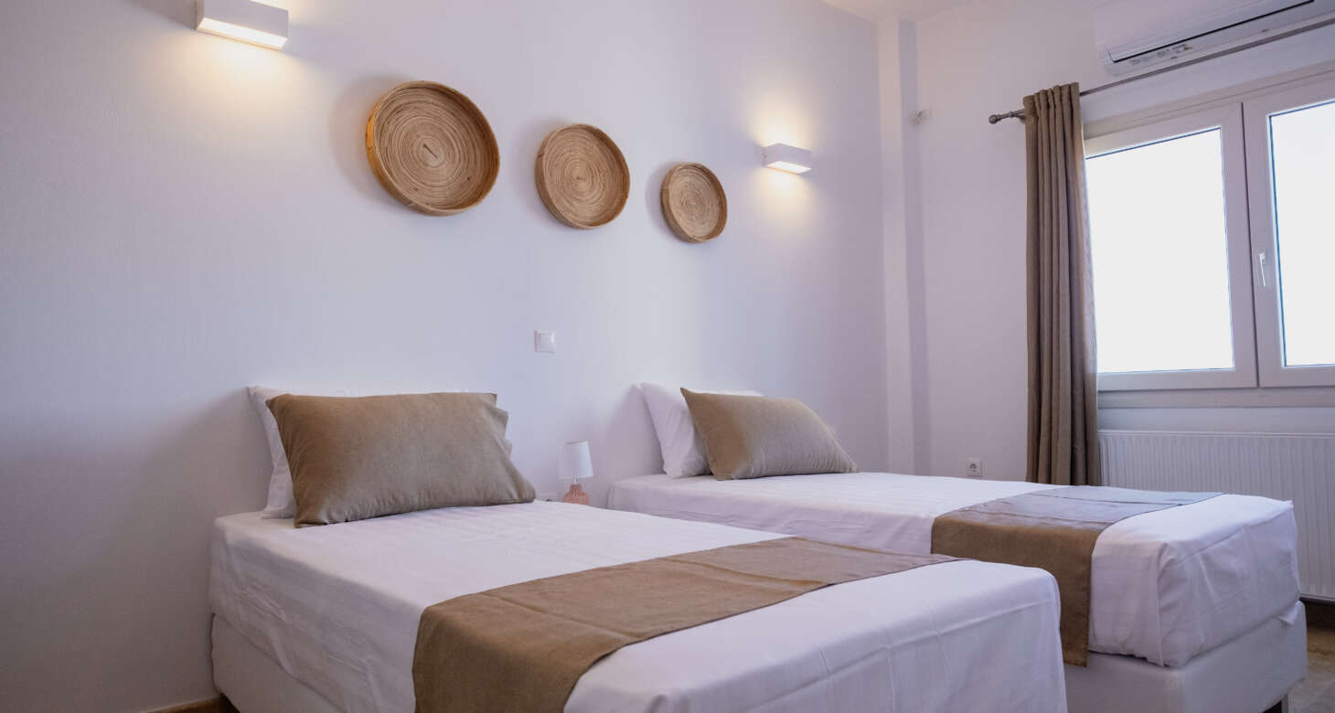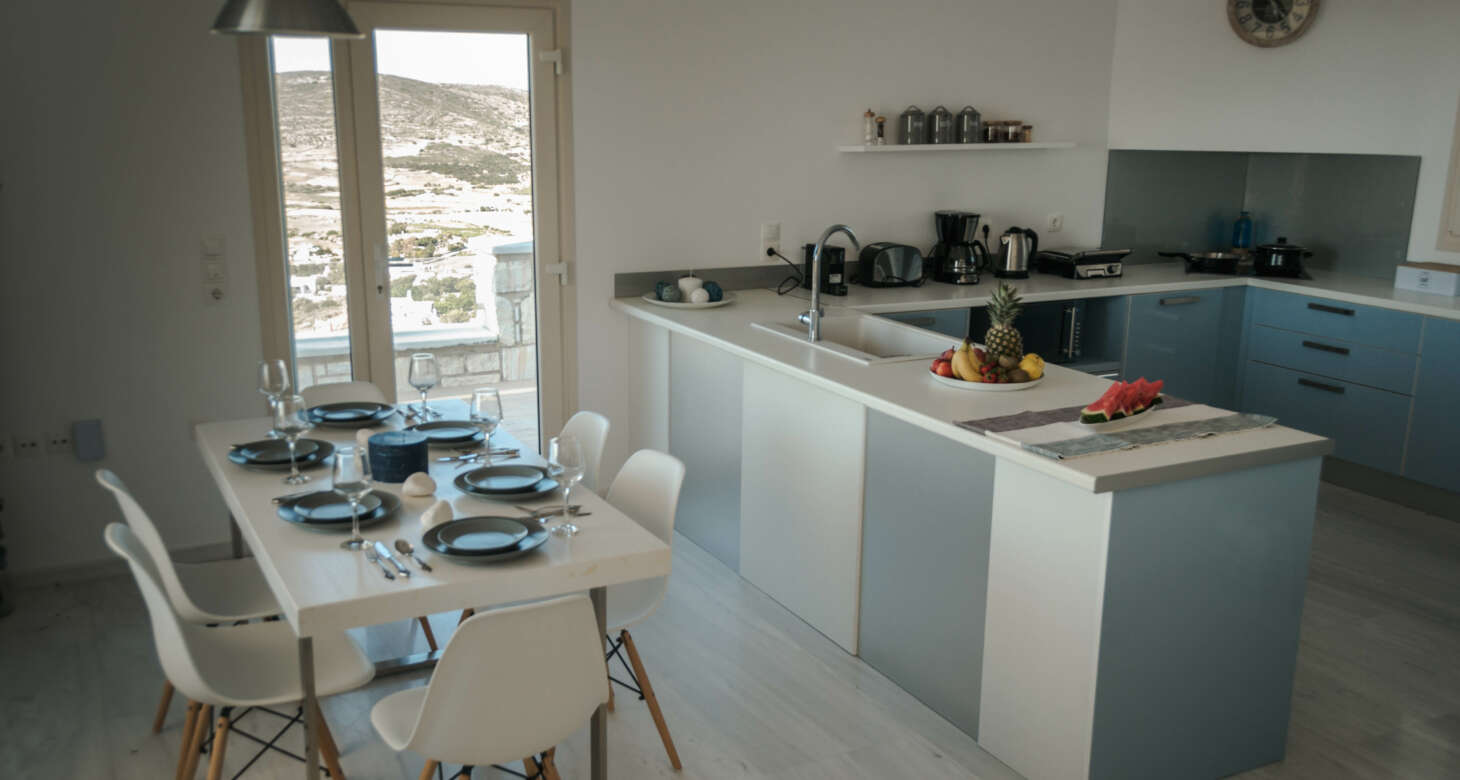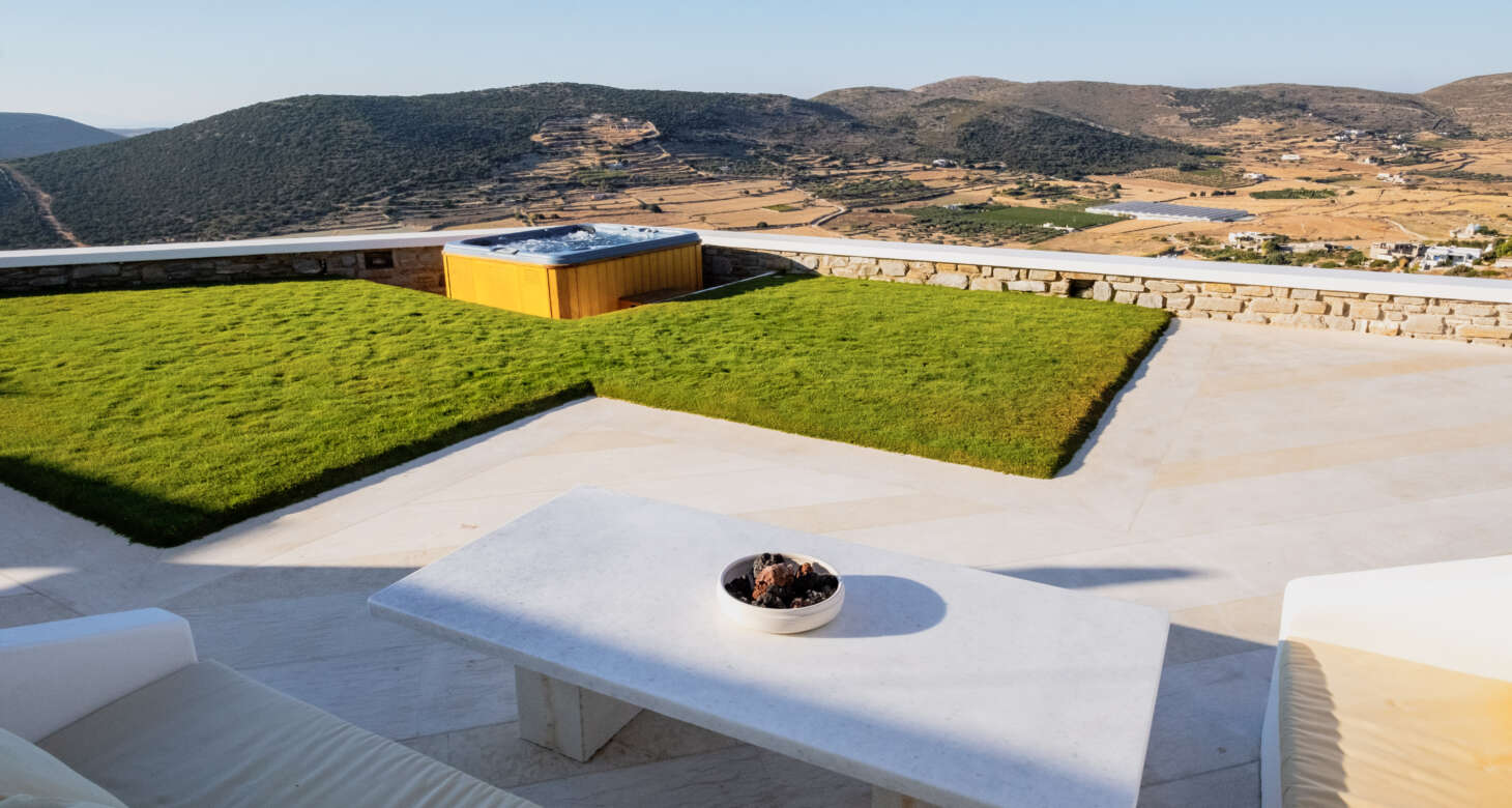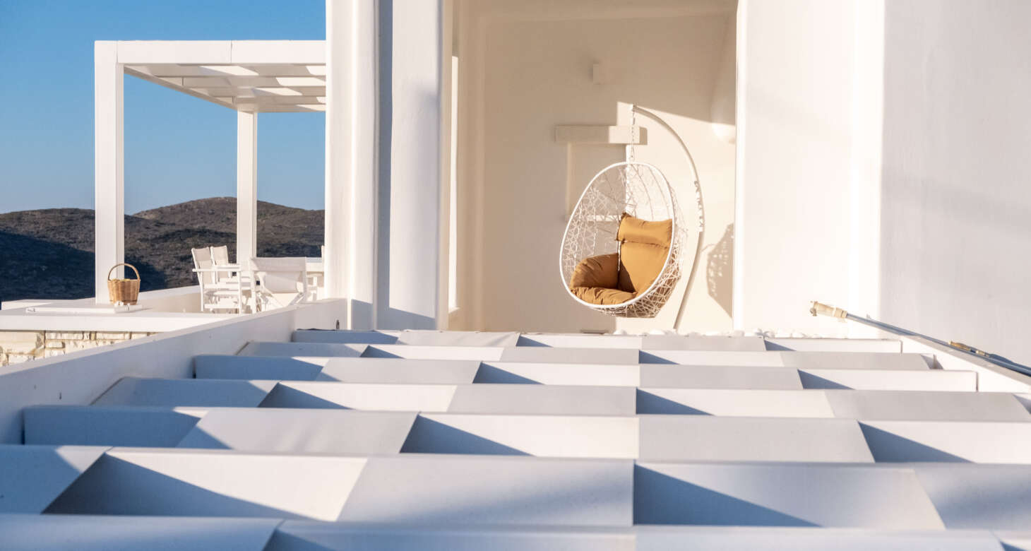 The villa boasts a captivating Cycladic geometrical design with a dominant white aesthetic, featuring high-quality materials. Striking a perfect balance between traditional and modern elements, Villa Mariza reflects the essence of Greek culture through cheerful light artwork and frescos.