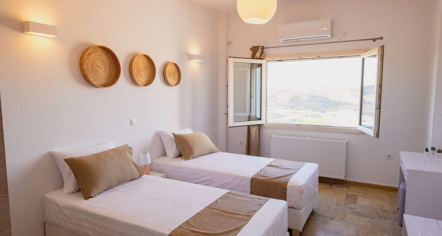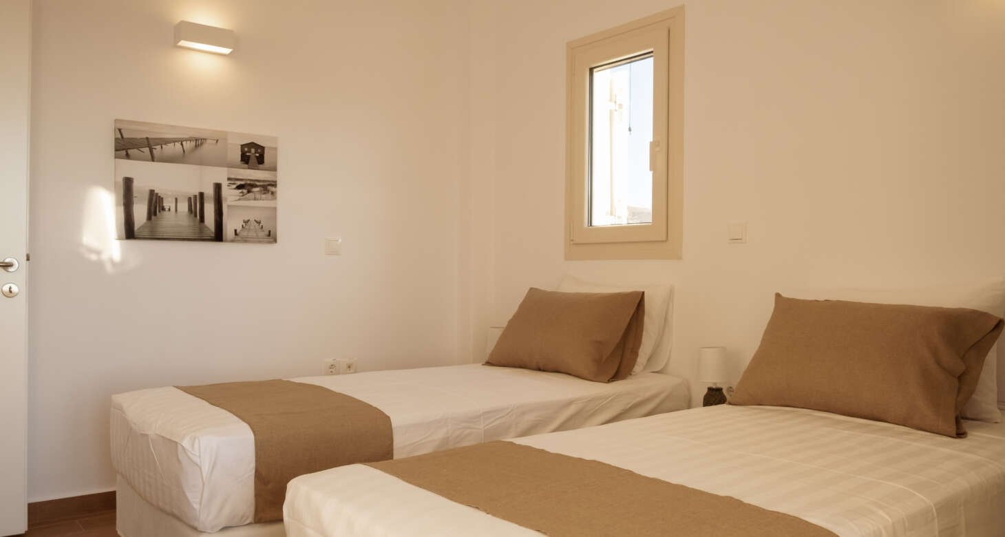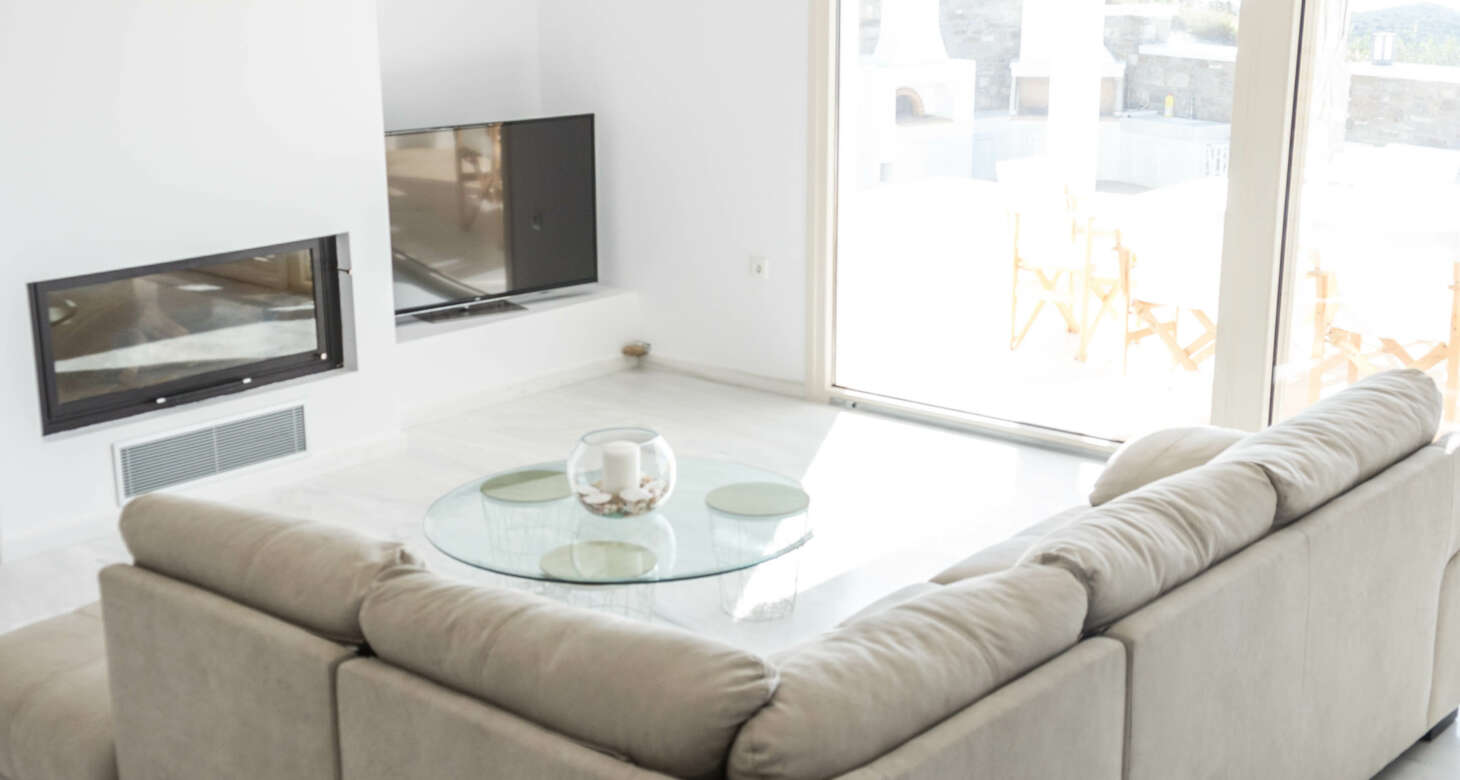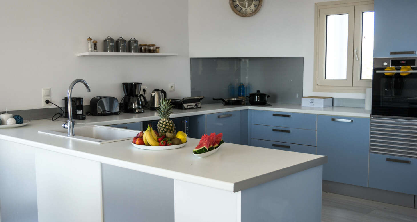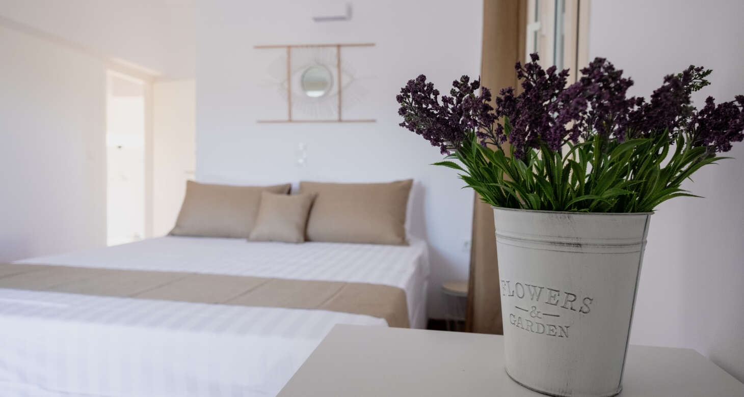 The villa boasts a captivating Cycladic geometrical design with a dominant white aesthetic, featuring high-quality materials. Striking a perfect balance between traditional and modern elements, Villa Mariza reflects the essence of Greek culture through cheerful light artwork and frescos.