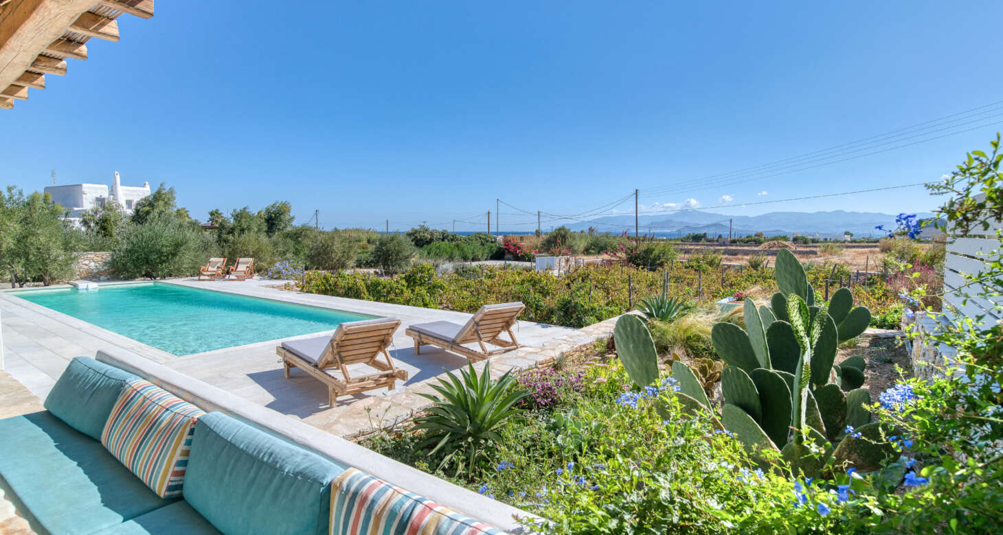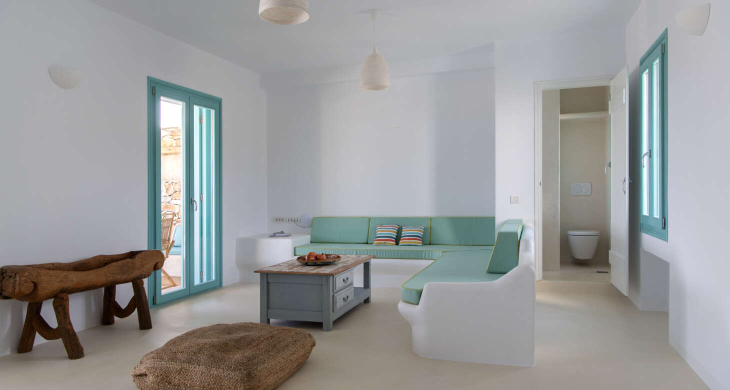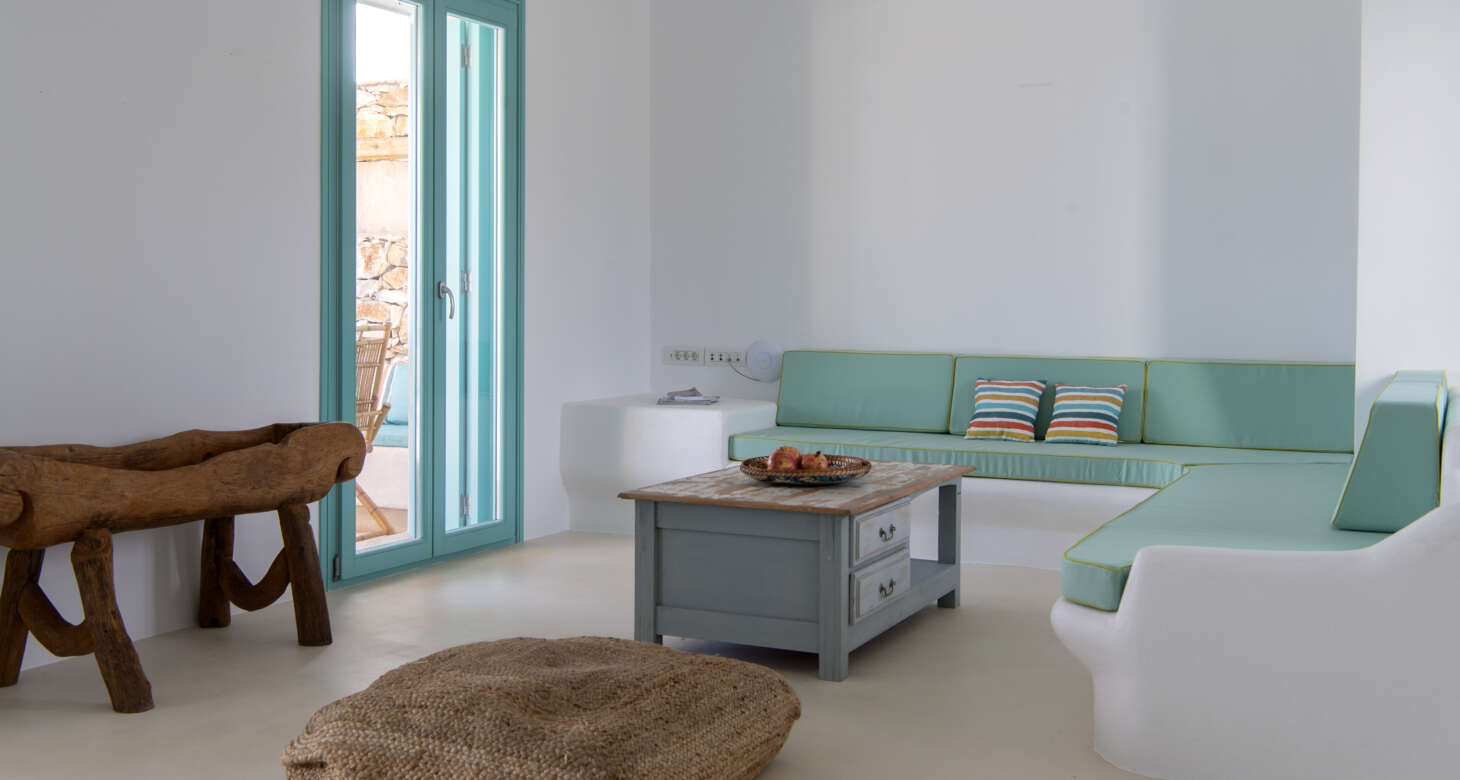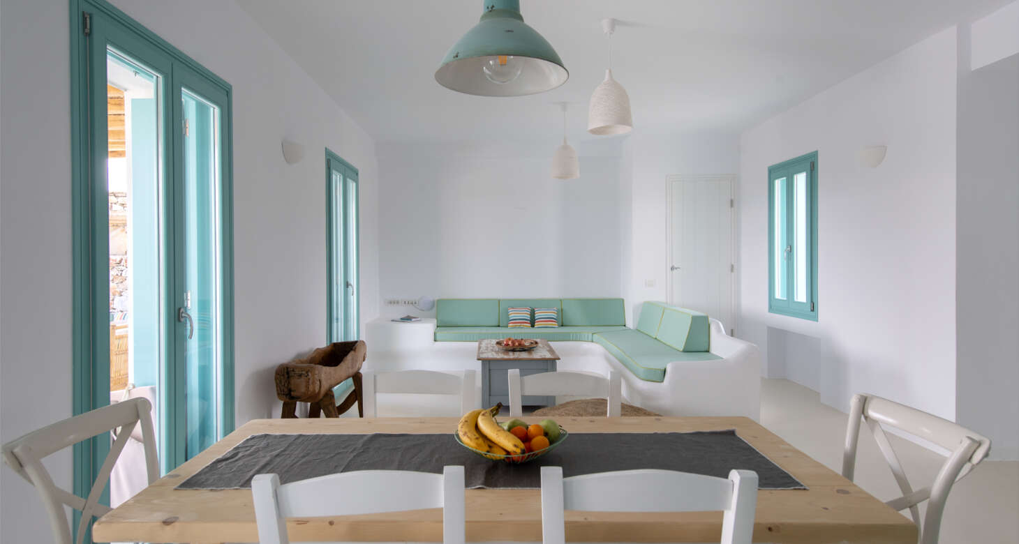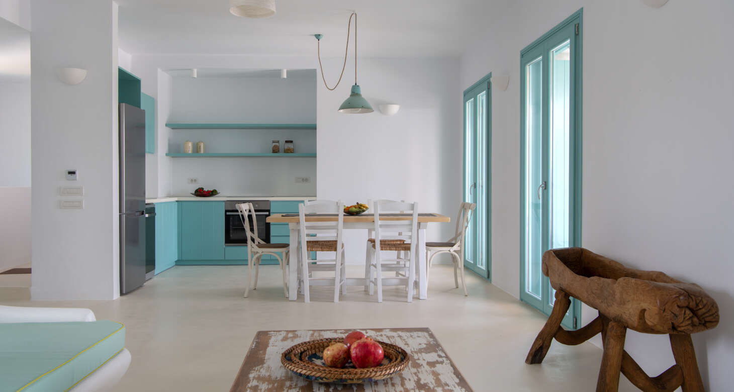 Welcome to Villa Natura II, a radiant burst of color and charm set against the backdrop of Tsoukalia’s serene landscape. This remarkable property is a vibrant symphony of mint hues, evoking a sense of playfulness and tranquility. From the fabrics to the stones, every detail has been meticulously crafted to infuse the space with the spirit of a traditional island home, while embracing a contemporary twist.