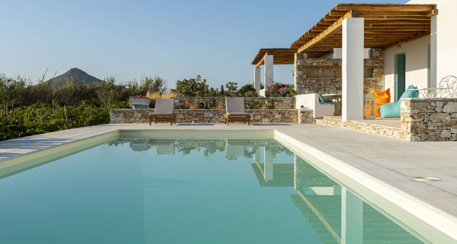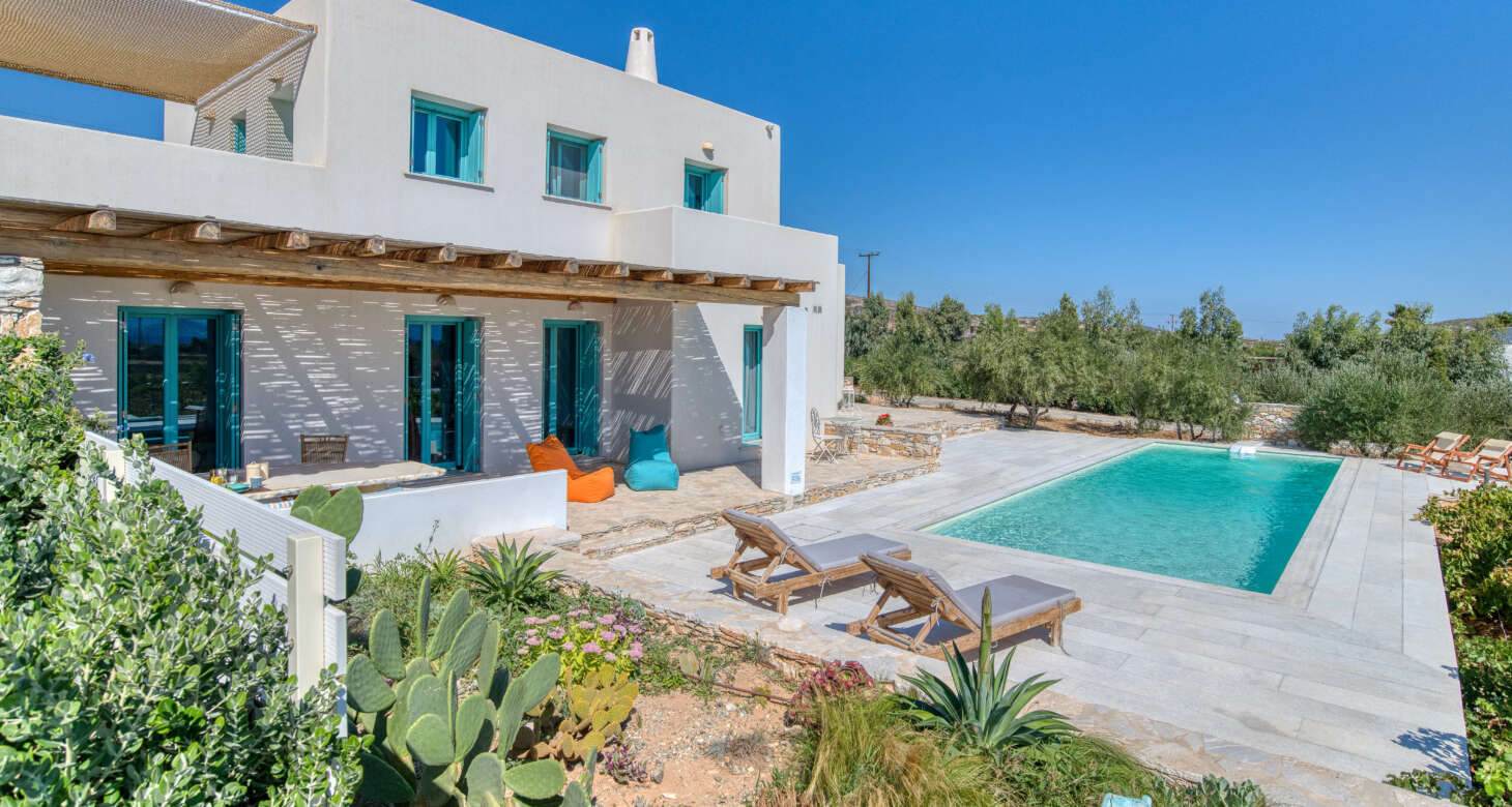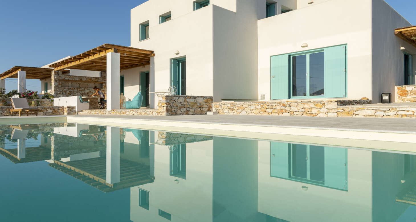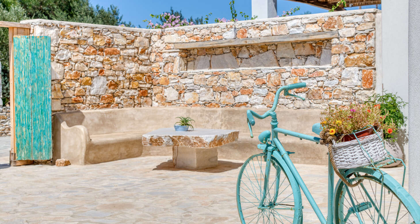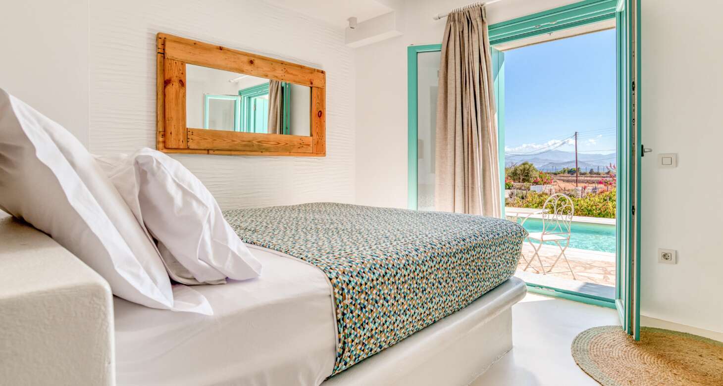 Welcome to Villa Natura II, a radiant burst of color and charm set against the backdrop of Tsoukalia’s serene landscape. This remarkable property is a vibrant symphony of mint hues, evoking a sense of playfulness and tranquility. From the fabrics to the stones, every detail has been meticulously crafted to infuse the space with the spirit of a traditional island home, while embracing a contemporary twist.