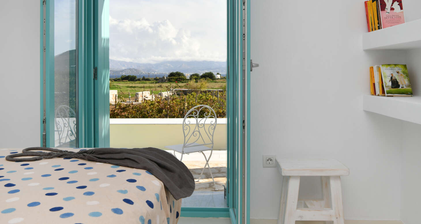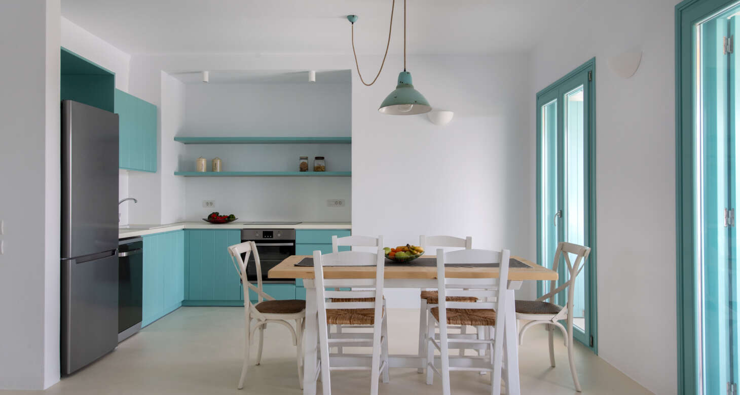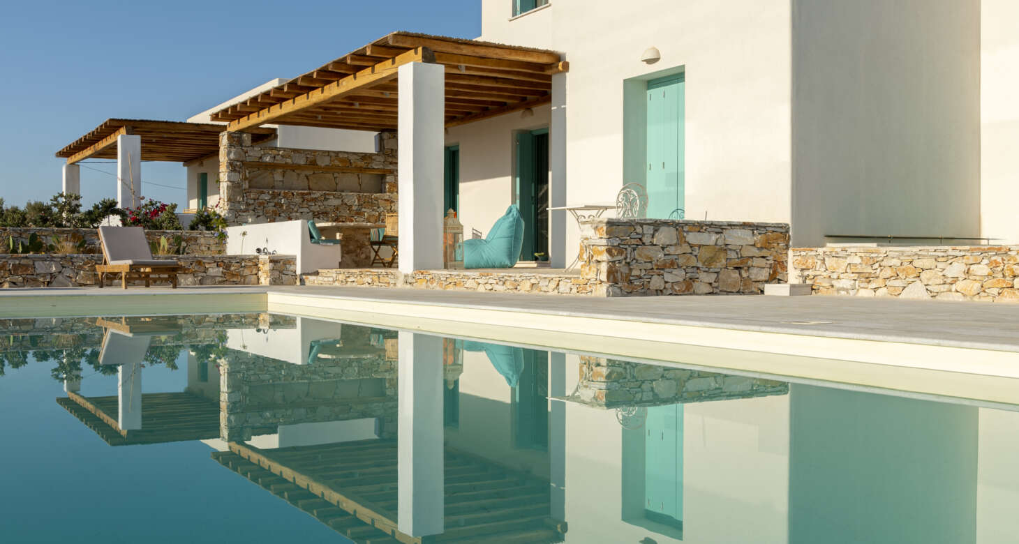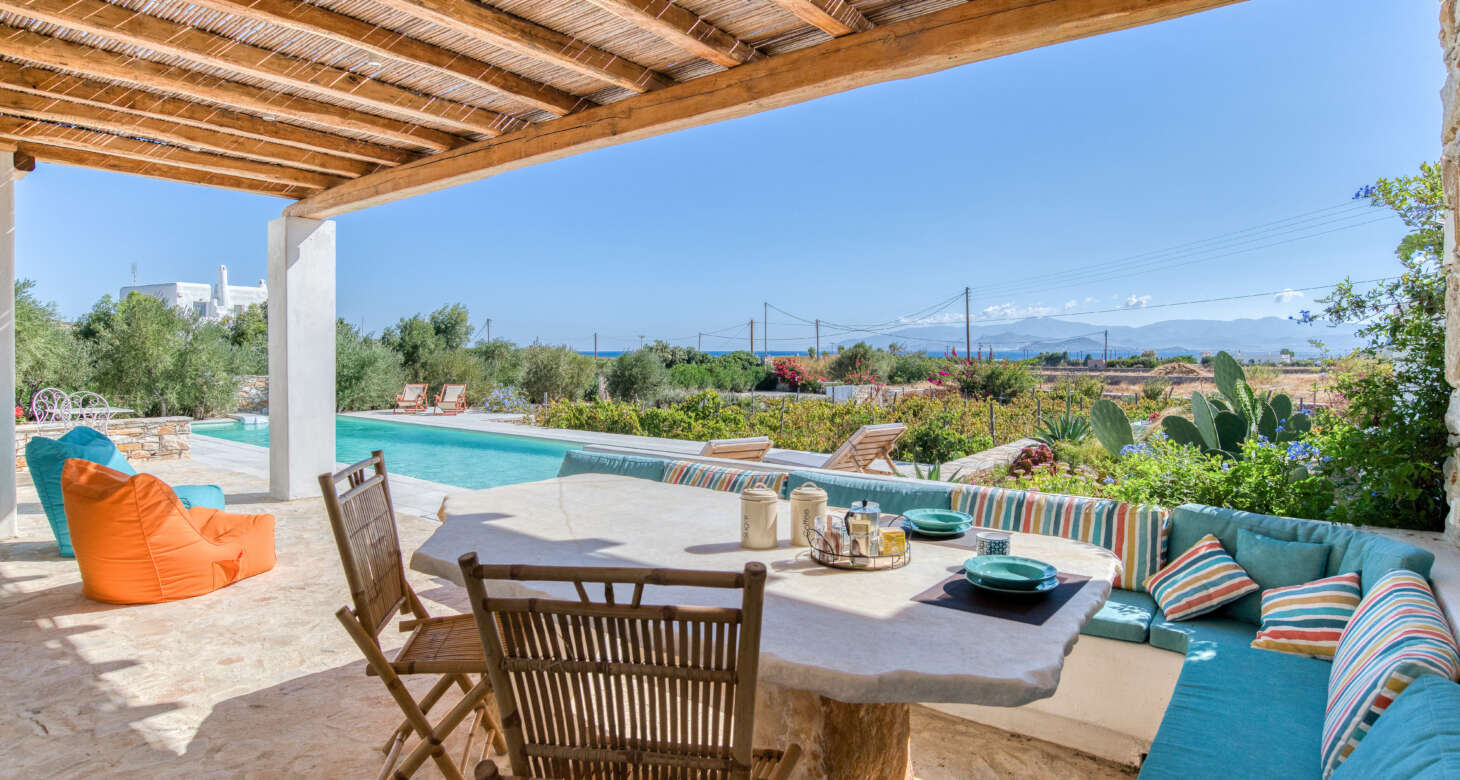 Welcome to Villa Natura II, a radiant burst of color and charm set against the backdrop of Tsoukalia’s serene landscape. This remarkable property is a vibrant symphony of mint hues, evoking a sense of playfulness and tranquility. From the fabrics to the stones, every detail has been meticulously crafted to infuse the space with the spirit of a traditional island home, while embracing a contemporary twist.