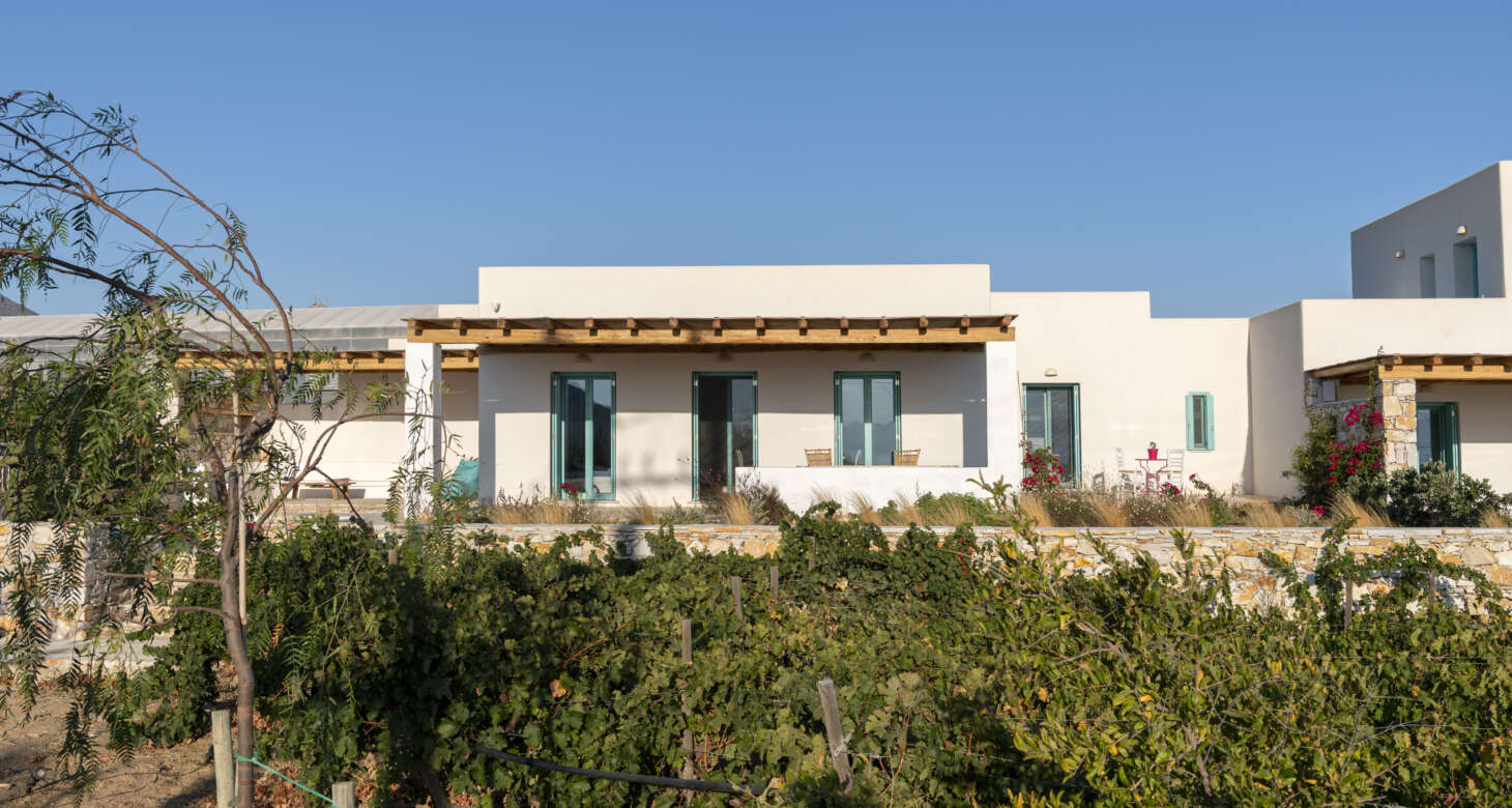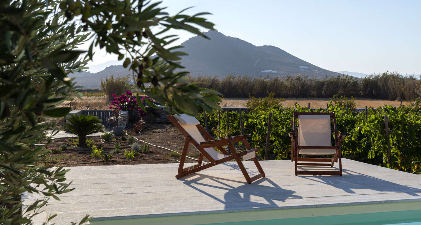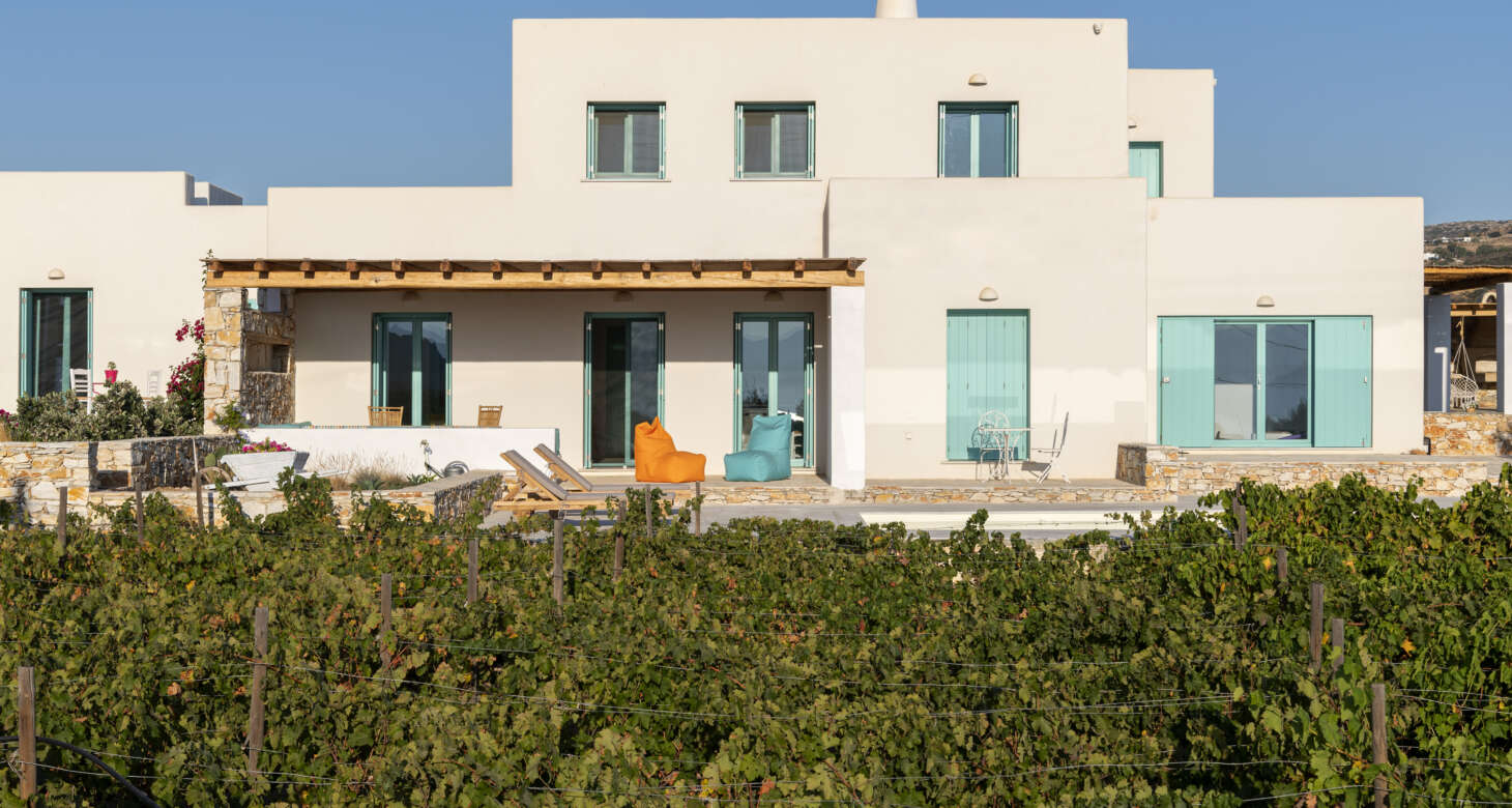 As you step outside, a private haven of relaxation unfolds before you. The property boasts a private pool surrounded by a lush tapestry of flowers and trees, creating an idyllic setting for unwinding and soaking up the sun’s embrace. The view of the vineyard and the sea adds a touch of enchantment to the scene, creating a perfect harmony between nature and leisure.