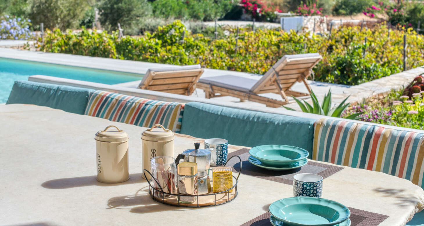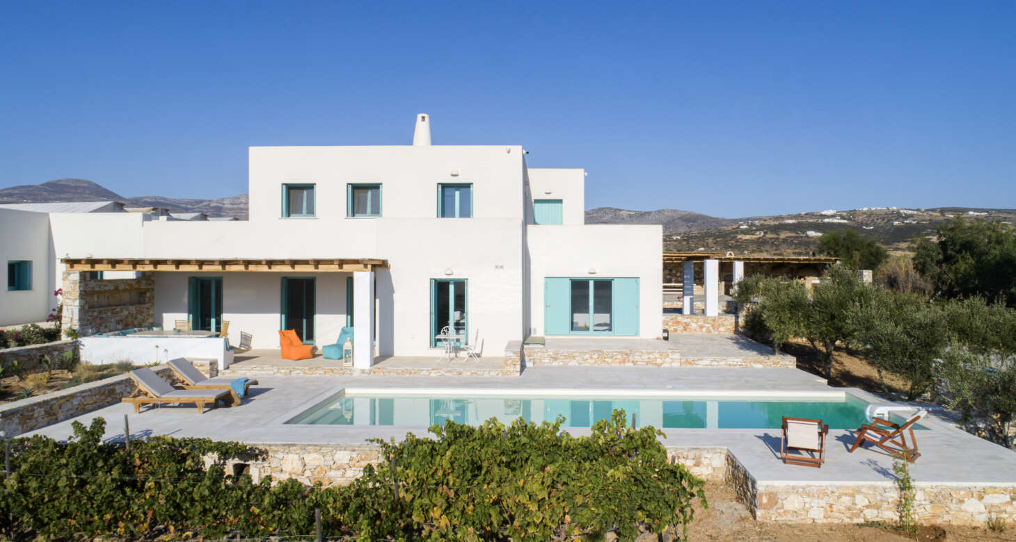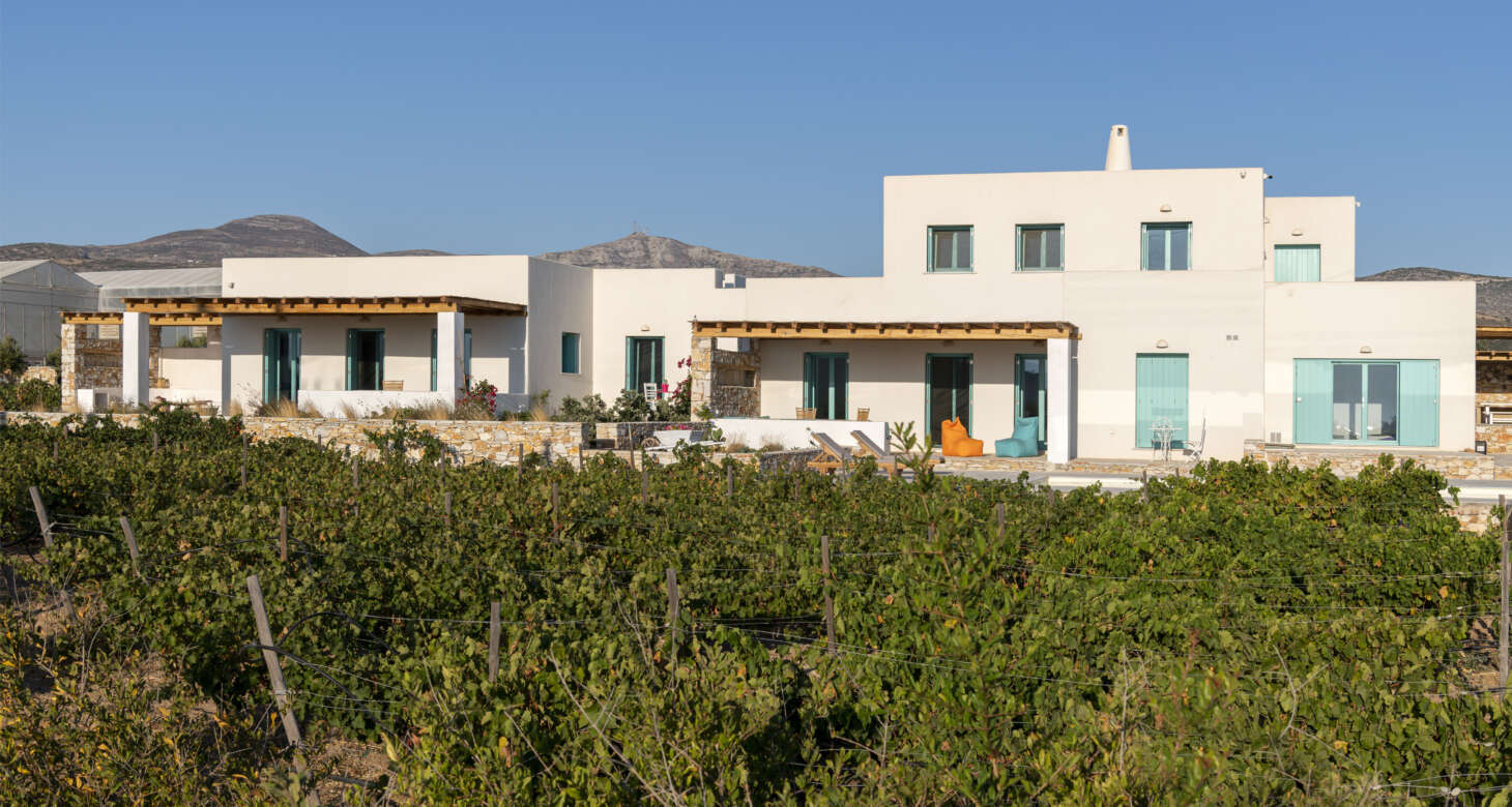 As you step outside, a private haven of relaxation unfolds before you. The property boasts a private pool surrounded by a lush tapestry of flowers and trees, creating an idyllic setting for unwinding and soaking up the sun’s embrace. The view of the vineyard and the sea adds a touch of enchantment to the scene, creating a perfect harmony between nature and leisure.