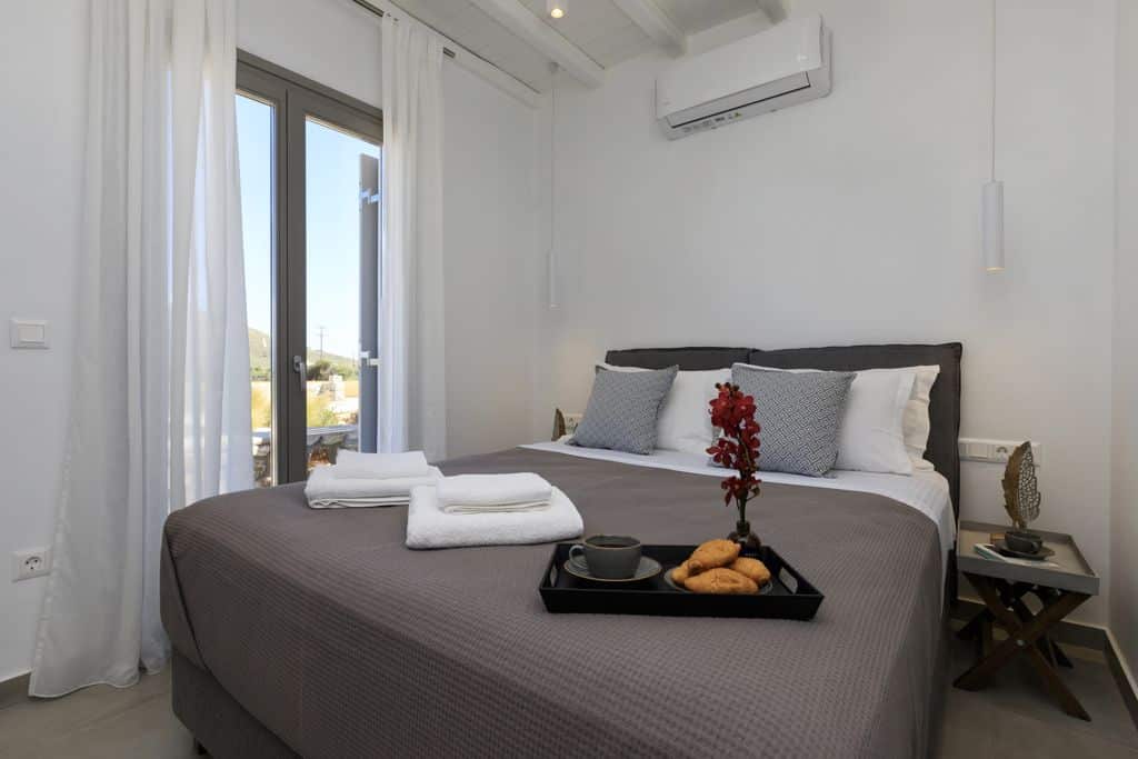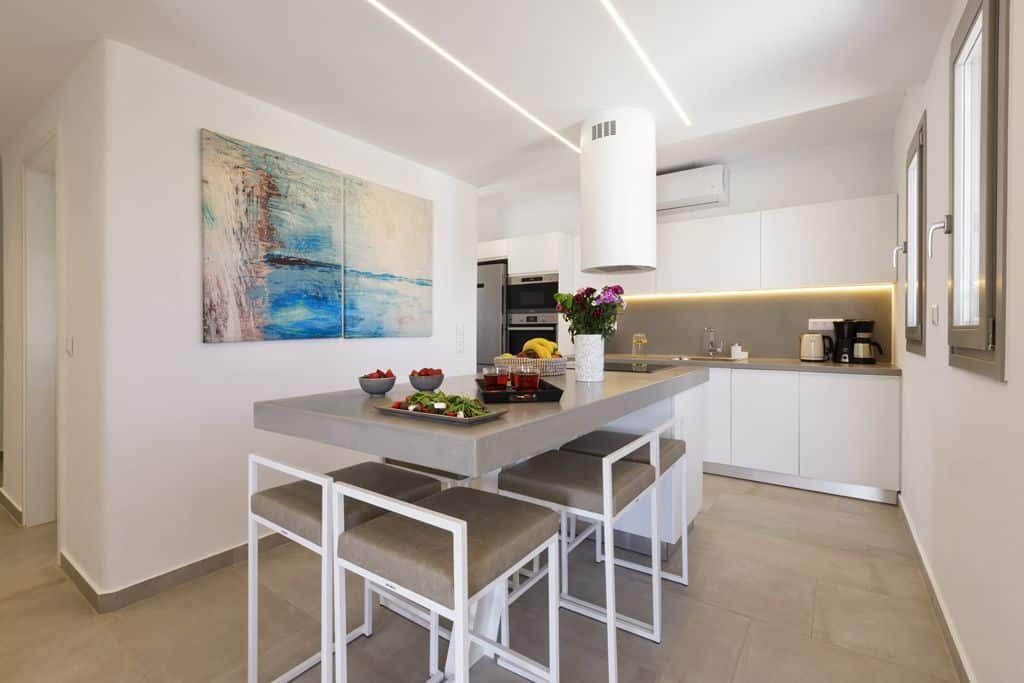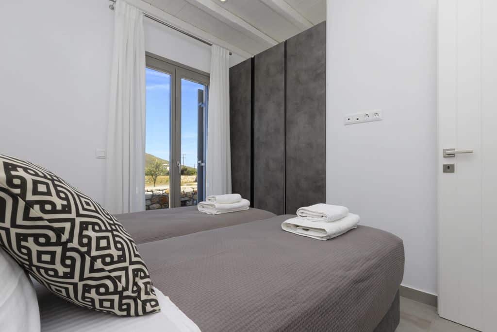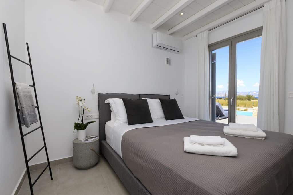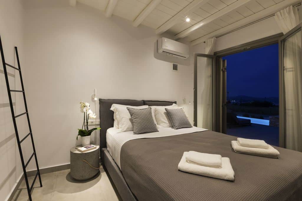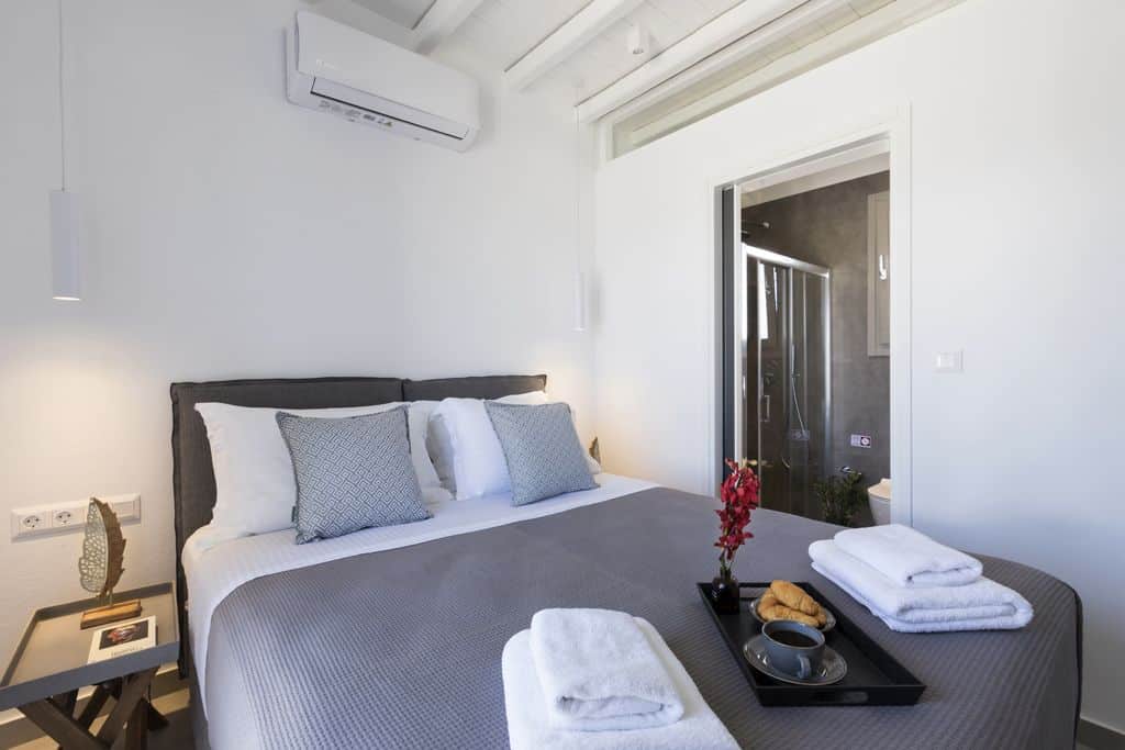 Inside, the villa follows a clean and modern Cycladic style. The open-plan living room and fully equipped kitchen create a bright and welcoming environment, enhanced by natural light and uninterrupted views of the Aegean. The interior spaces are designed to feel relaxed yet refined, offering everything needed for a comfortable stay.