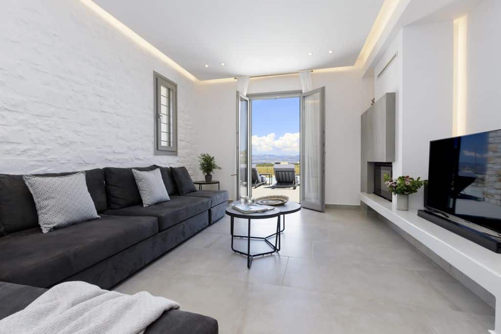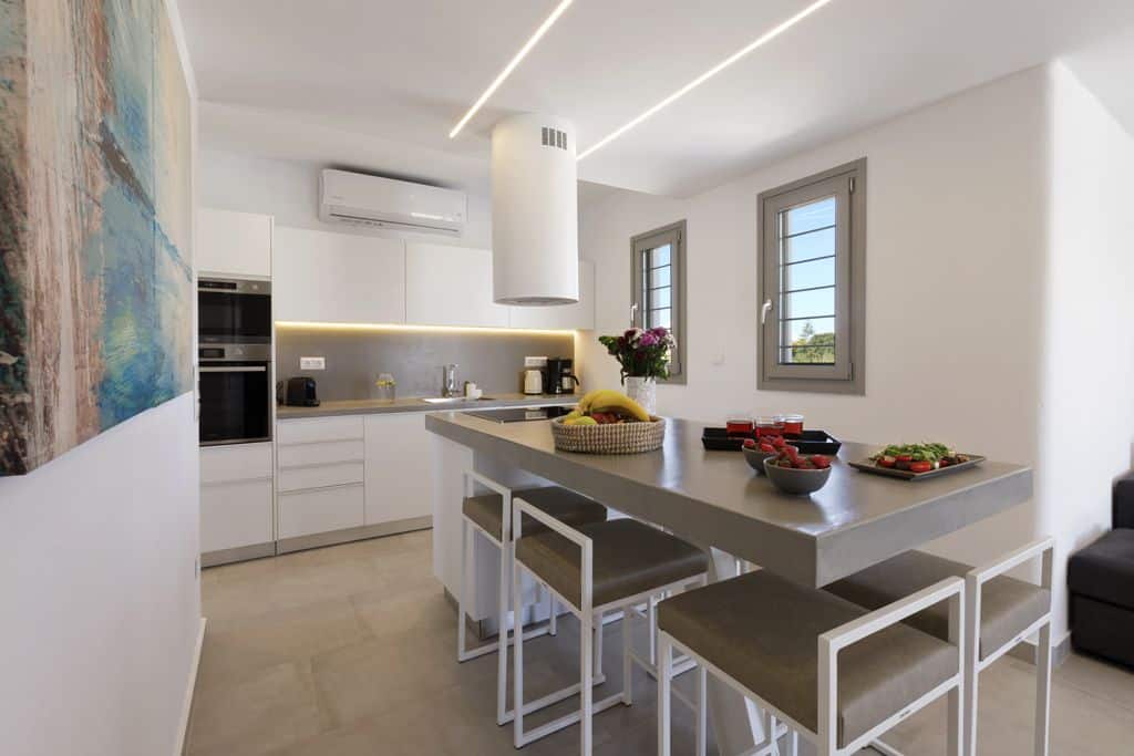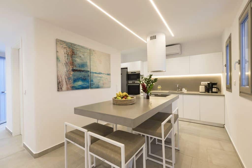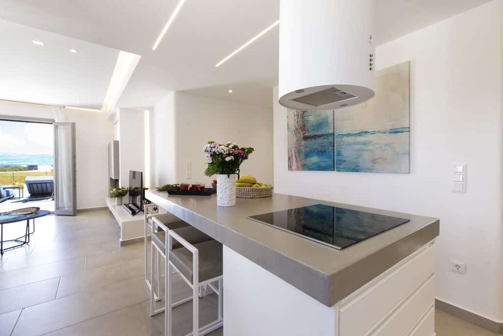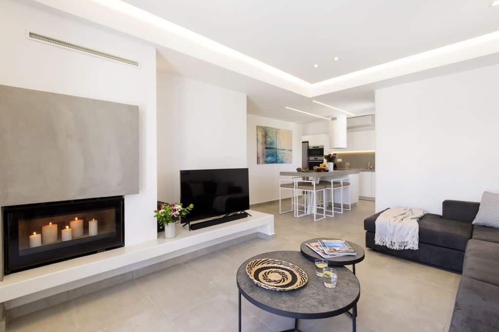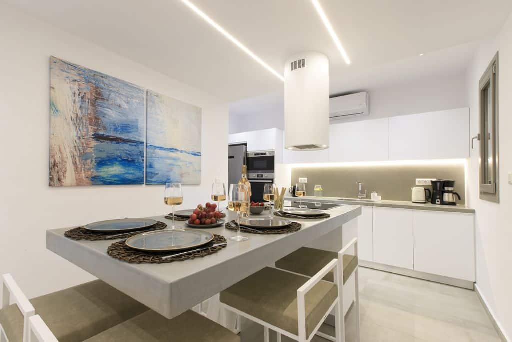 Inside, the villa follows a clean and modern Cycladic style. The open-plan living room and fully equipped kitchen create a bright and welcoming environment, enhanced by natural light and uninterrupted views of the Aegean. The interior spaces are designed to feel relaxed yet refined, offering everything needed for a comfortable stay.