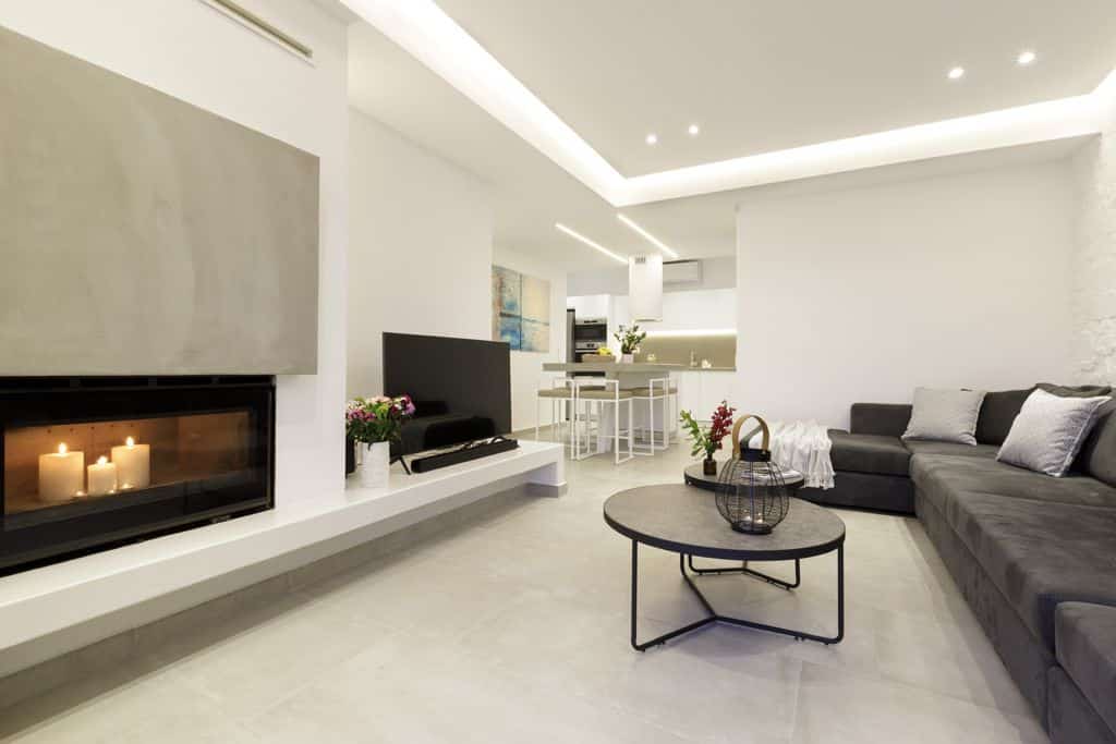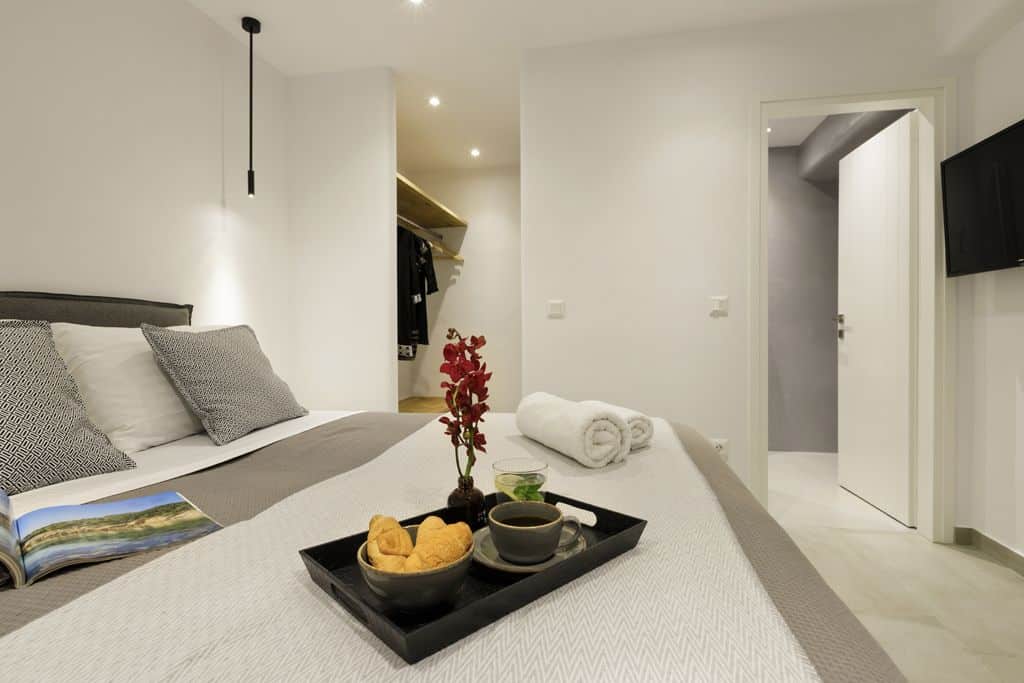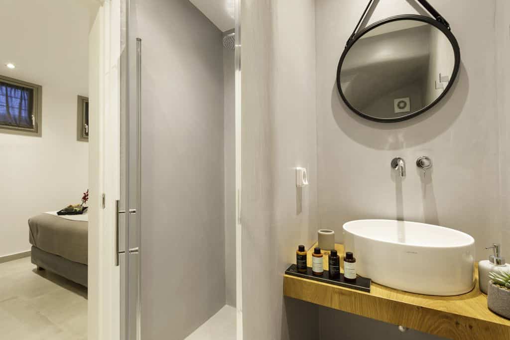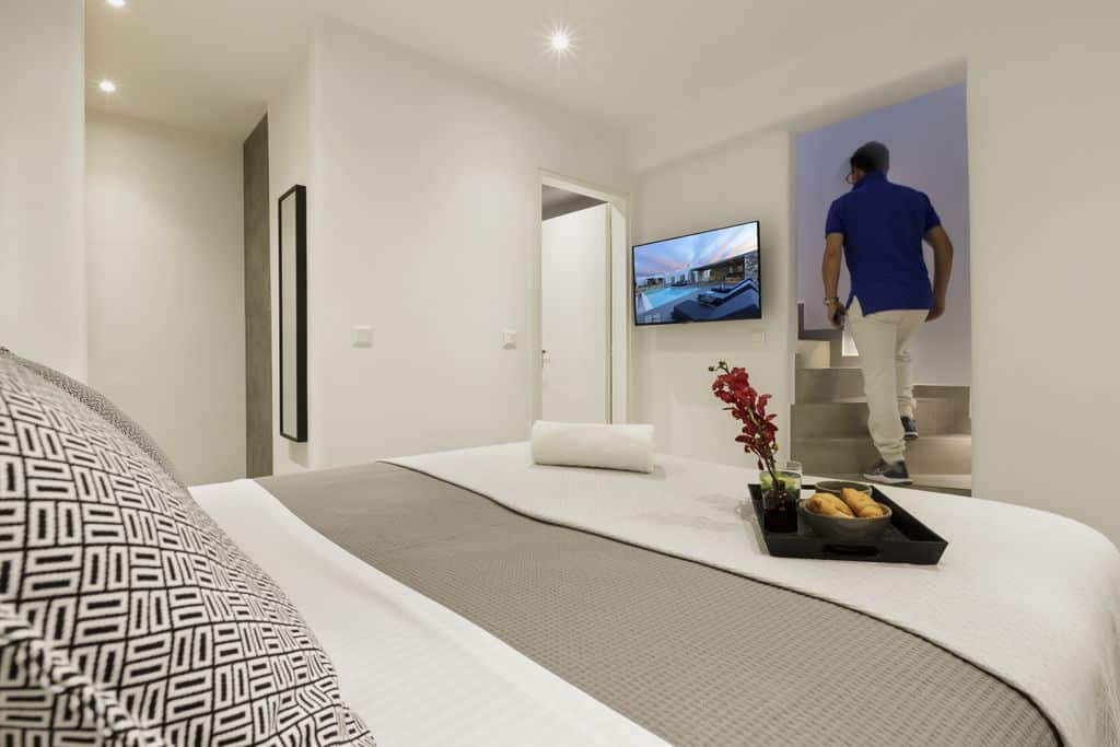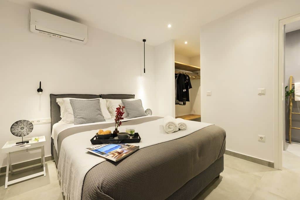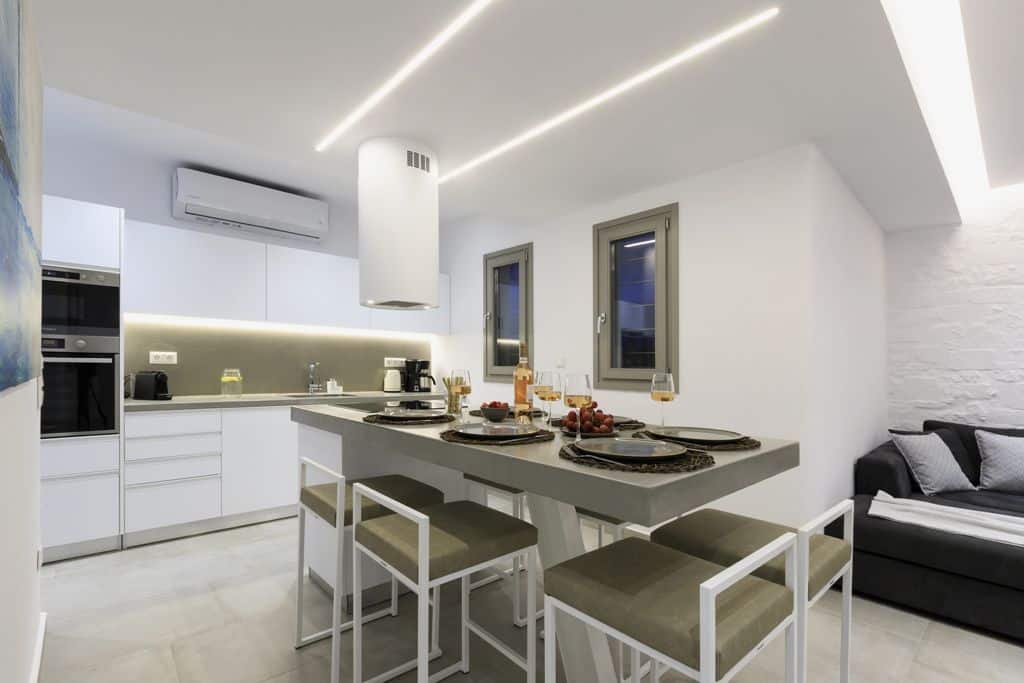 Inside, the villa follows a clean and modern Cycladic style. The open-plan living room and fully equipped kitchen create a bright and welcoming environment, enhanced by natural light and uninterrupted views of the Aegean. The interior spaces are designed to feel relaxed yet refined, offering everything needed for a comfortable stay.