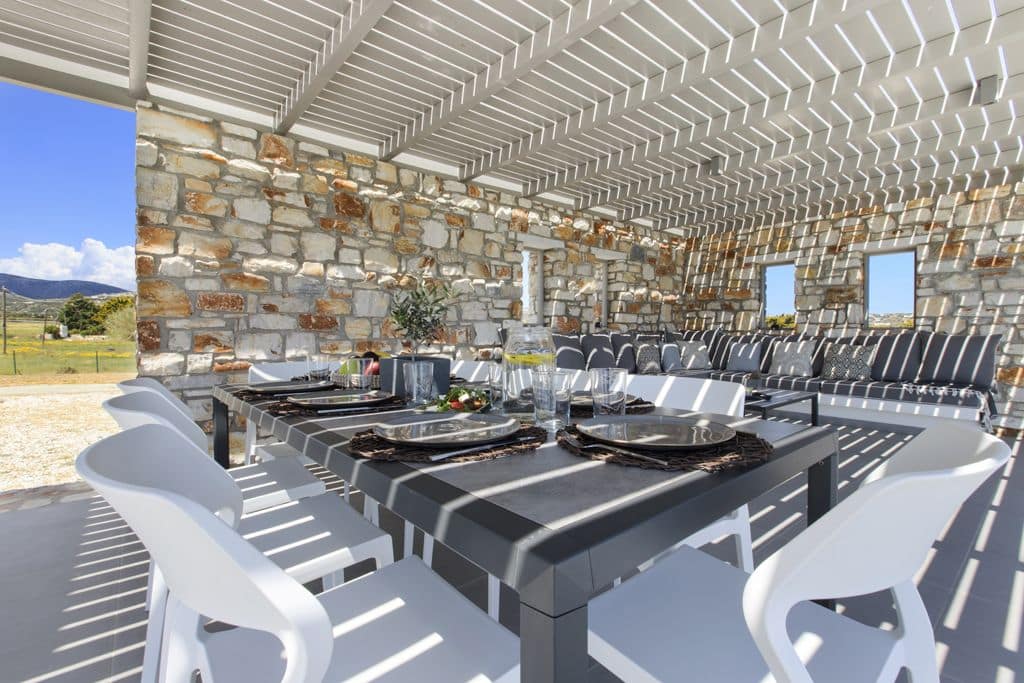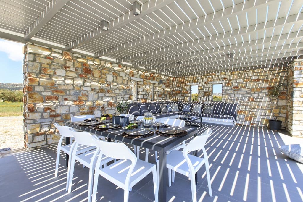 The outdoor area is where the villa truly stands out. A spacious terrace with a pergola includes built-in seating and a large dining area, ideal for long, relaxed meals. The private swimming pool provides a peaceful setting to unwind while enjoying the surrounding landscape and sea views.