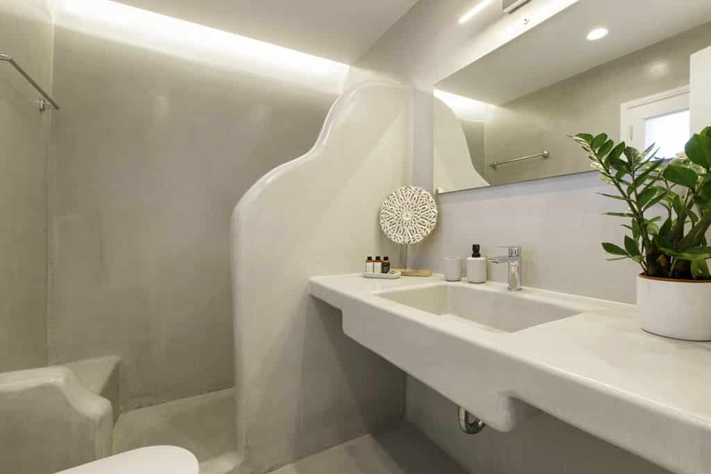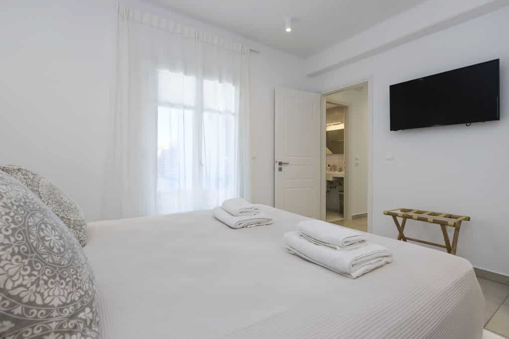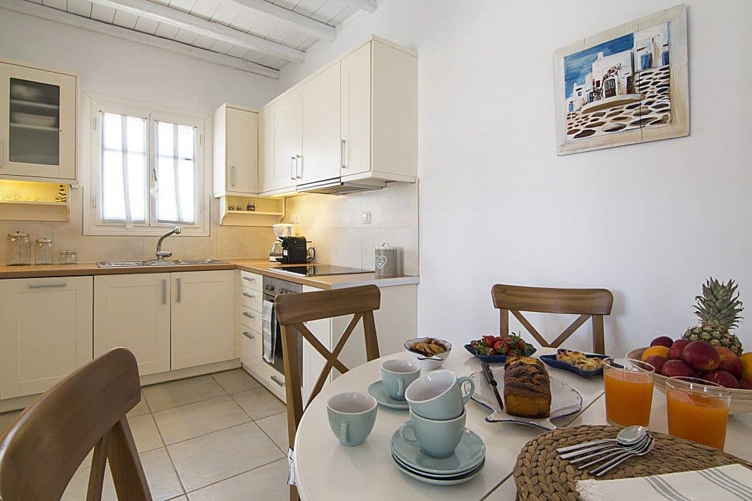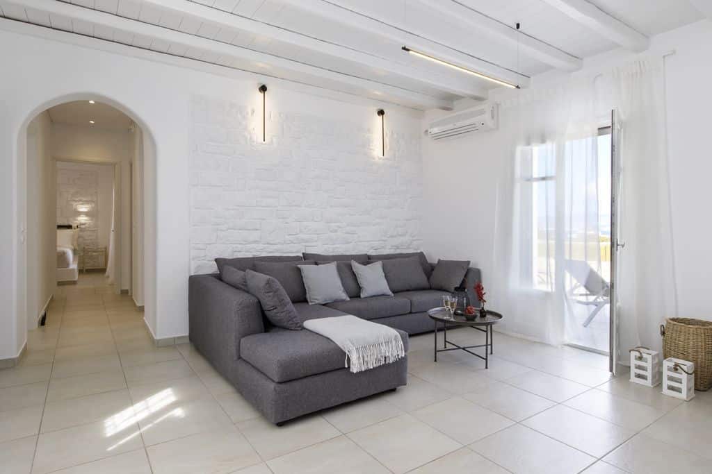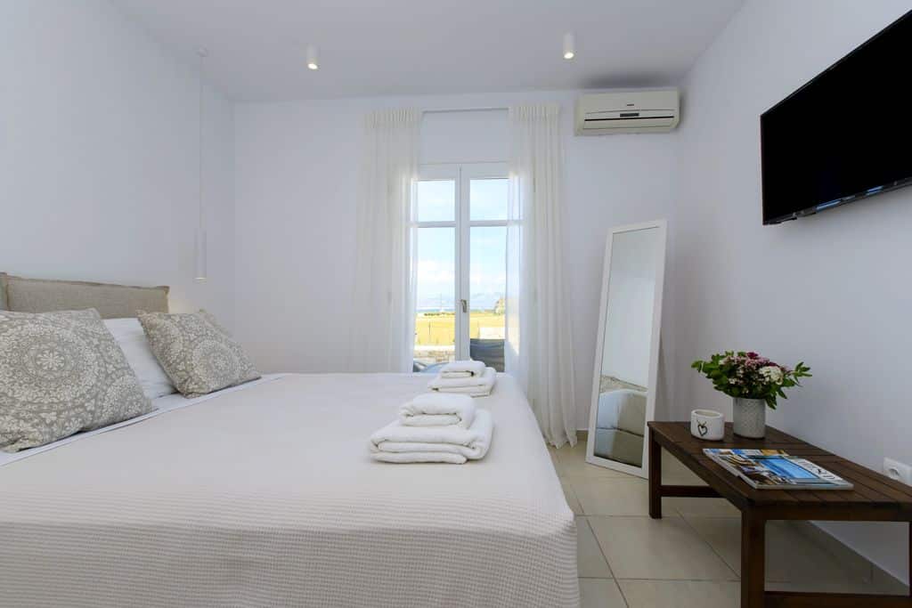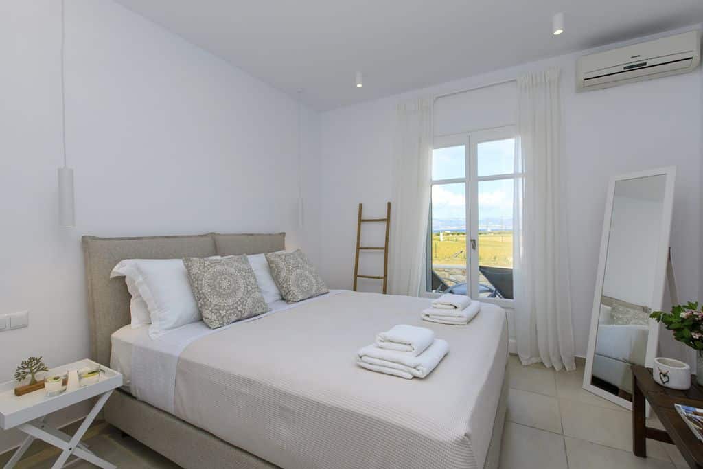 Inside, the villa reflects a clean and modern Cycladic aesthetic. The open-plan living room and fully equipped kitchen form a bright and welcoming space, enhanced by natural light and expansive sea views. Modern amenities such as air conditioning, Wi-Fi, and essential appliances ensure a comfortable and effortless stay.
