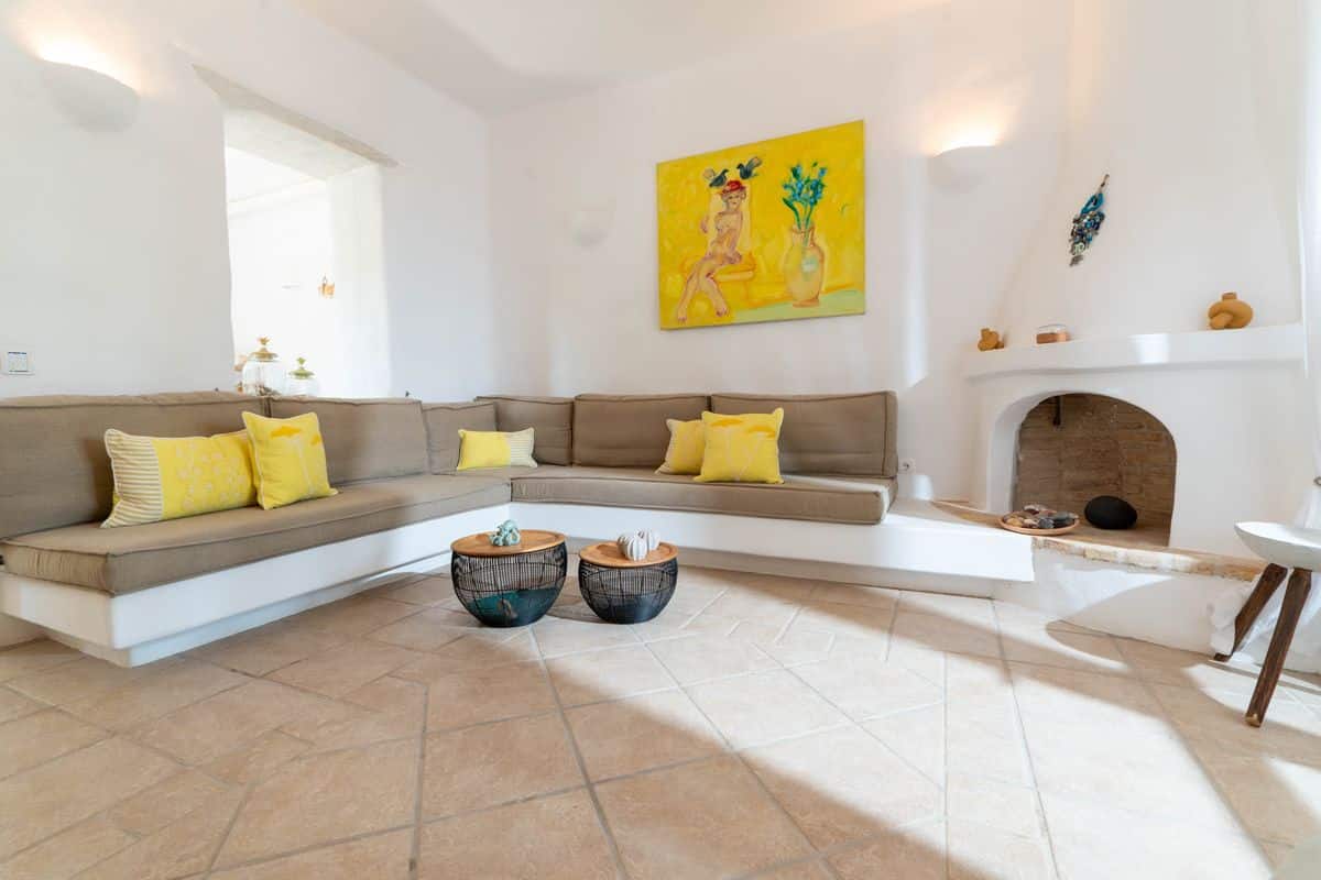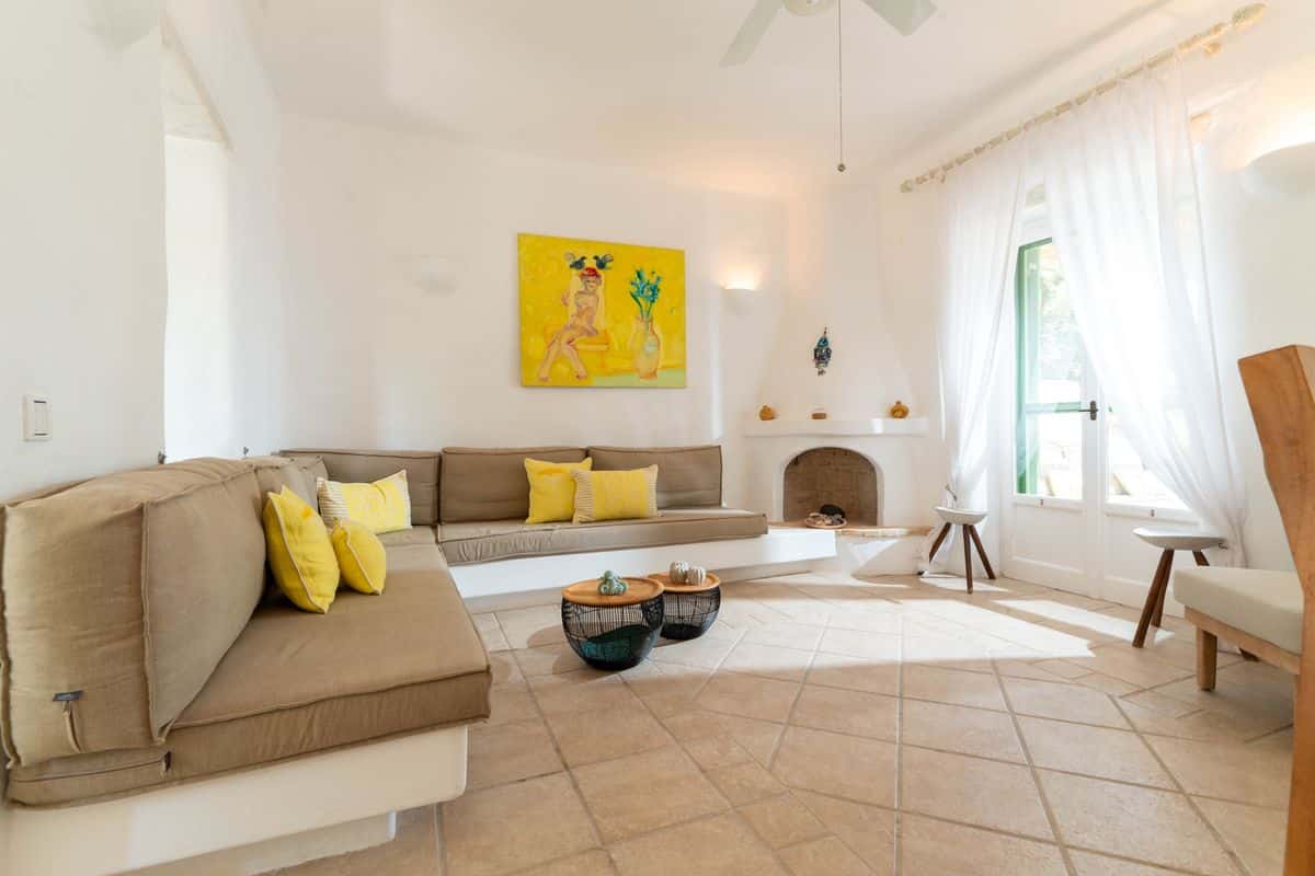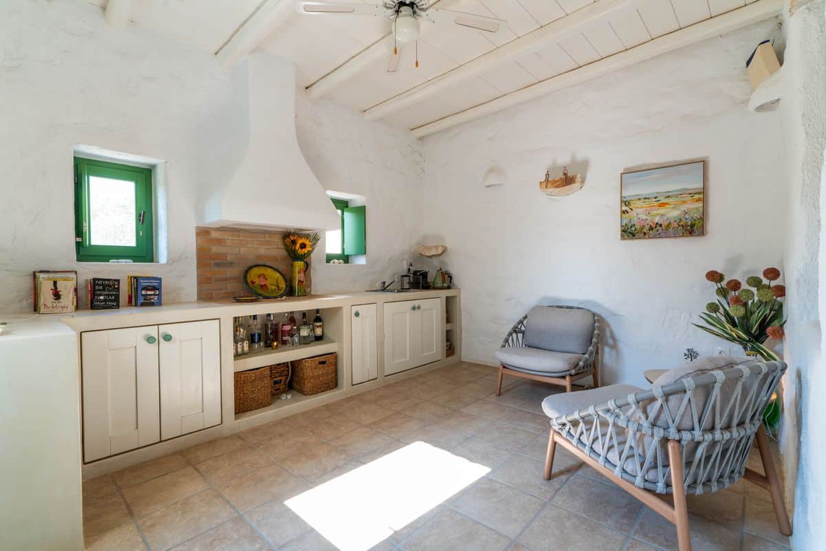 Inside, the villa features a cozy living space with a fireplace, creating a warm atmosphere for both summer evenings and cooler months. A fully equipped kitchen allows for easy meal preparation, while air conditioning and heating throughout ensure year-round comfort. Thoughtful details such as WiFi and a solar hot water system add convenience to the stay.
