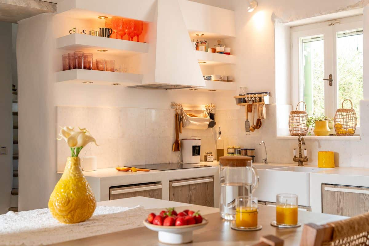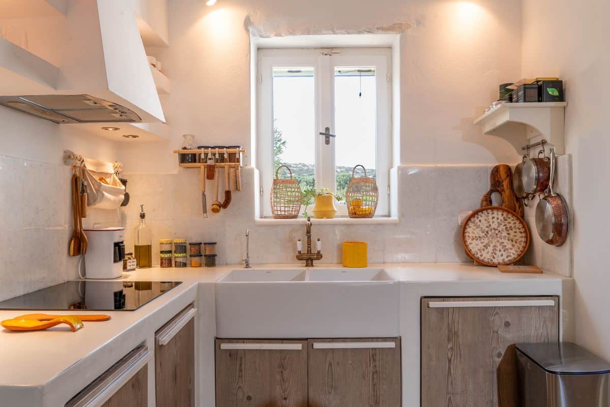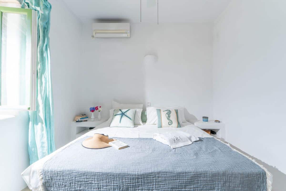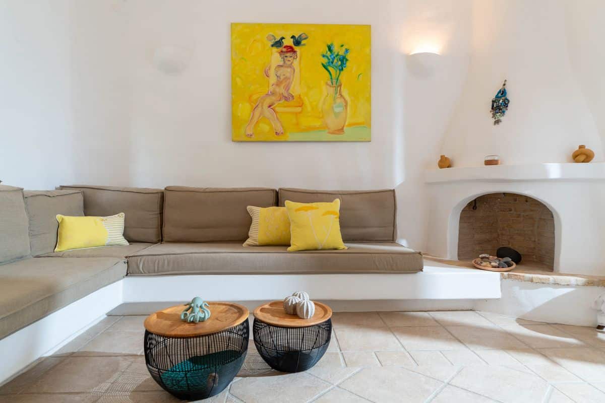 Inside, the villa features a cozy living space with a fireplace, creating a warm atmosphere for both summer evenings and cooler months. A fully equipped kitchen allows for easy meal preparation, while air conditioning and heating throughout ensure year-round comfort. Thoughtful details such as WiFi and a solar hot water system add convenience to the stay.