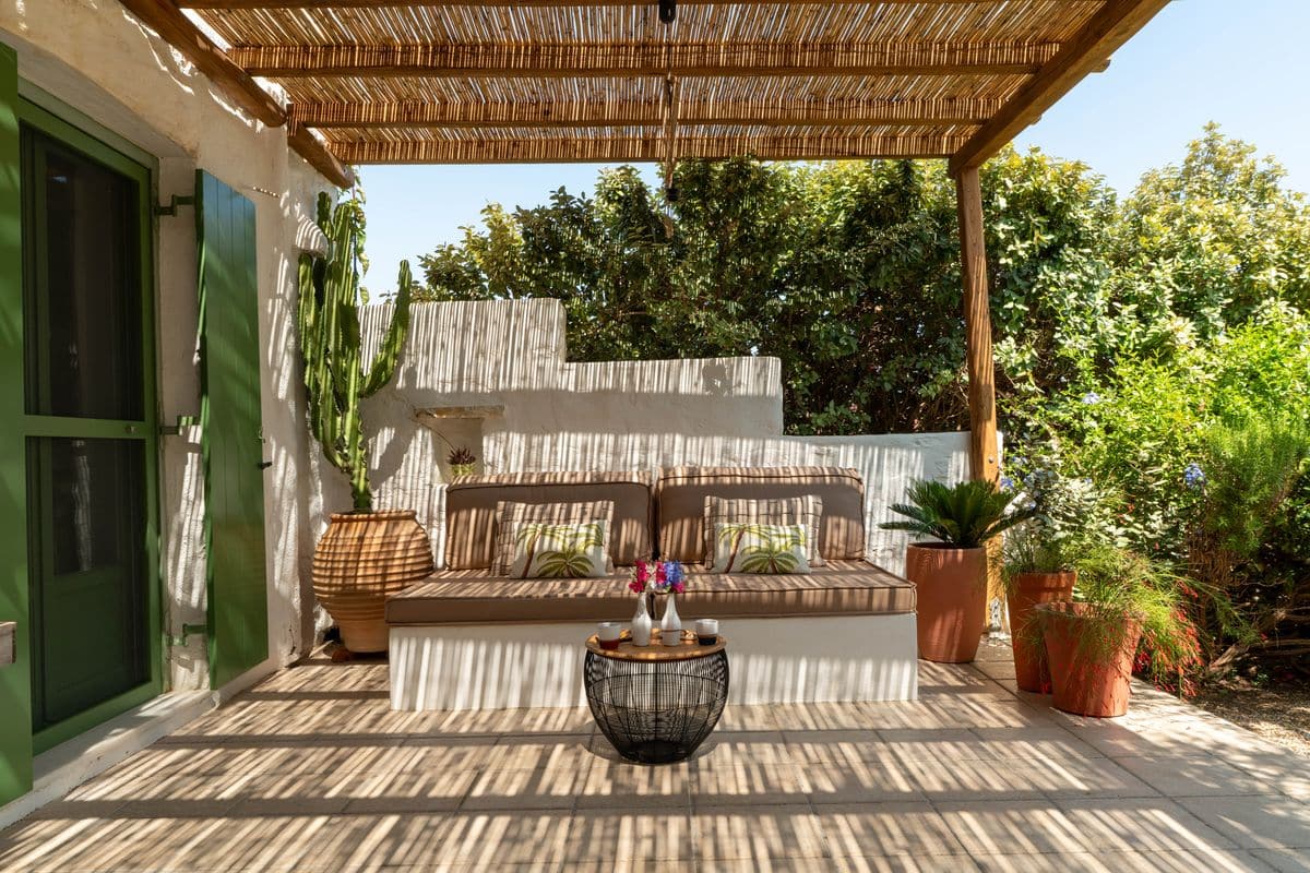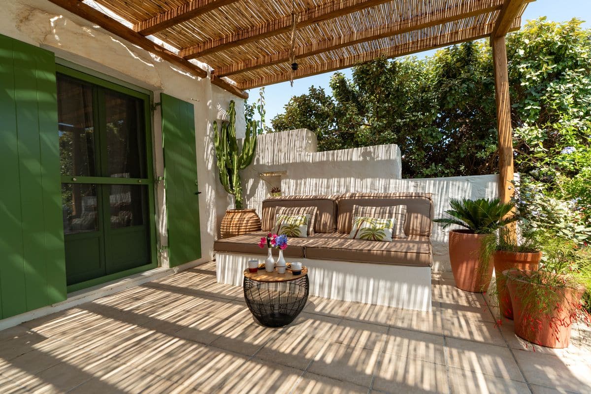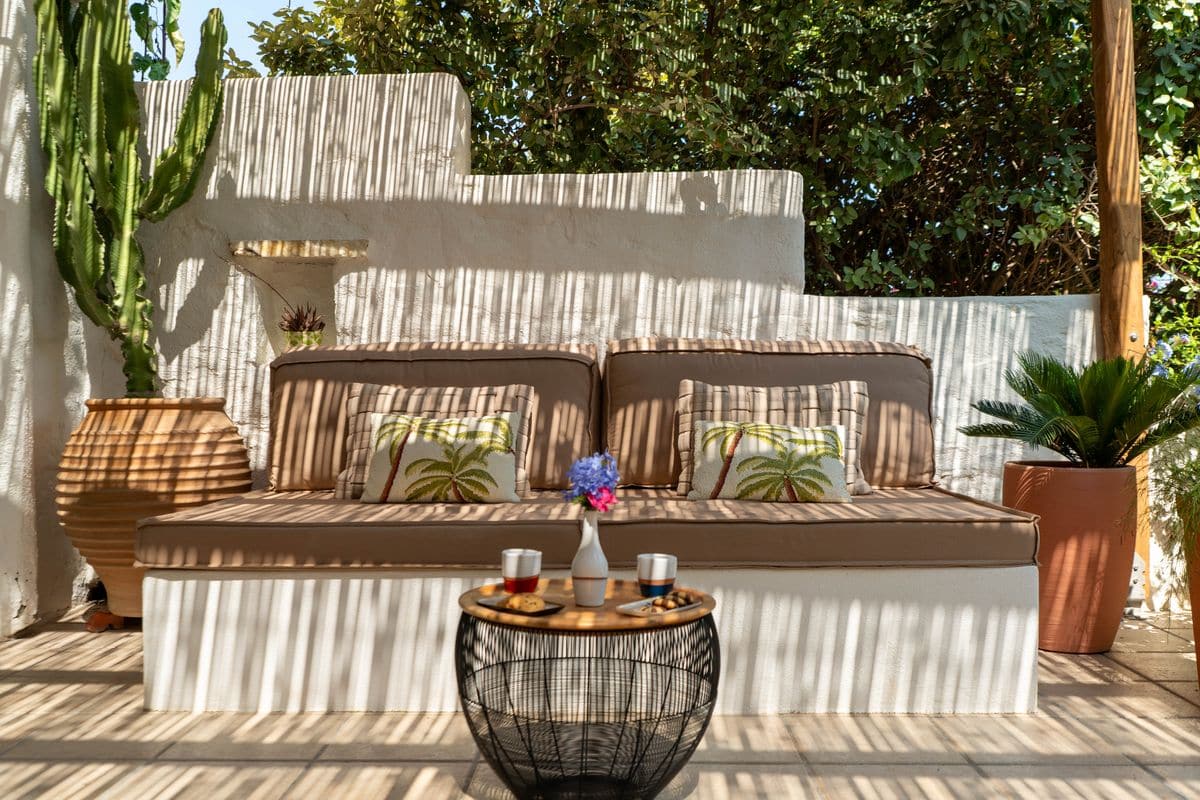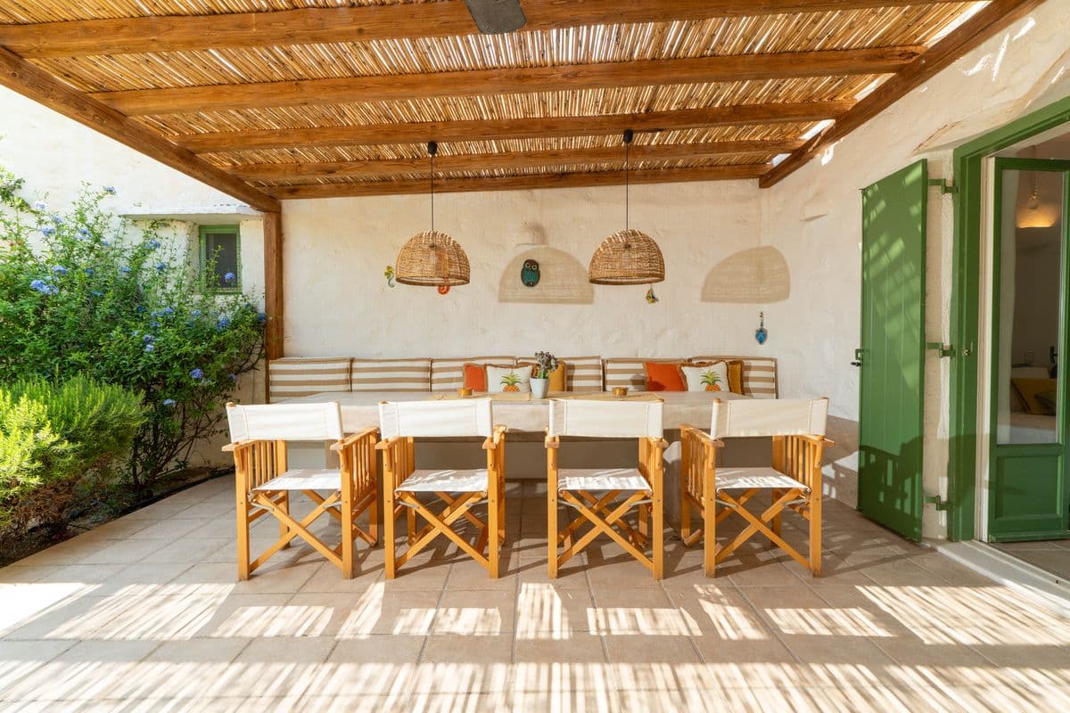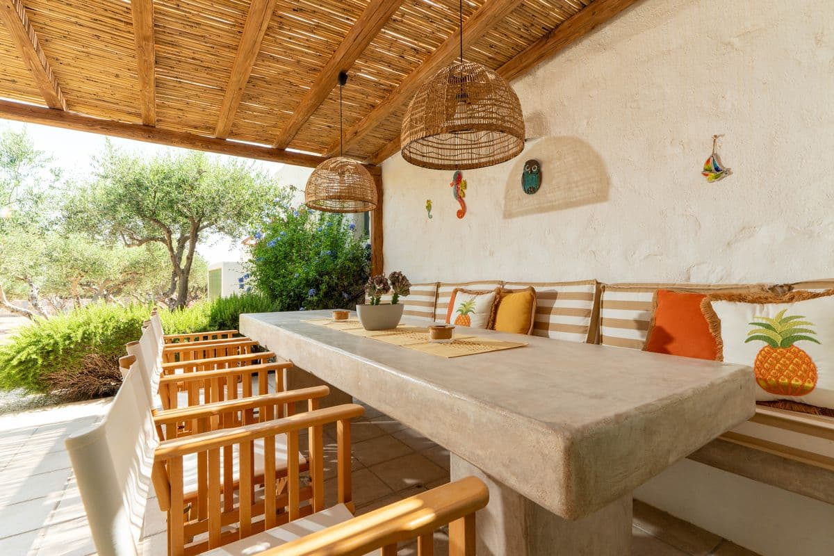 The outdoor areas are designed for enjoying long, laid-back days. A shaded lounge and dining area accommodates up to ten guests, making it ideal for entertaining or relaxed meals. Comfortable patio furniture and sunbeds complete the setting, offering plenty of space to unwind under the open sky.