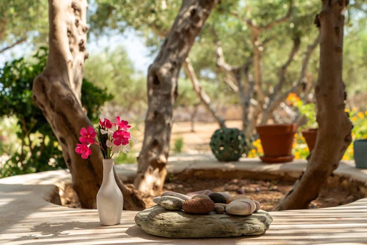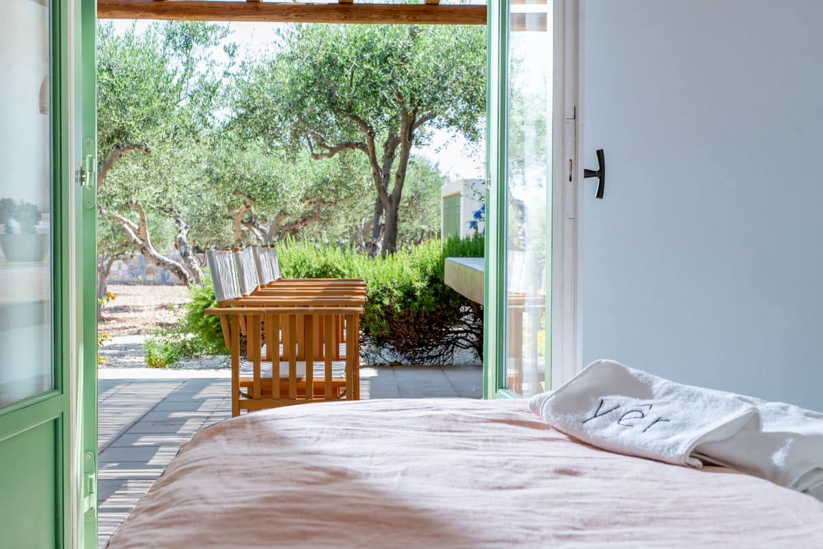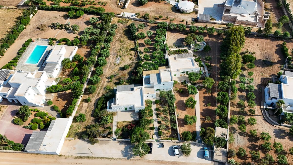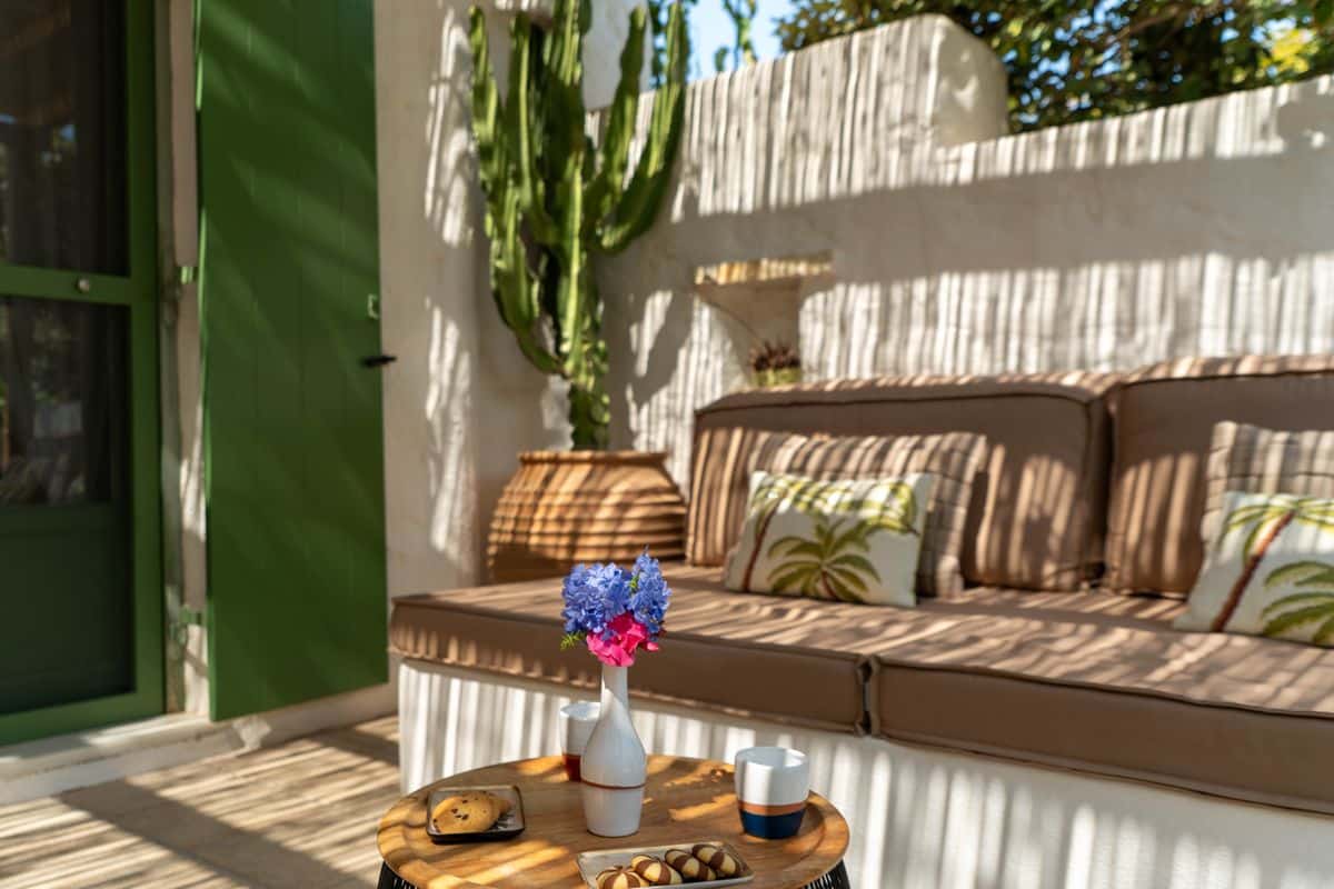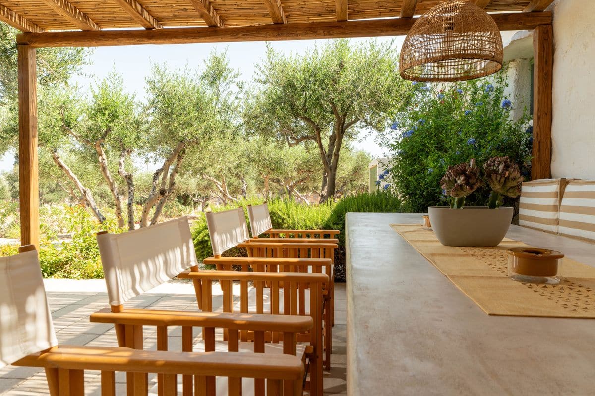 The outdoor areas are designed for enjoying long, laid-back days. A shaded lounge and dining area accommodates up to ten guests, making it ideal for entertaining or relaxed meals. Comfortable patio furniture and sunbeds complete the setting, offering plenty of space to unwind under the open sky.