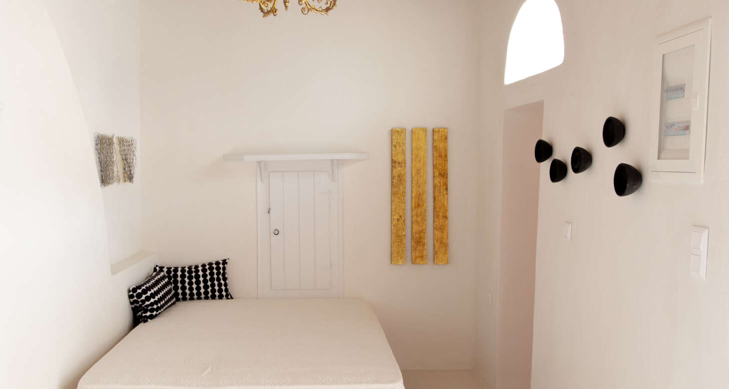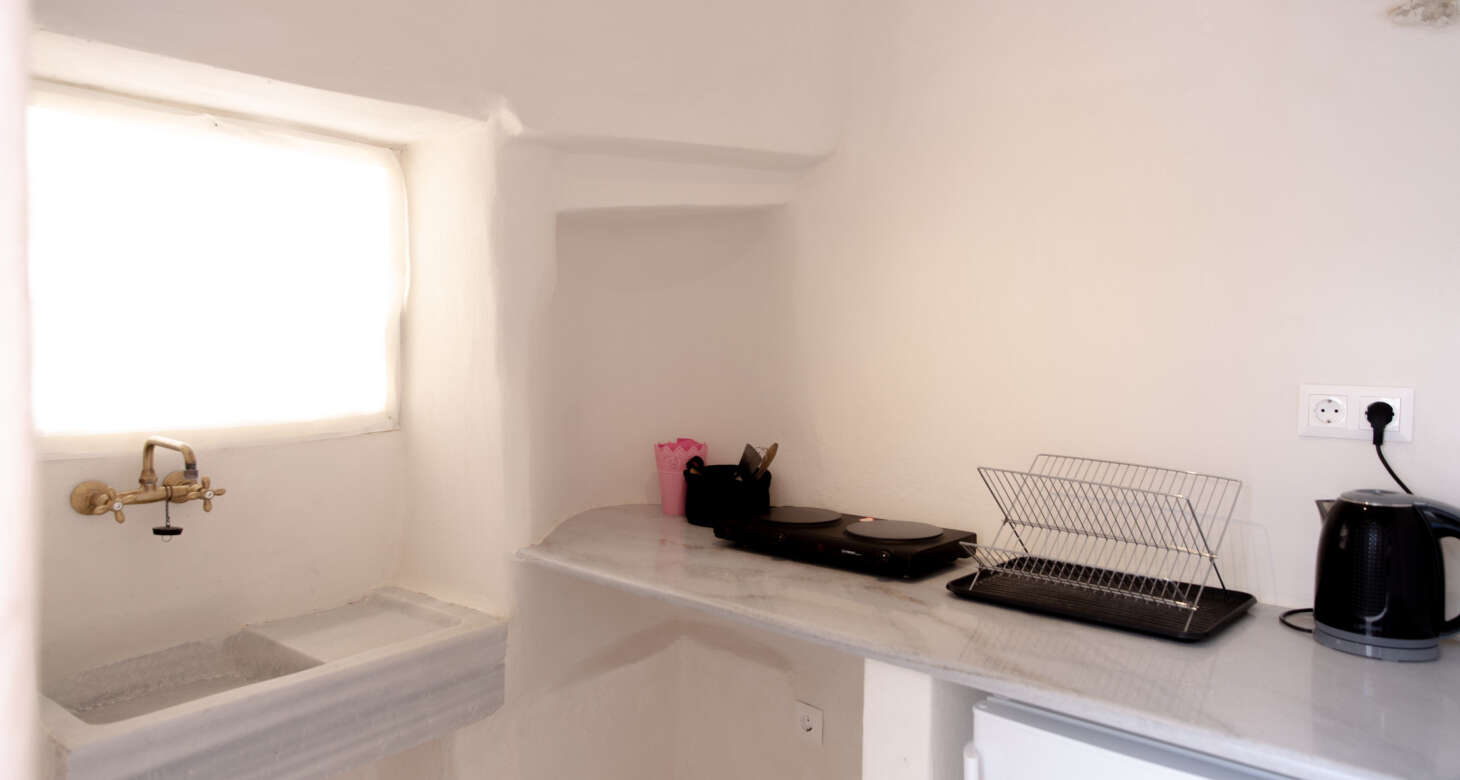 The second house, affectionately known as the “pink house,” offers an open floor plan that exudes simplicity and tranquility. Here, you’ll find a comfortable double bed, a cozy built-in sofa, and a dining table where you can savor delicious meals. The bathroom embraces minimalist design, enhanced by white cement mortar finishes. Just outside the pink house, a small kitchen awaits, providing convenience and functionality for your culinary needs. One of the highlights of the property is the charming porch, opposite the other house, which creates a friendly and inviting atmosphere reminiscent of a close-knit community. It’s the perfect spot for friends to gather, chat, and enjoy a glass of wine, while admiring the owner’s unique art pieces that adorn both houses.